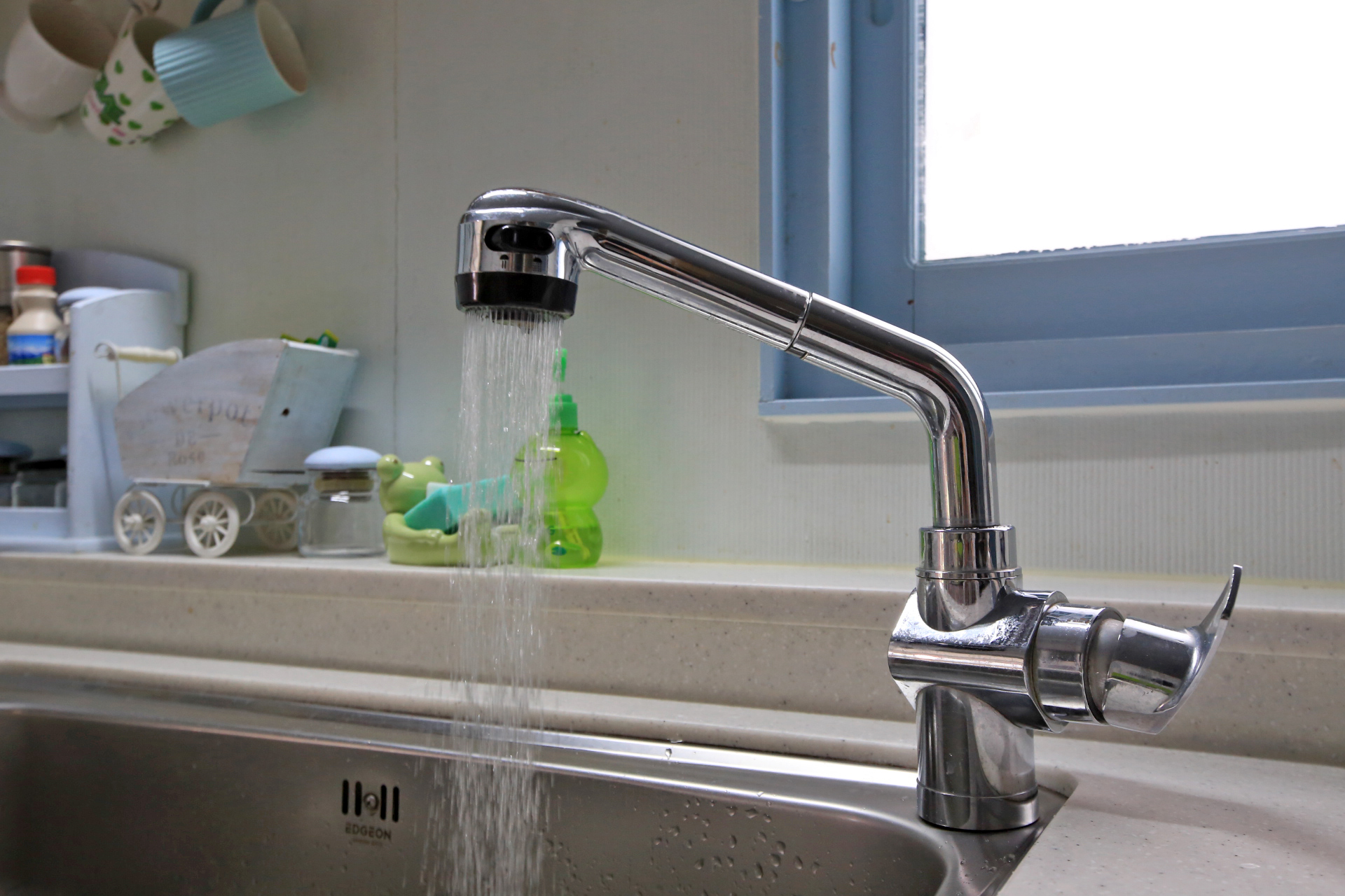 모터펌프의 전원플러그를 연결하고 기다리니 얼마 지나지 않아서 물이 나오기 시작한다. 동파방지를 위하여 겨우내 수도배관의 물을 퇴수해 두었기에 초기에는 녹물이 나오더니 이내 맑은 물로 변한다.