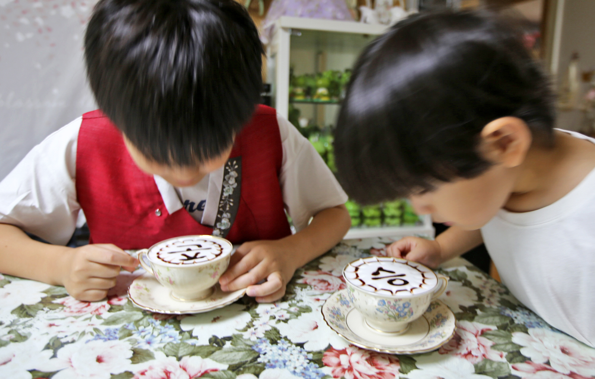 어제 밤에 Ju가 라떼아트 커피를 만들어 주었다. 나는 우유를 마시지 못하니 평소에도 우유 대신 두유로 만들어 주곤 한다. 어른들이 라떼아트 커피를 마시는 모습이 부러웠는지 손자들이 먹어보고 싶다고 한다. 그래서 Ju가 조카들을 위하여 커피를 넣지 않고 우유만으로 한 잔씩 만들어 주었었다. 오늘은 문양 대신 각자의 이름을 써서 만들어 주었다.