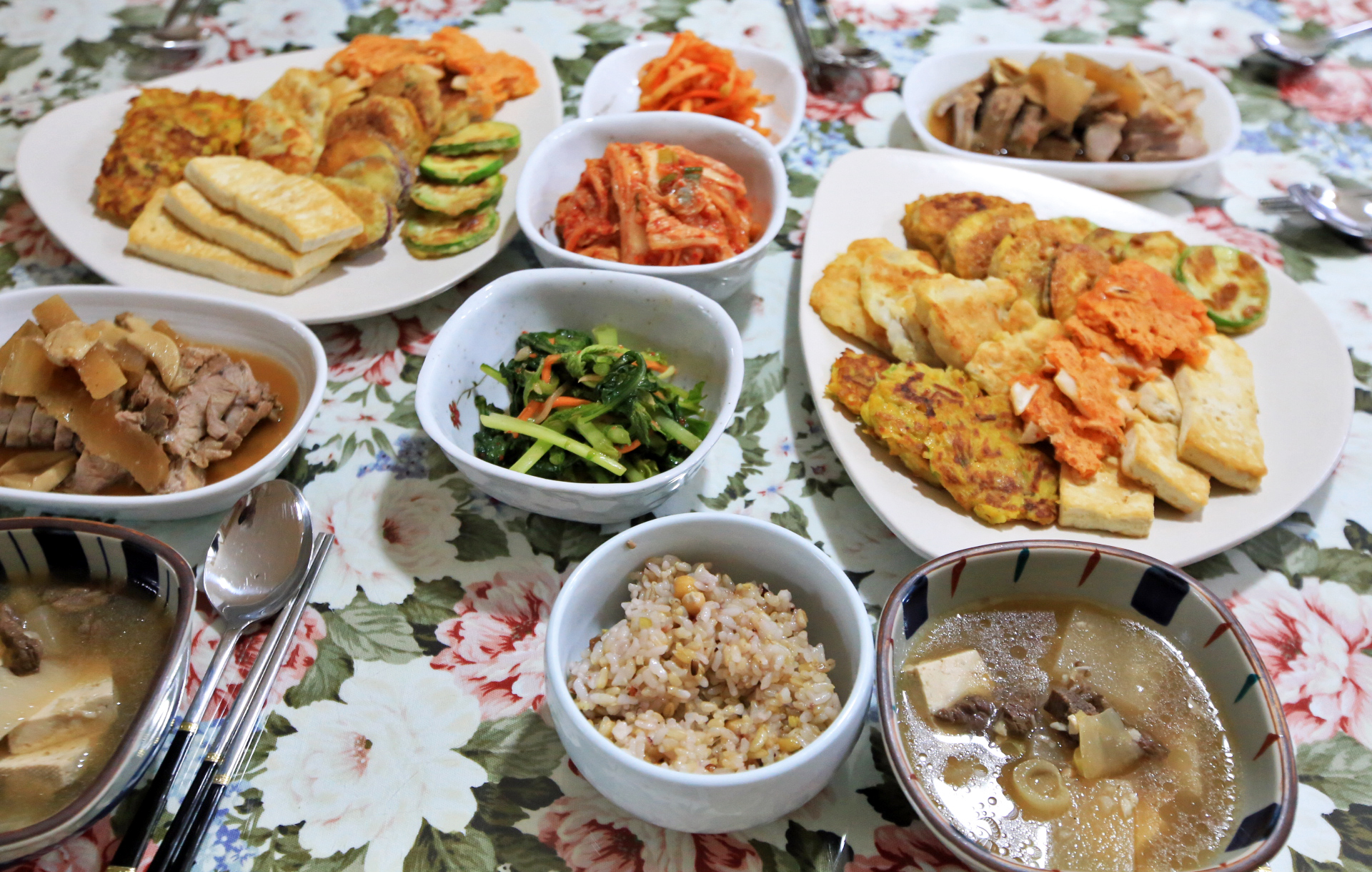 손자들과 놀고 있는 사이에 주방에서 셋이 고생해서 전과 수육과 무국을 준비하여 늦은 점심을 먹었다.