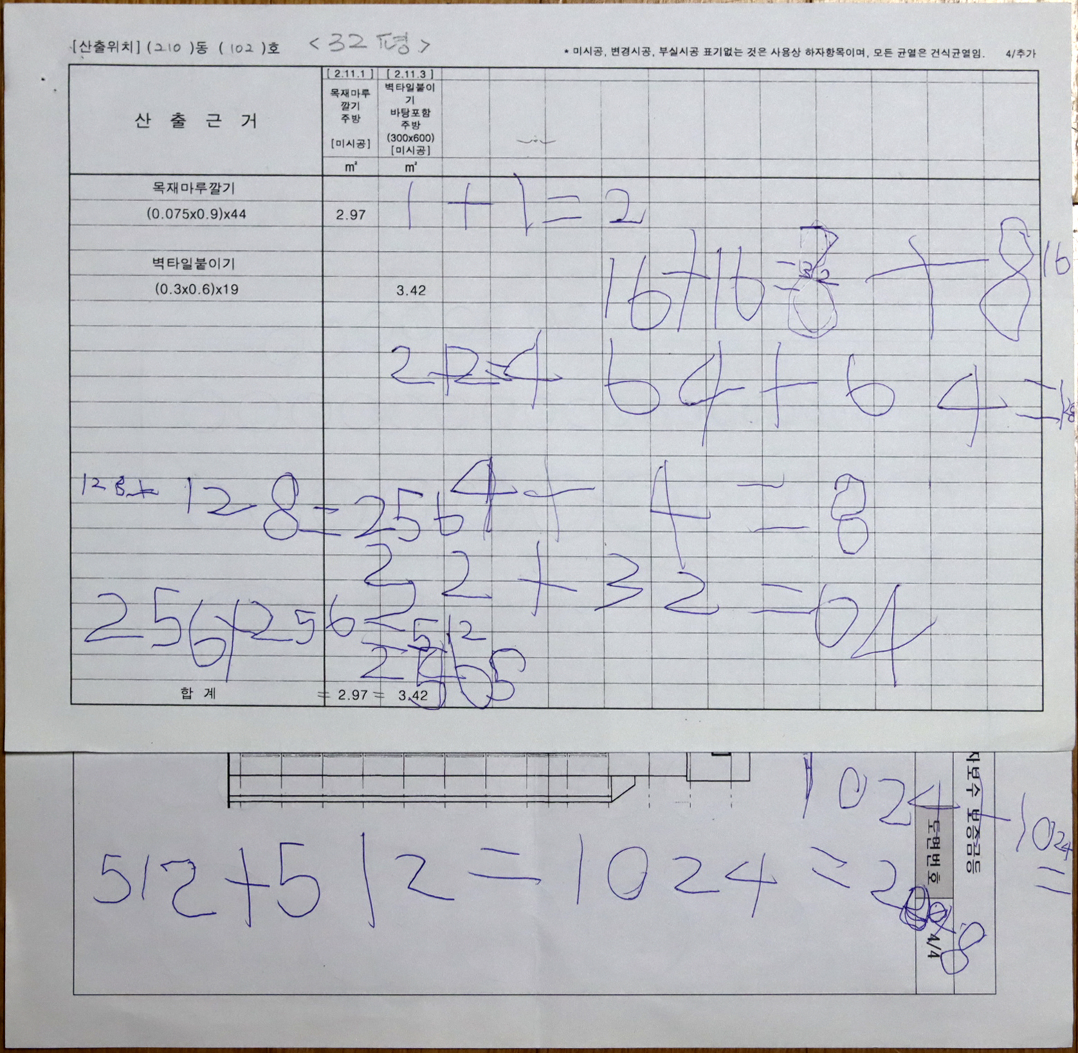 숫자를 좋아하는 Jun이 쓰며 계산한 것이다. 2~3개는 나하고 같이 계산하였다.