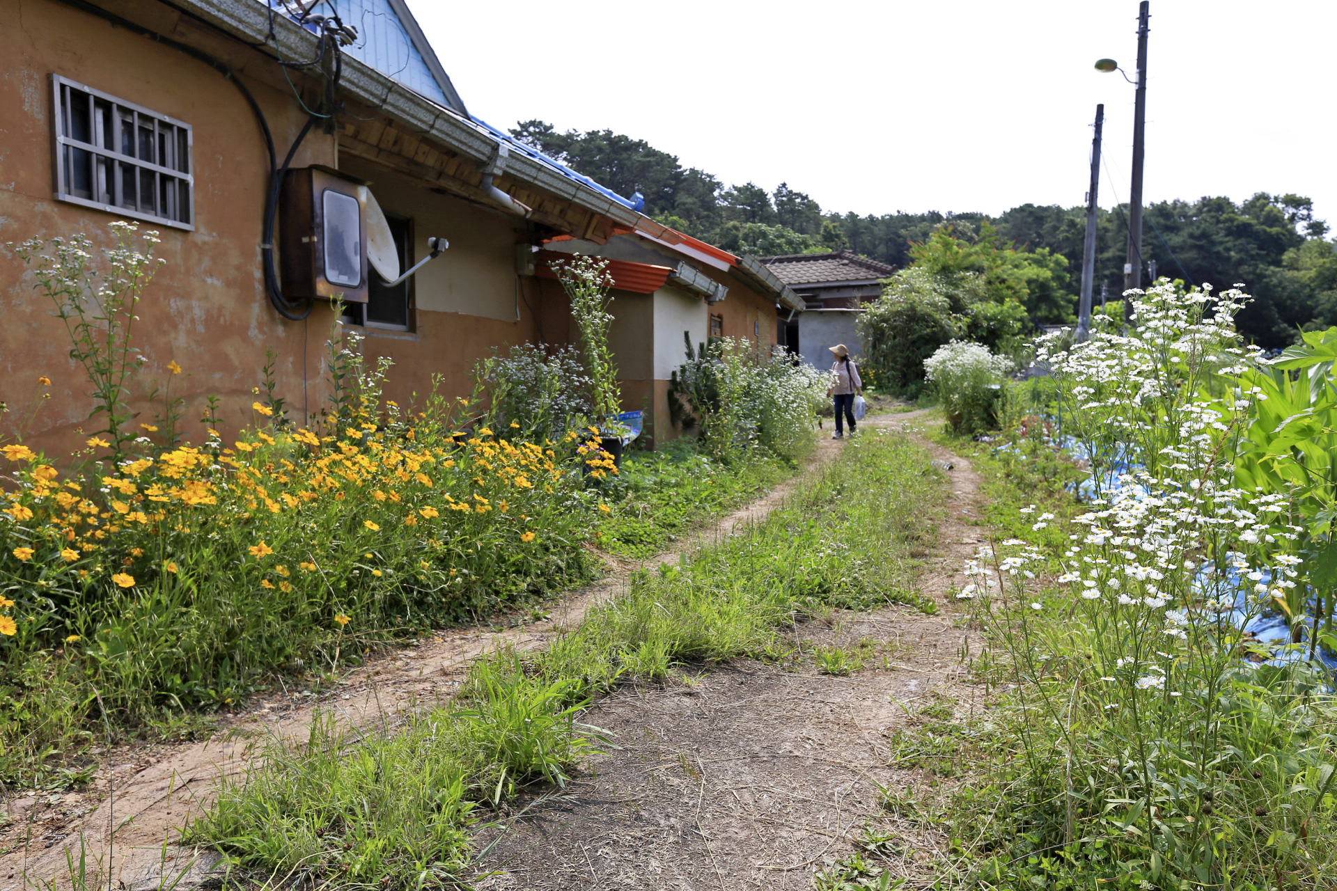 꽃밭에 망초가 있는 것이 신기하게 보인다.