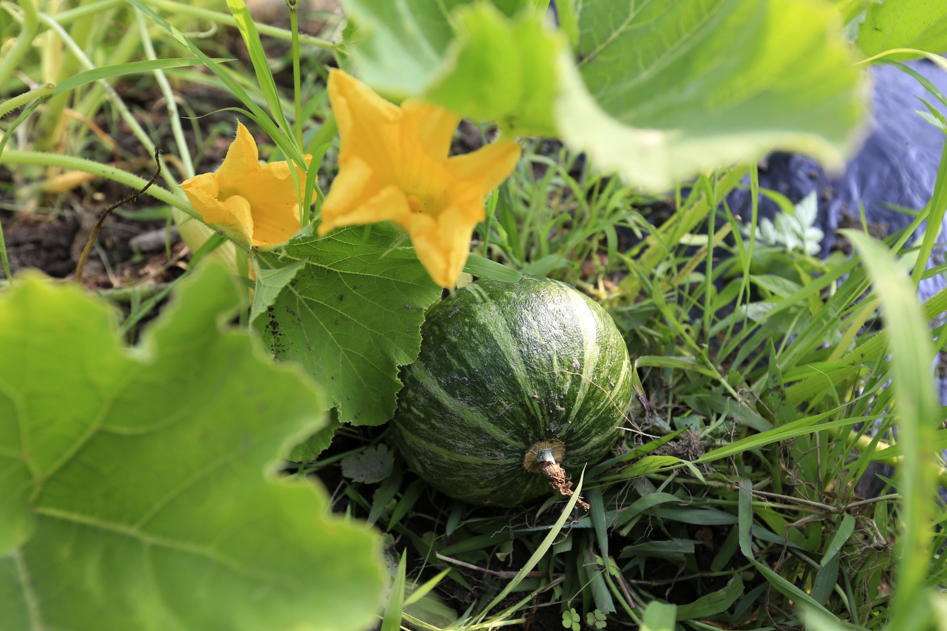 텃밭에 단호박이 두 개, 일반 호박이 한 개 열렸는데 호박 줄기 부근의 풀을 뽑고 복합비료를 뿌려주었다.