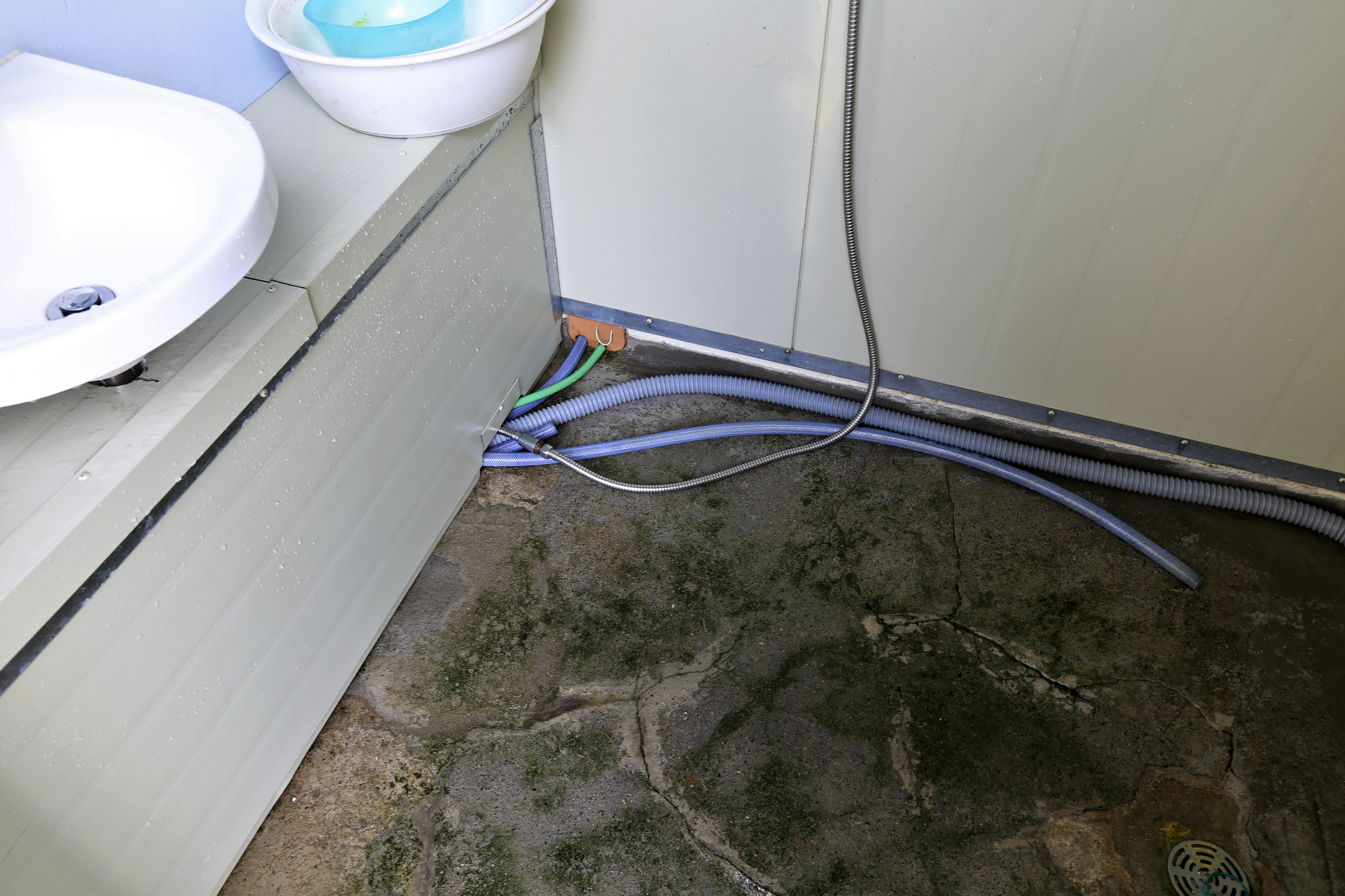 여름철이 되며 샤워실 바닥에 이끼가 번성하여 락스를 묻힌 솔로 박박 문질러서 닦아냈다. 샌드위치패널 벽체도 물때가 끼었기에 청소해 주었다.