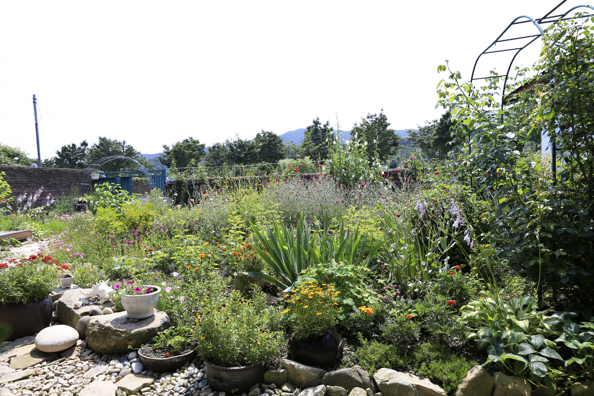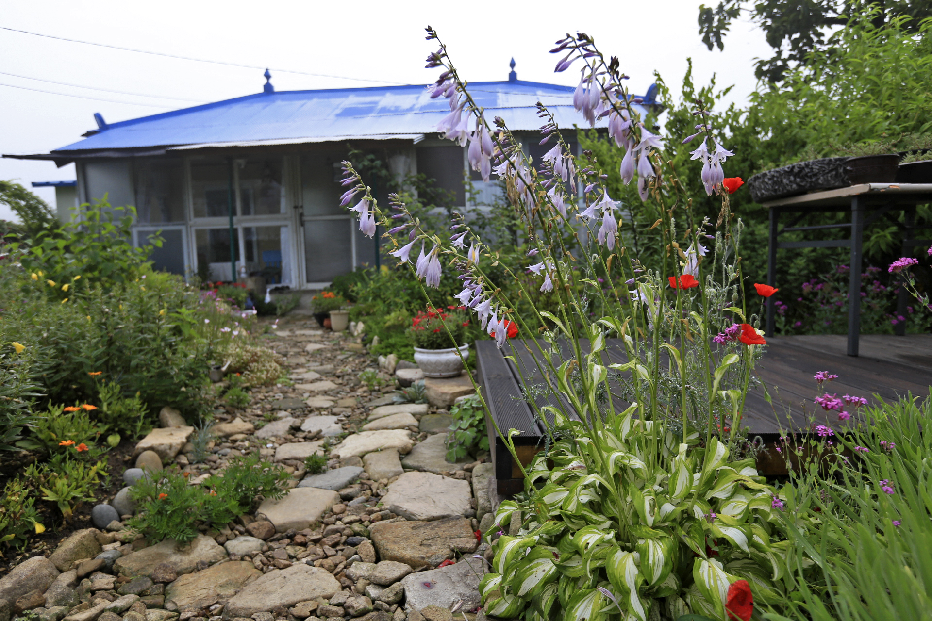 샤스타데이지와 노란낮달맞이꽃과 꽃양귀비가 지니 꽃밭이 조금 썰렁해 졌다. 분홍낮달맞이꽃도 거의 지는 상태이다. 며칠 더 기다리면 메리골드가 꽃밭을 꽉 채우리라. 그리고 백일홍과 채송화가 피기 시작하였으니 머지않아 화려한 꽃밭으로 변신할 것이다.