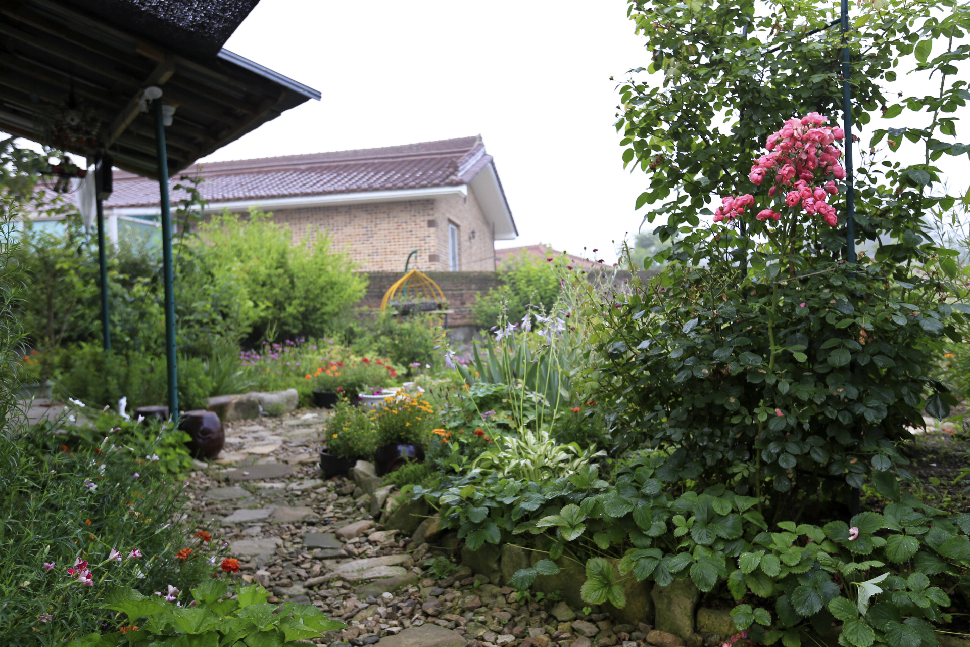 본채 데크채양의 지붕틀을 연장한 지지대를 설치하고 장미넝쿨을 올리기 위하여 끈으로 묶어주었다. 올봄에는 동해를 입어서 꽃이 피지 않았다.