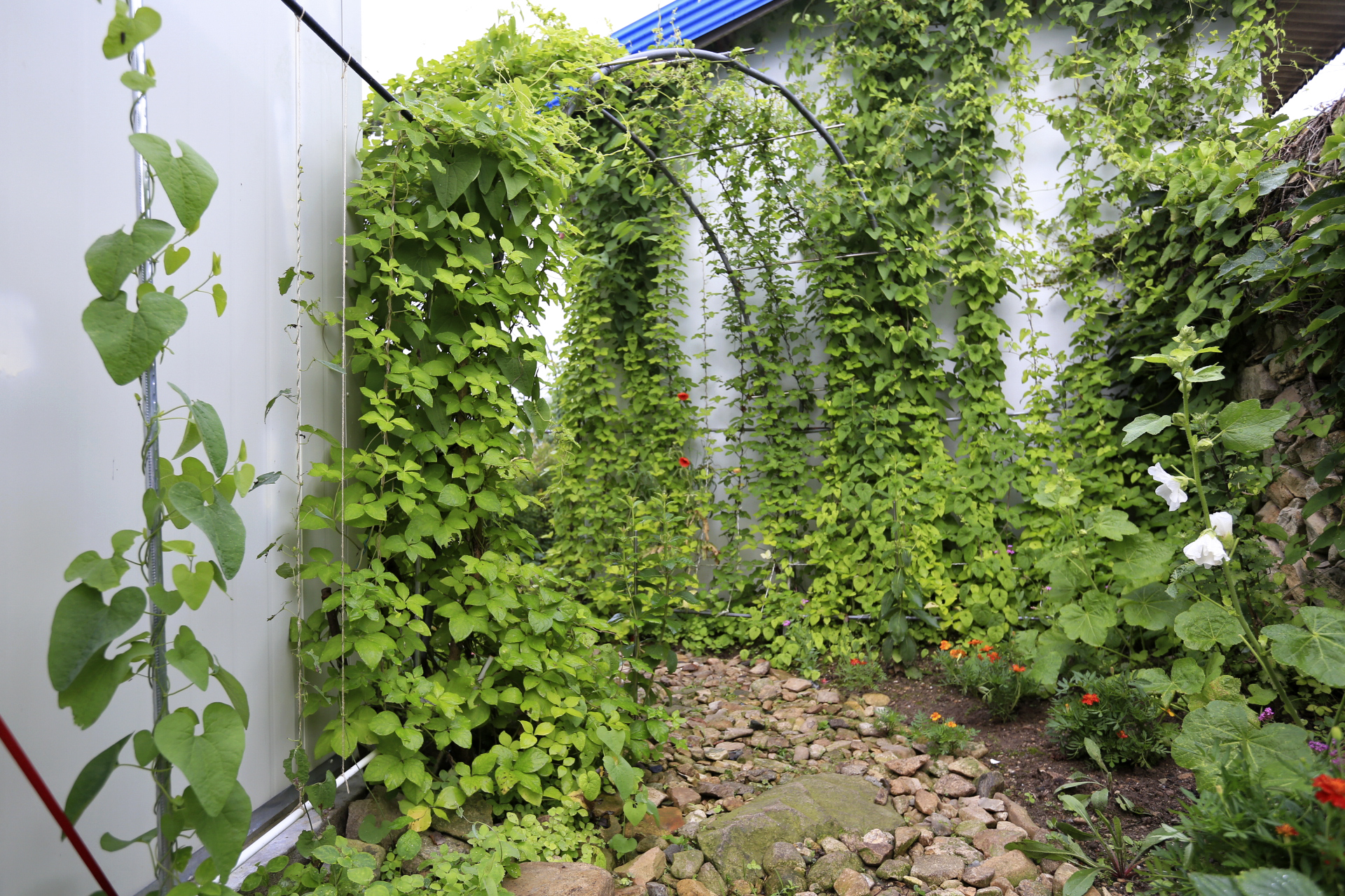 샤워실에 걸어둔 수건이 잘 마르지 않기에 농작물 지지대를 이용하여 가까이에 수건 건조대를 만들었다.