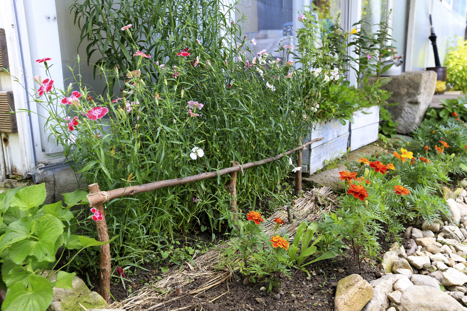 이른 봄에 종지나물이 무성했던 본채 앞 꽃밭이다. 뒷줄의 패랭이꽃이 키가 커서 넘어져서 앞줄의 있는 메리골드를 뒤덮기에 나뭇가지를 이용하여 패랭이꽃을 세워주었다.