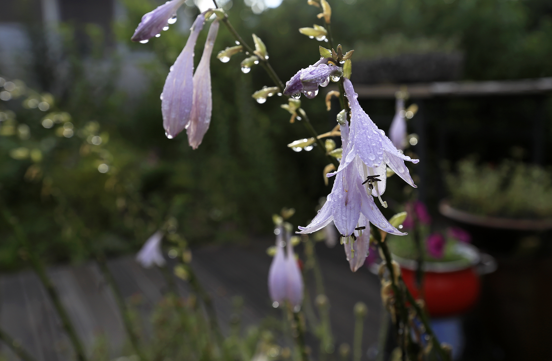 장마 첫날 내린 비로 꽃밭 한가운데 있던 우단동자가 쓰러져서 지지대를 설치하여 일으켜 세웠었다. 며칠 지나지 않았지만 더 이상 꽃이 피지 않는 우단동자는 꽃대를 잘라주었더니 뒷줄에 있는 접시꽃이 훤하게 보인다.