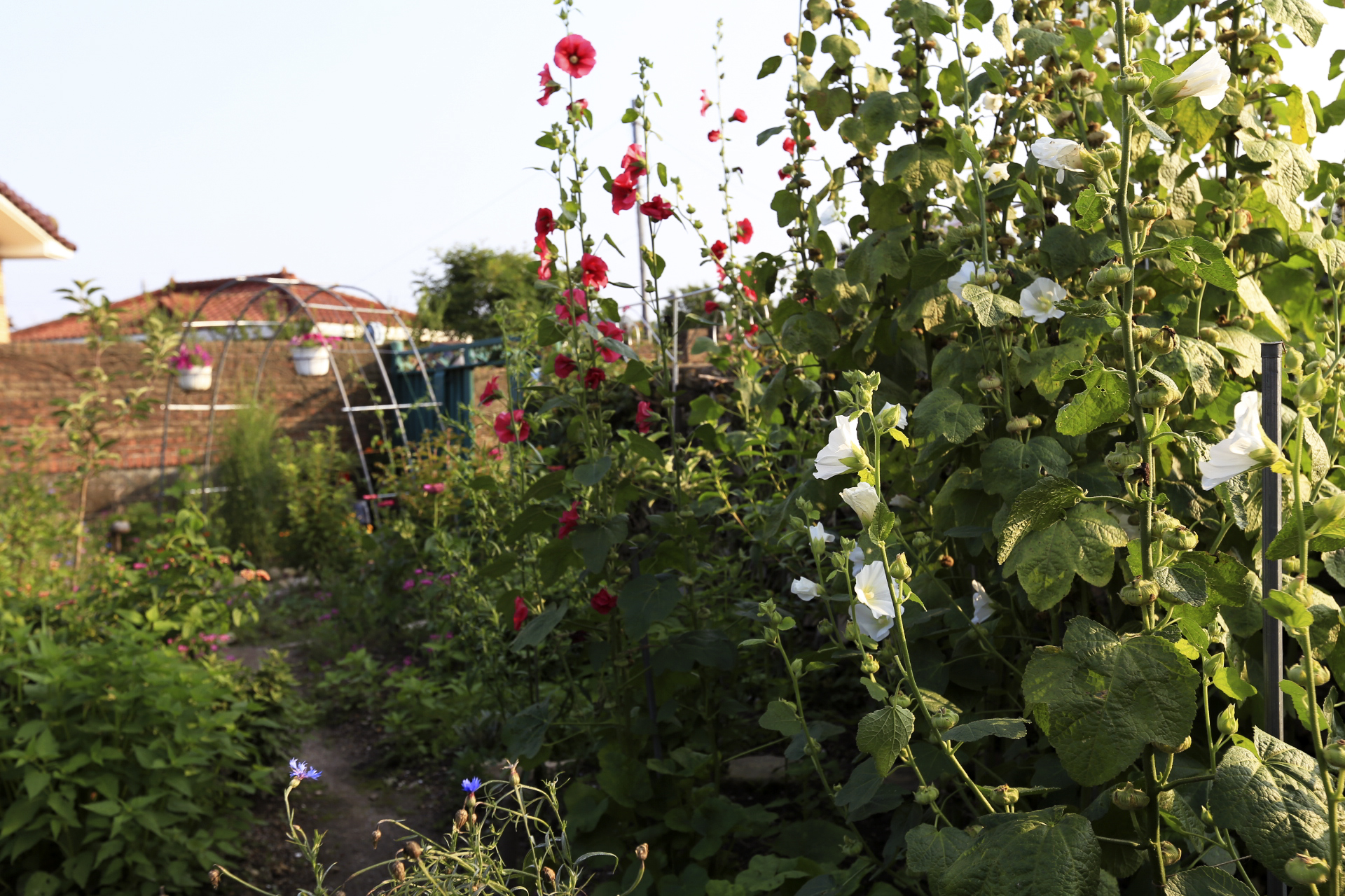 대문 앞에 넝쿨을 올리려고 설치한 아치가 상반기가 지나도록 썰렁하였는데 주변의 키가 큰 꽃대를 정리해 주었더니 나팔꽃과 풍선넝쿨이 아치를 따라 올라가기 시작하였다. 벌써 풍선이 열렸다.