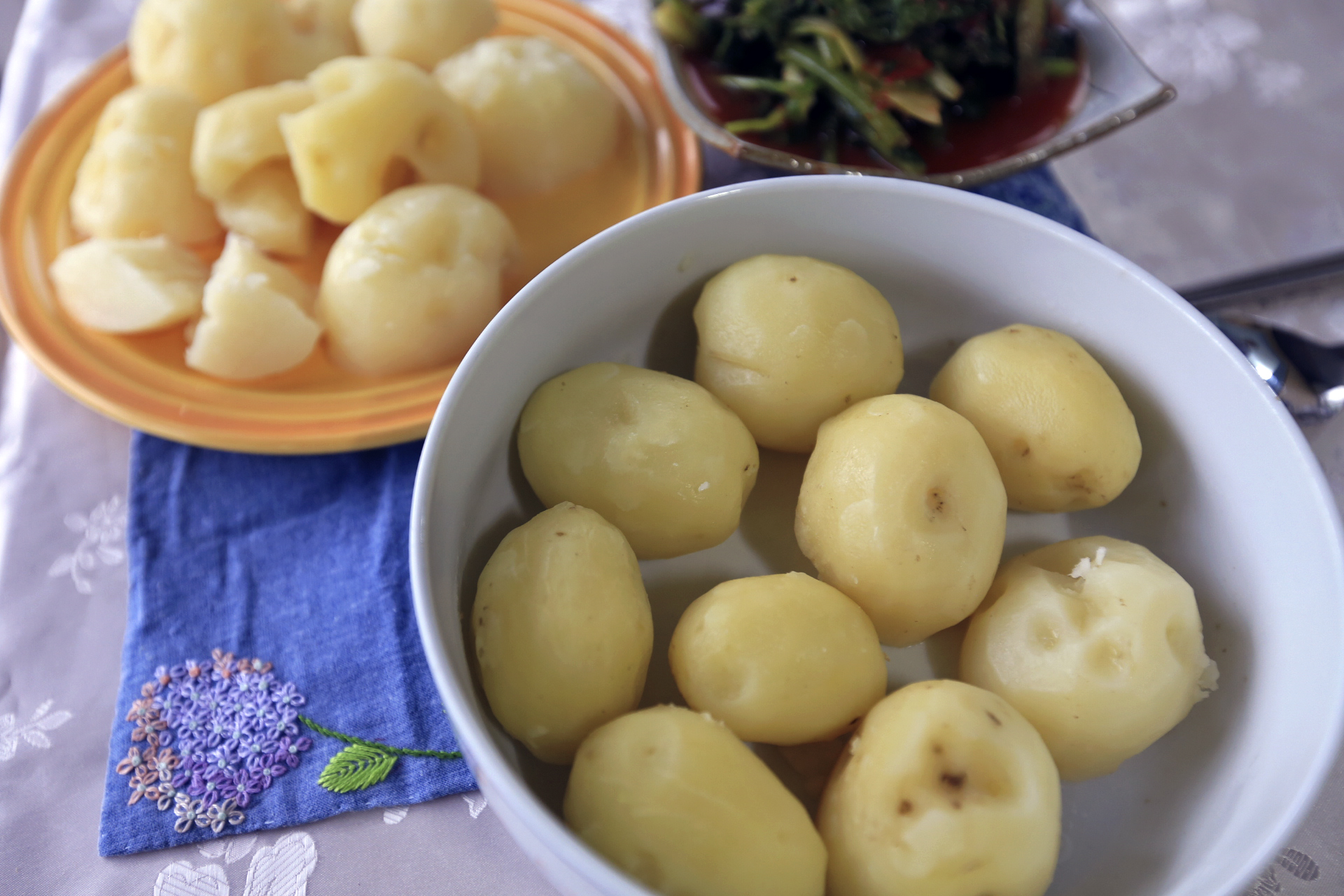 감자를 캐던 날 새끼 감자만 쪄서 먹었다. 직접 재배한 것이니 제대로 된 감자를 찌면 사진을 찍어야겠다고 생각하고 있었는데 오랜만에 오늘에서야 감자를 쪘다. 햇감자는 껍질이 쉽게 벗겨지는데 원래 품종이 그런 것인지 껍질이 쉽게 벗겨지지 않는단다.