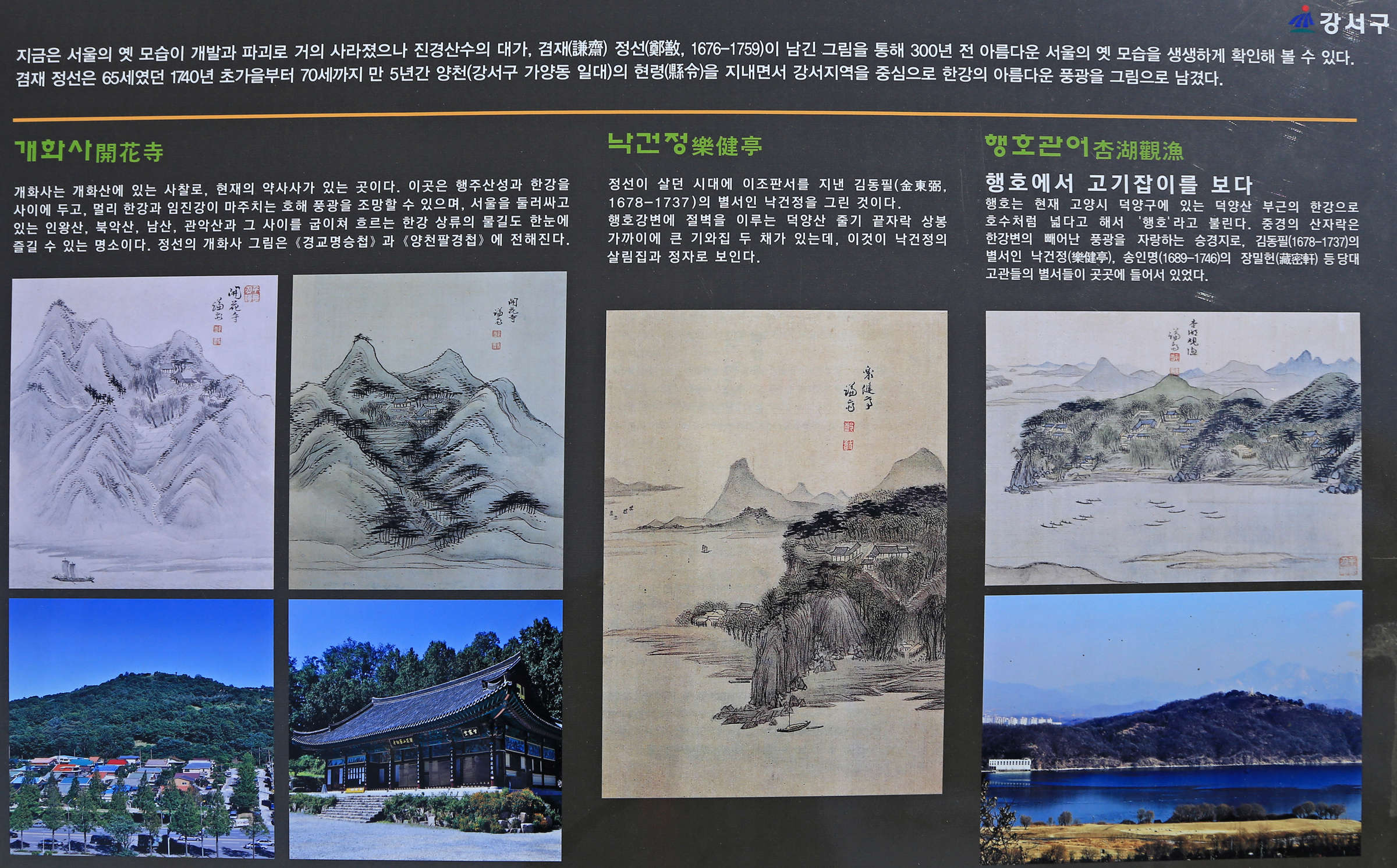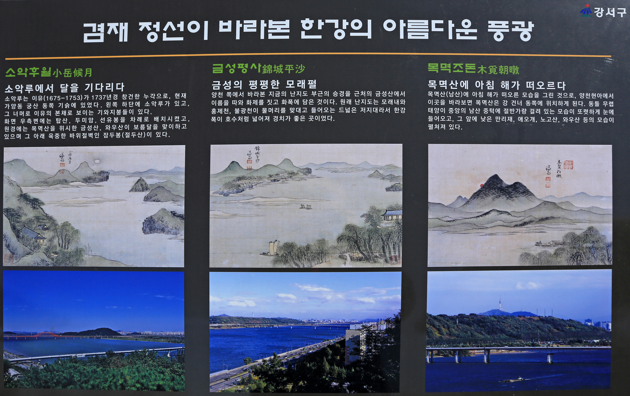 양천(현 강서구 일원)현감을 지낸 겸재 정선의 한강 그림과 그림에 나타난 지역이 어디쯤인지 설명한 사진이 있으나 잘 모르겠다.