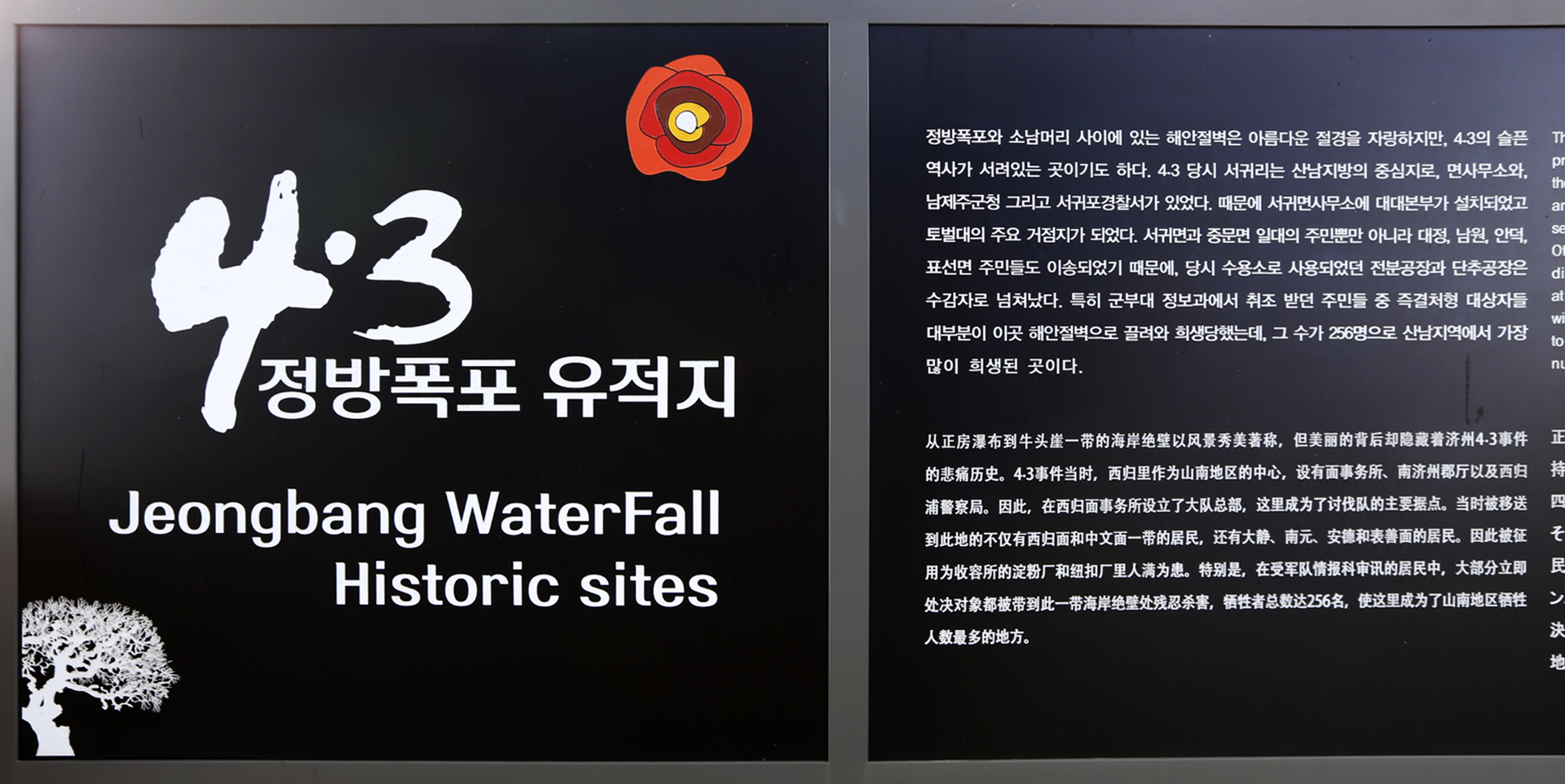 자구리 문화예술공원에서 정방폭포로 가는 길에 '4·3 위령비 설치 결사반대'란 현수막을 보았기에 무슨 일일까? 궁금하였다. 정방폭포에서 4·3 정방폭포 유적지에 대한 설명문을 보았기에 돌아 나오는 길에 다녀가려고 접근하였는데 양쪽 진입로 모두 공사 중이라 출입금지란 안내문이 붙어있어서 되돌아섰다.