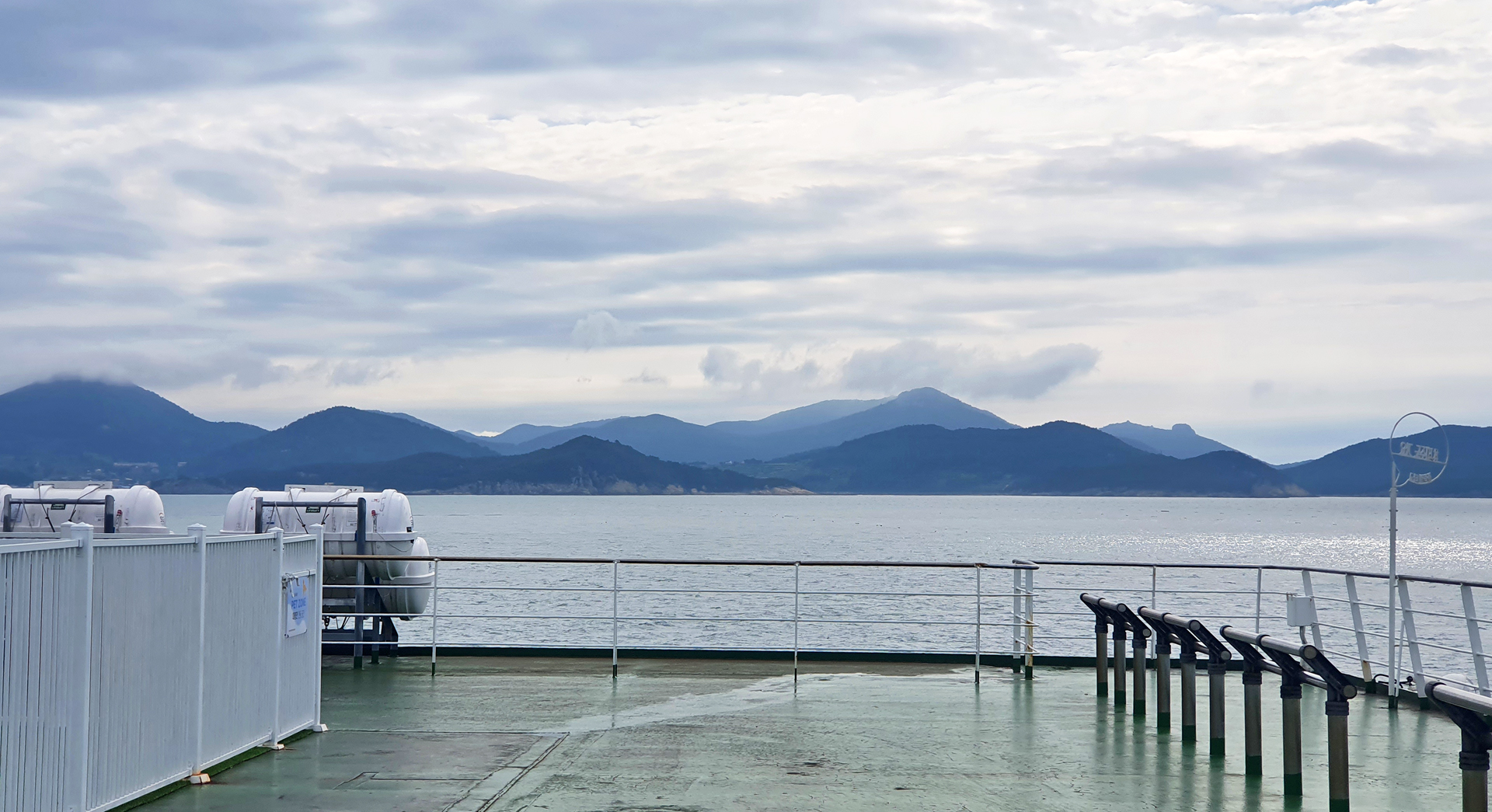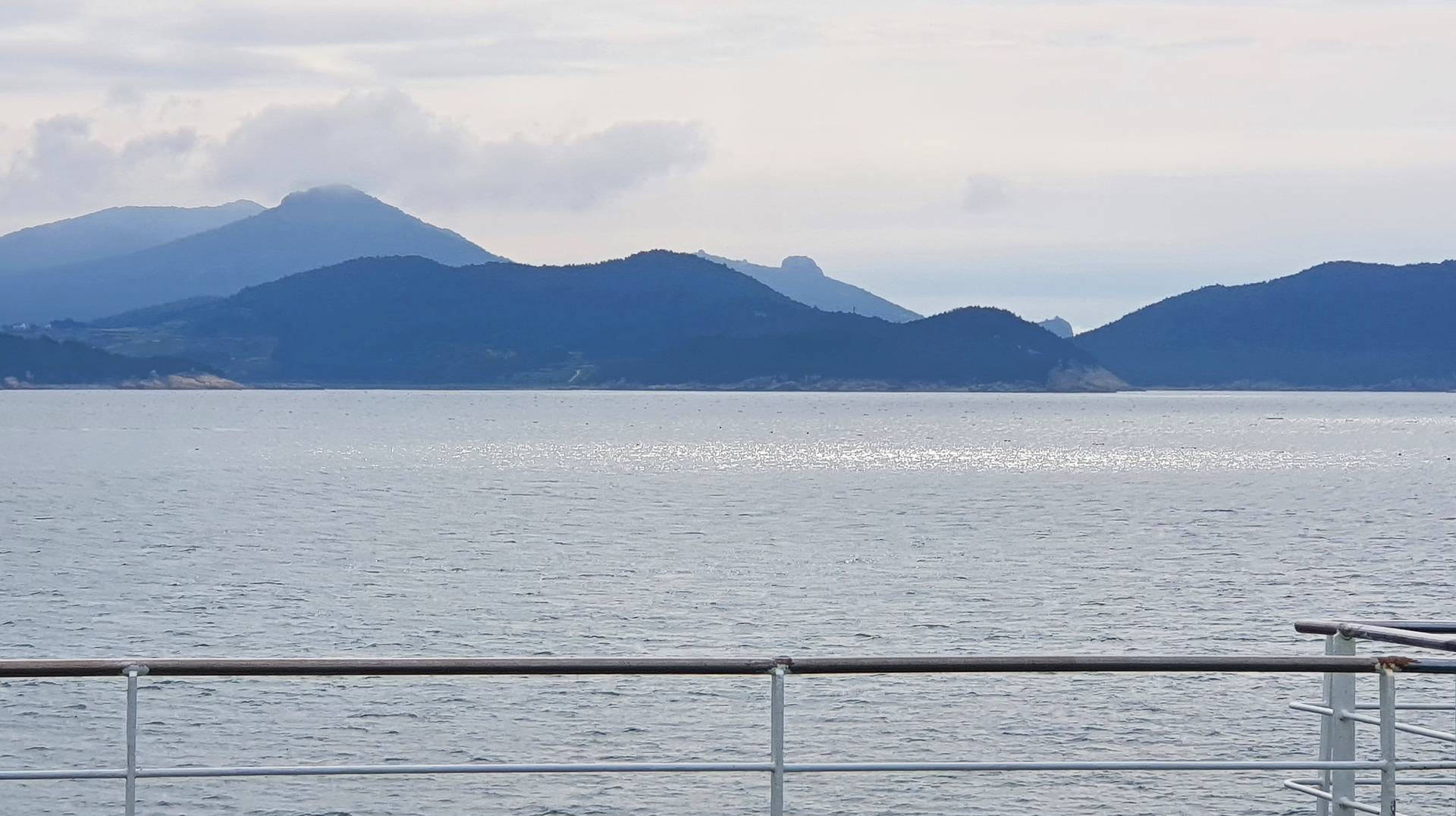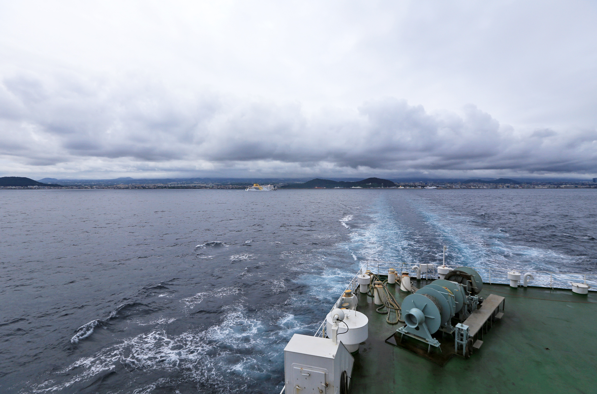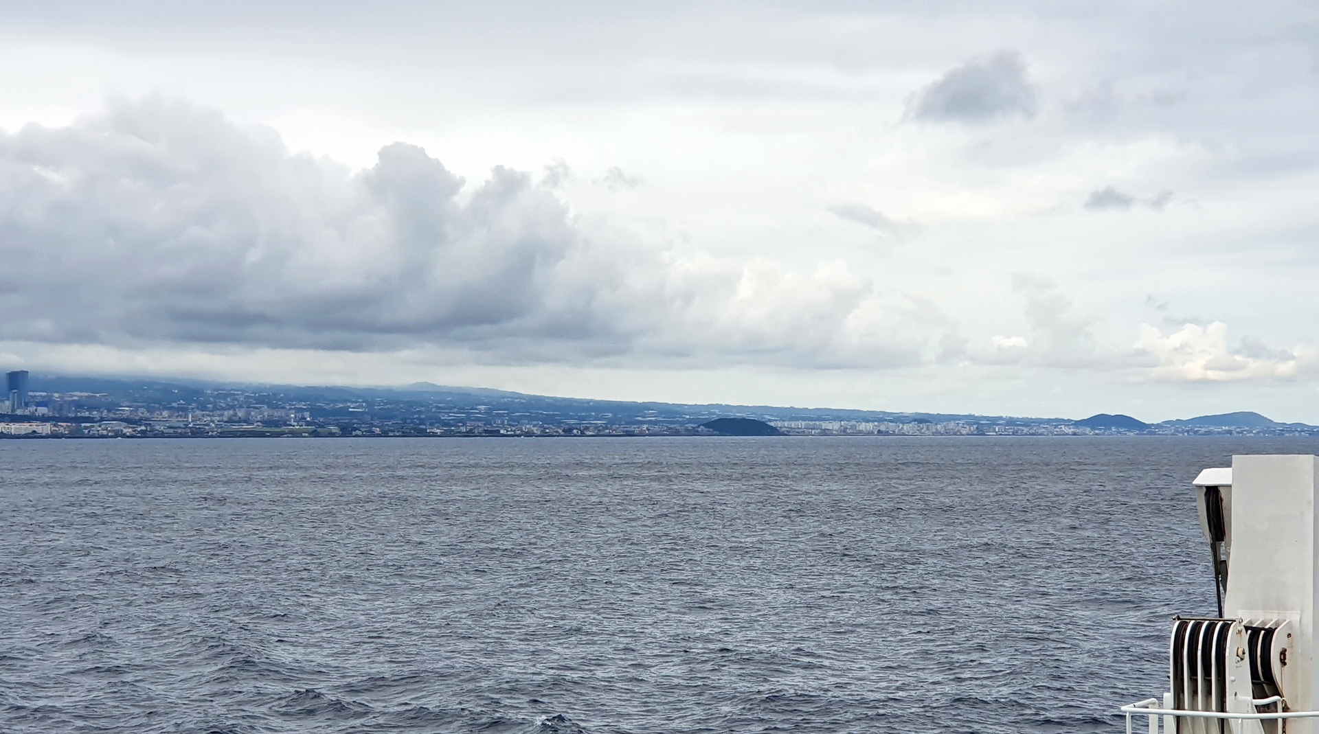 배정받은 선실에 우산과 생수를 놓아두고 바로 갑판으로 나왔다. 비가 그치고 하늘이 개기 시작하는데 한라산은 여전히 구름 속에 숨어있다.