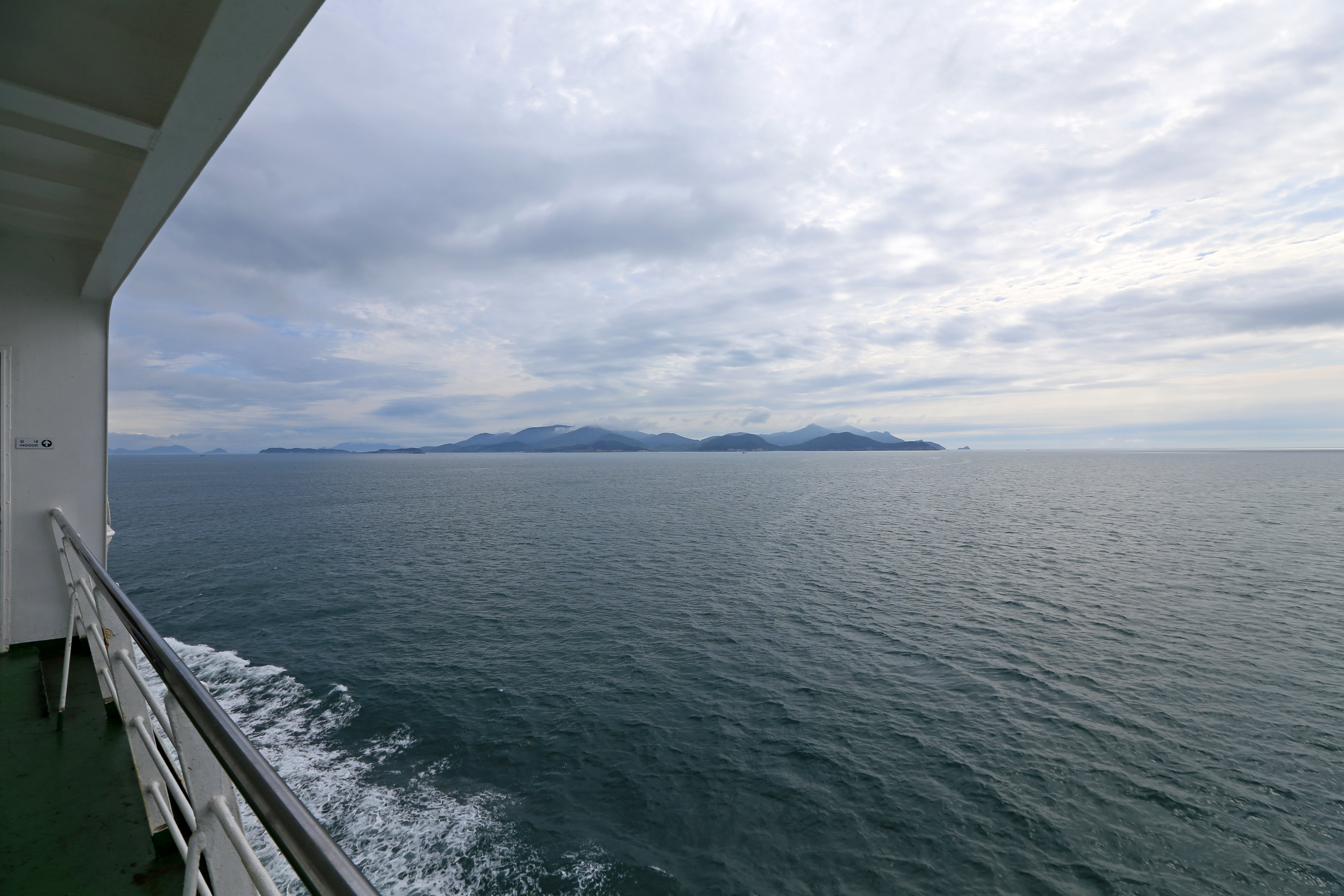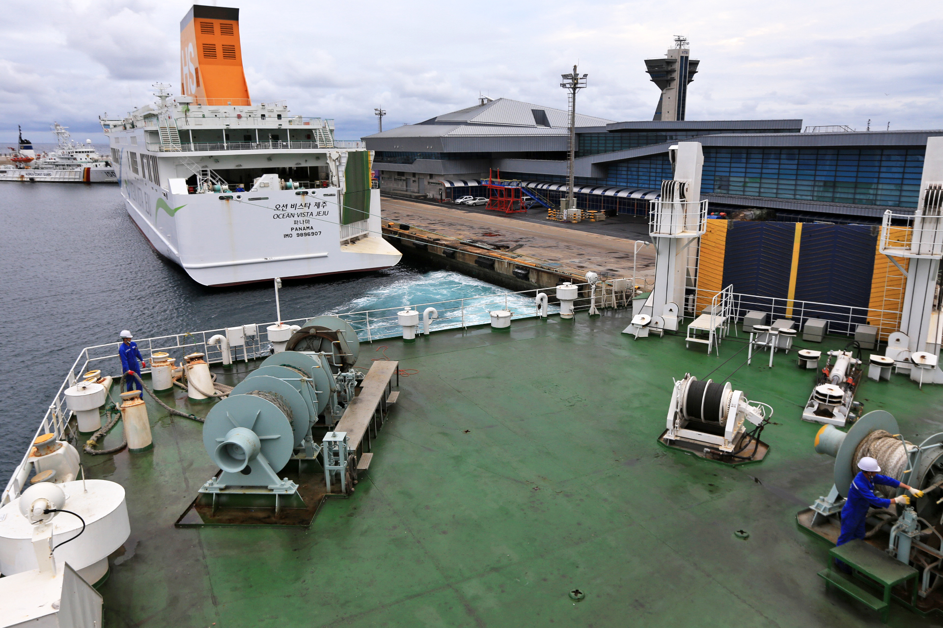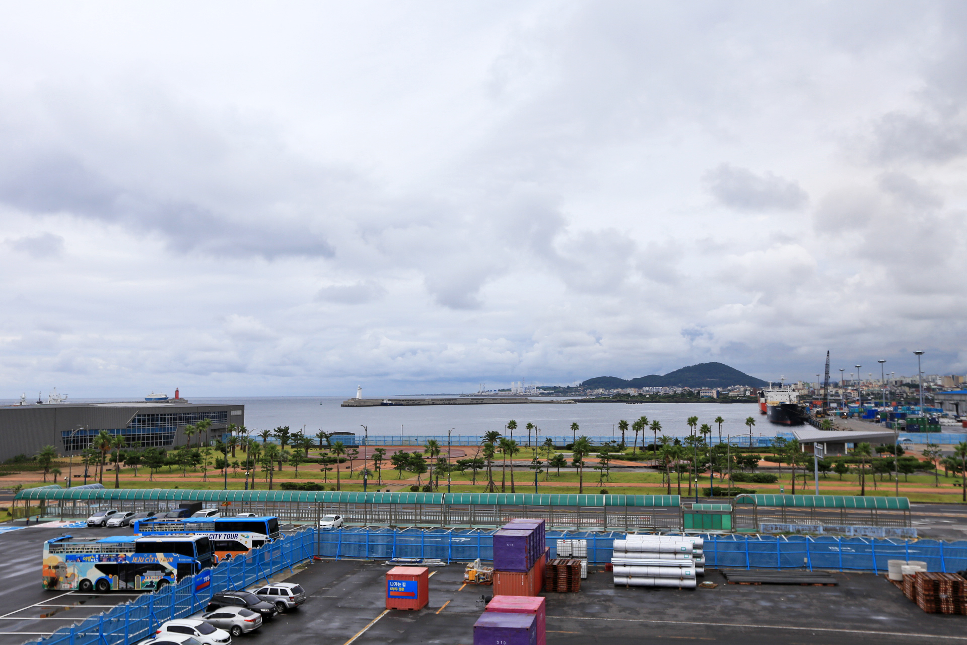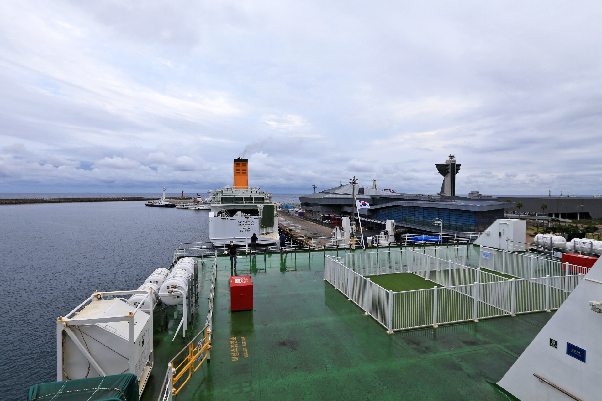 배정받은 선실에 우산과 생수를 놓아두고 바로 갑판으로 나왔다. 비가 그치고 하늘이 개기 시작하는데 한라산은 여전히 구름 속에 숨어있다.