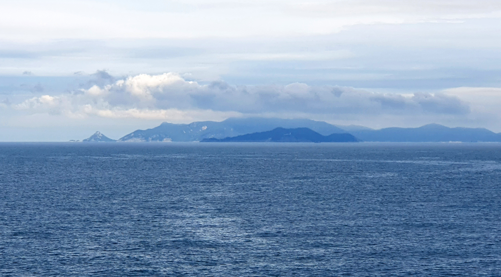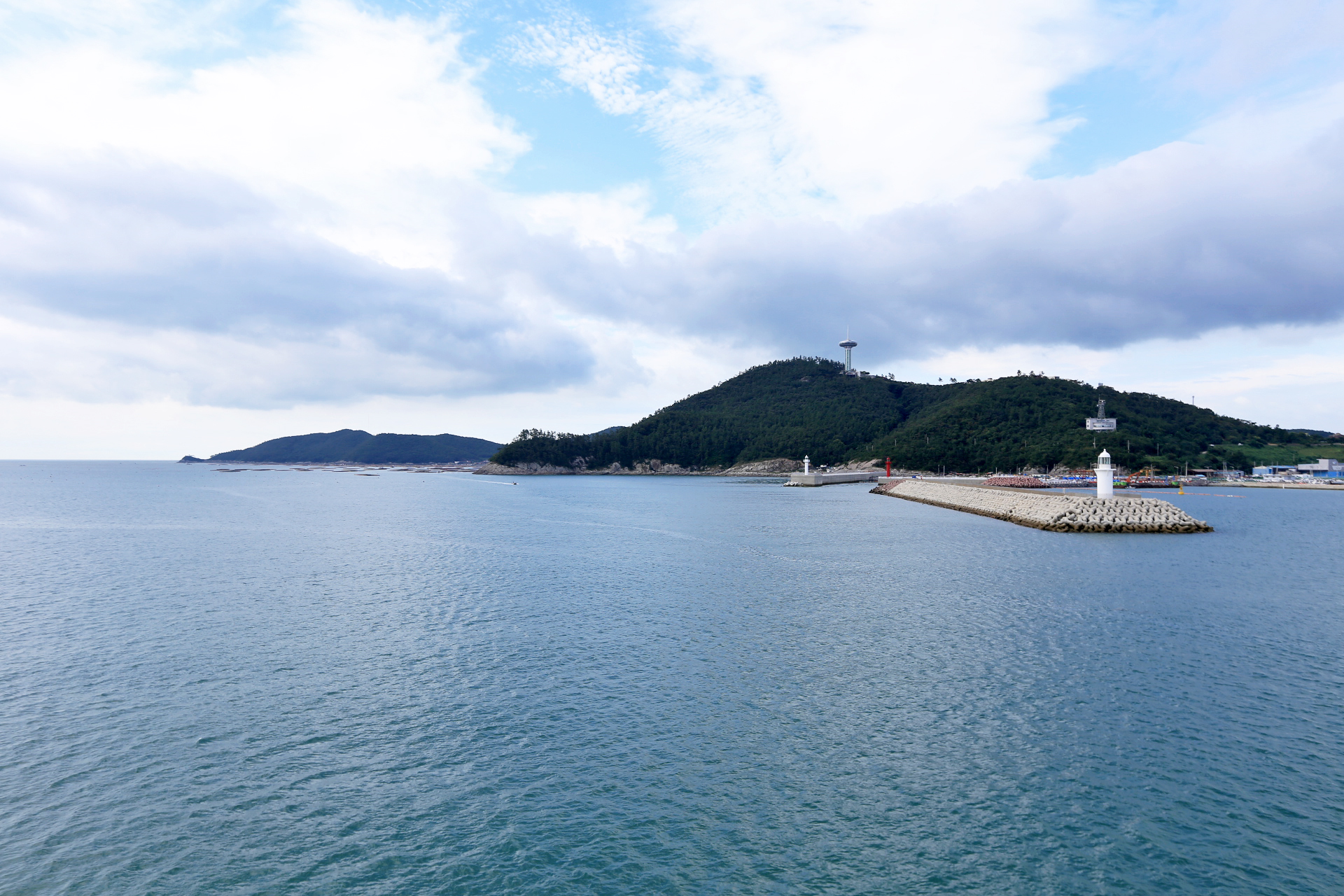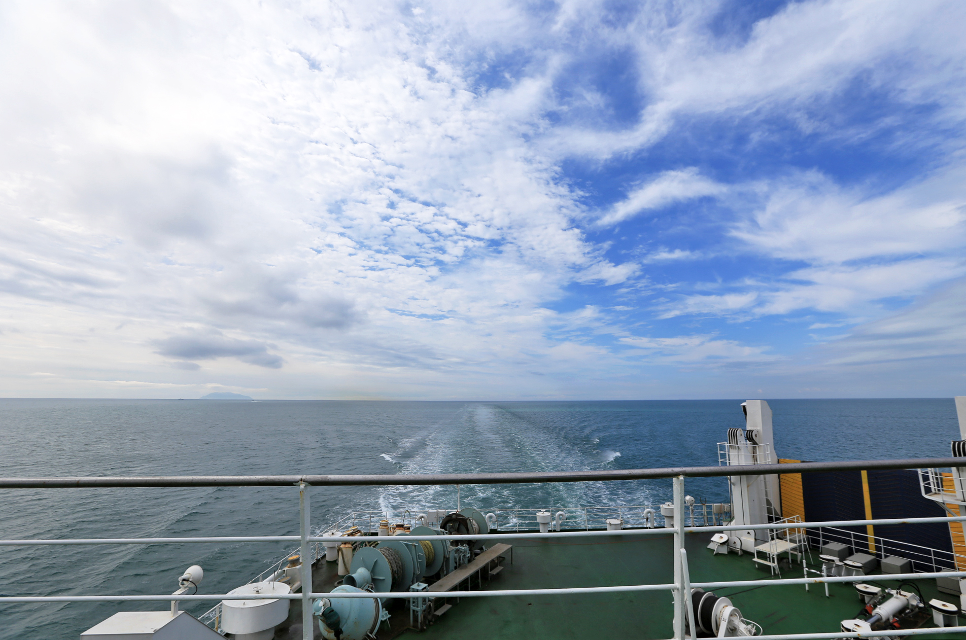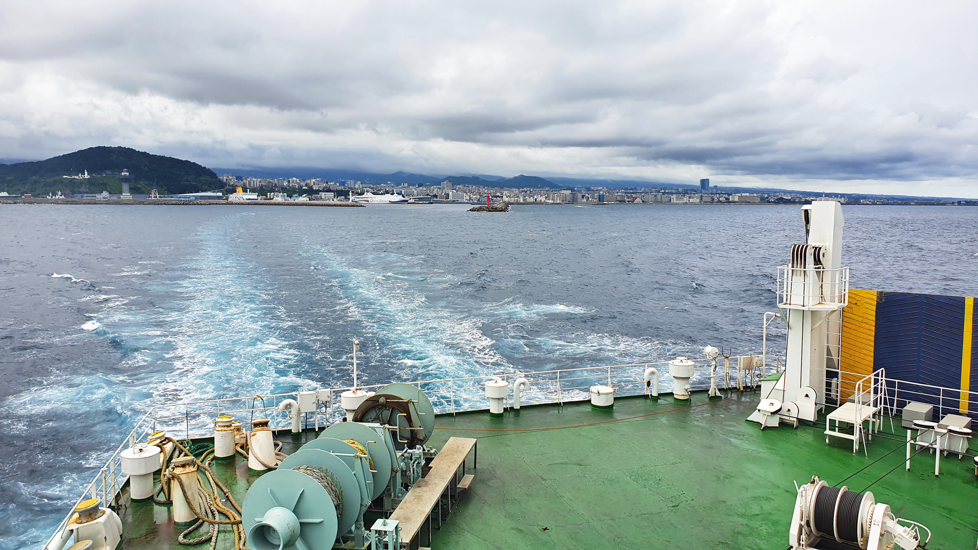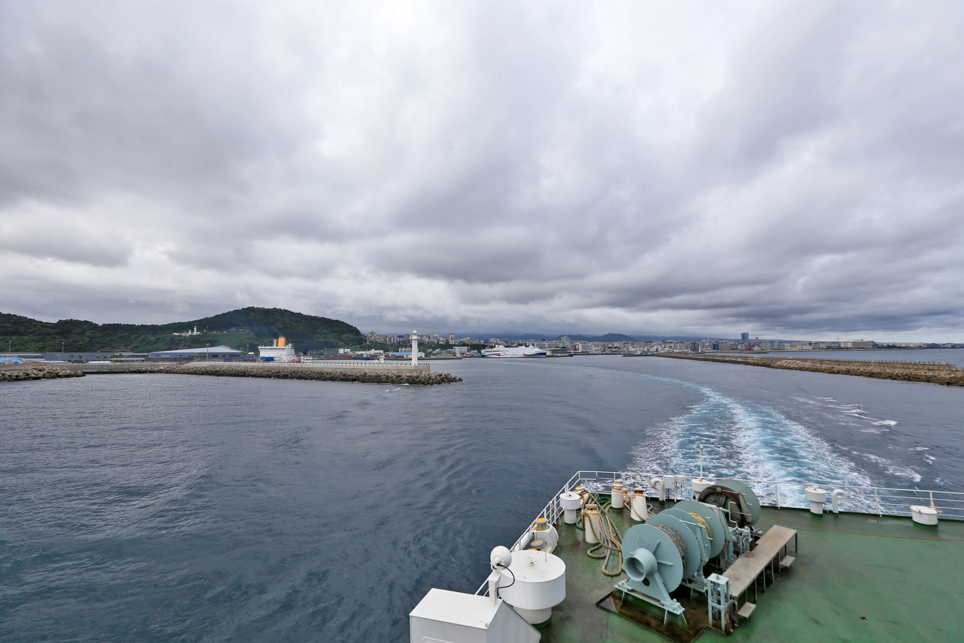 배정받은 선실에 우산과 생수를 놓아두고 바로 갑판으로 나왔다. 비가 그치고 하늘이 개기 시작하는데 한라산은 여전히 구름 속에 숨어있다.