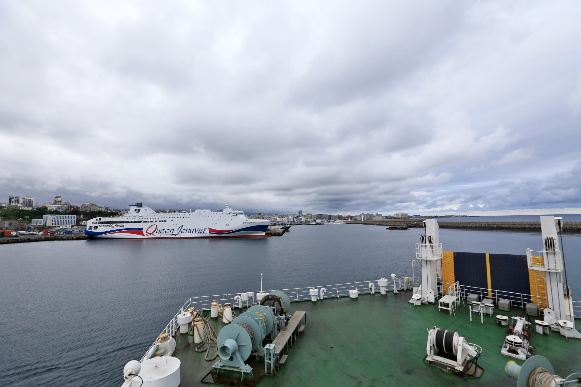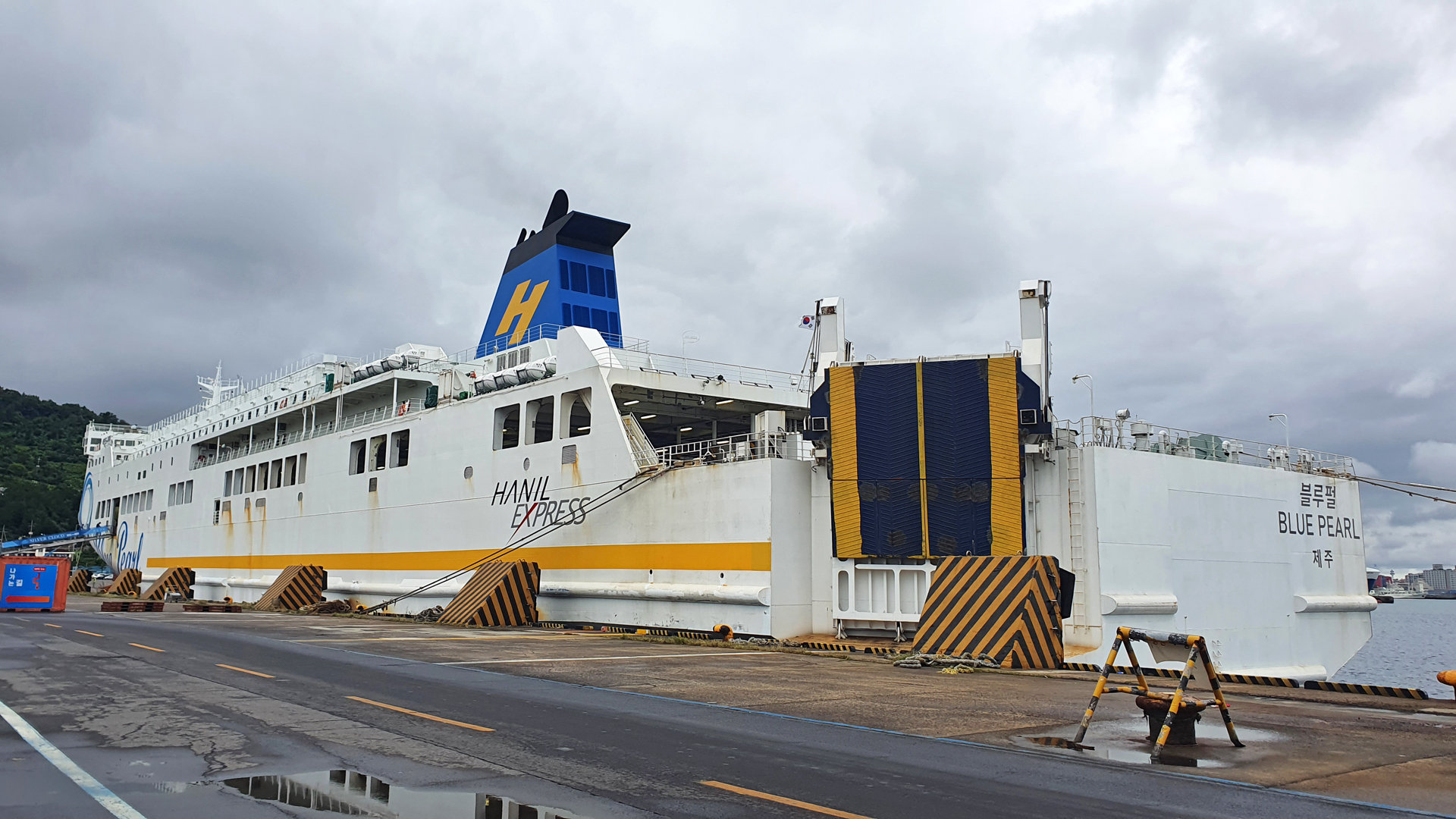 차량선적을 마치고 차량이 선적된 위치를 사진으로 촬영해 두었다. 제주로 올 때에 선적한 위치를 찾느라 고생하였기에 미리 대비한 것이다. 선적을 마치고 다시 부두로 돌아와서 제주국제여객터미널에서 승선권을 발부받기 위하여 셔틀버스를 기다리는 중에 타고 갈 블루펄호를 촬영하였다. 제주로 올 때에는 차가 선미로 들어갔는데 제주를 떠날 때에는 선두로 들어갔다. 어느새 비가 그쳤다.