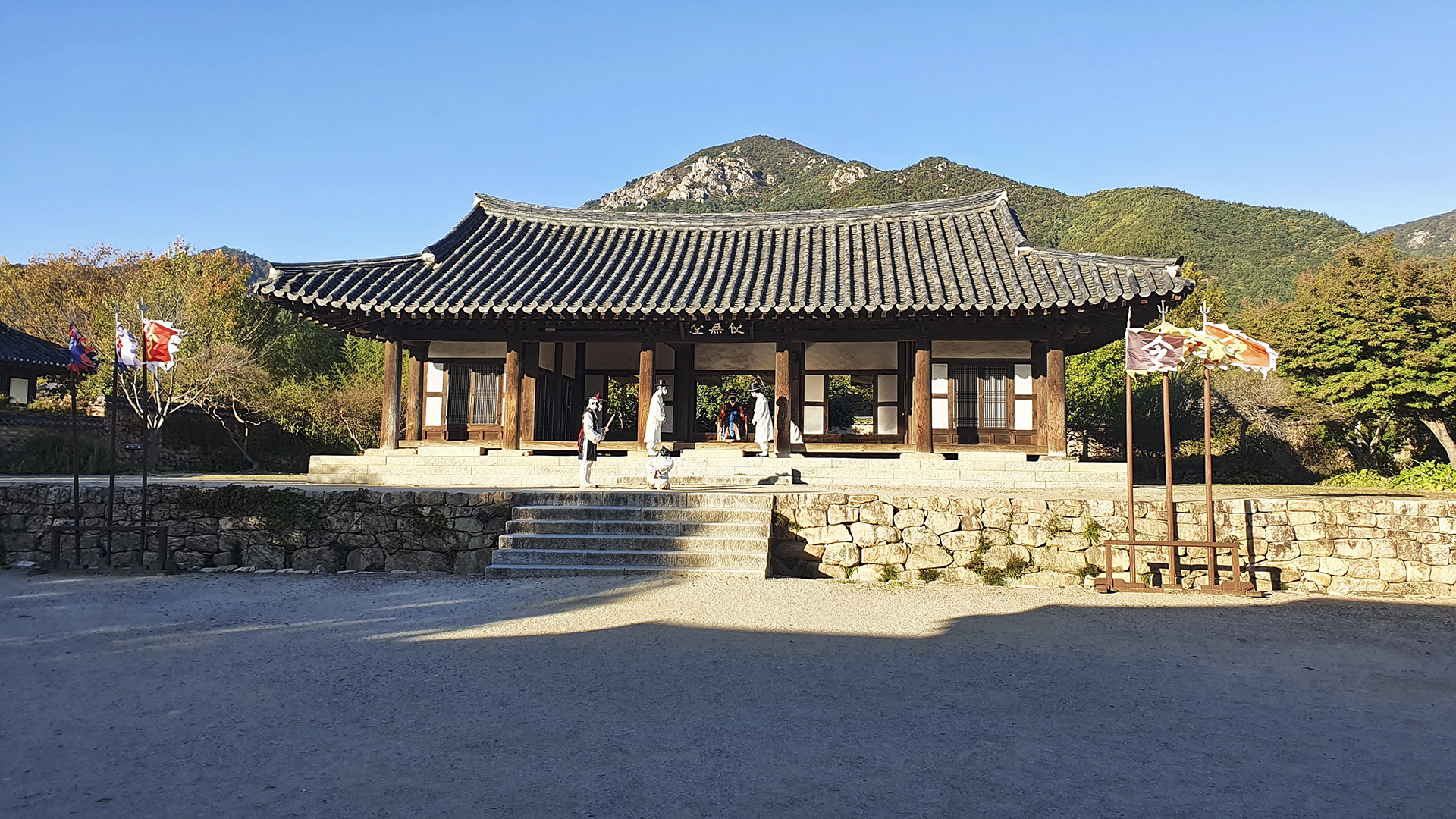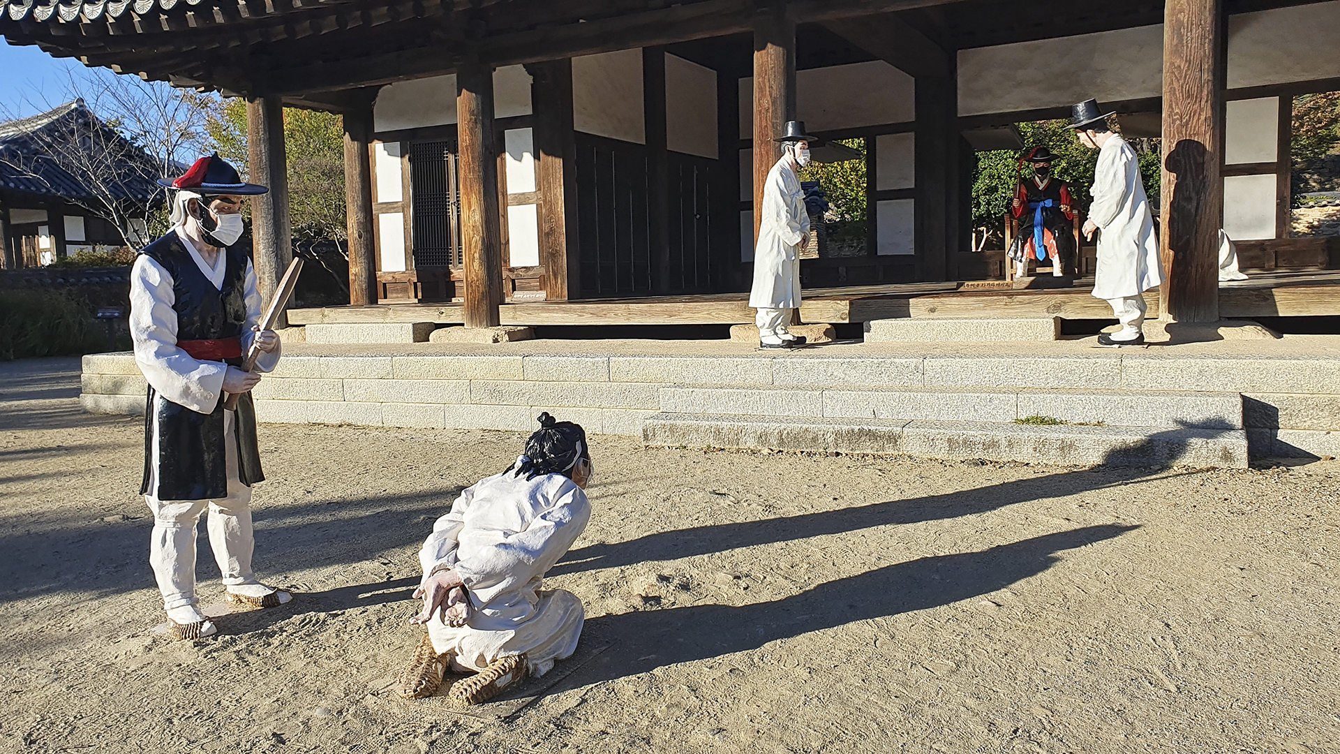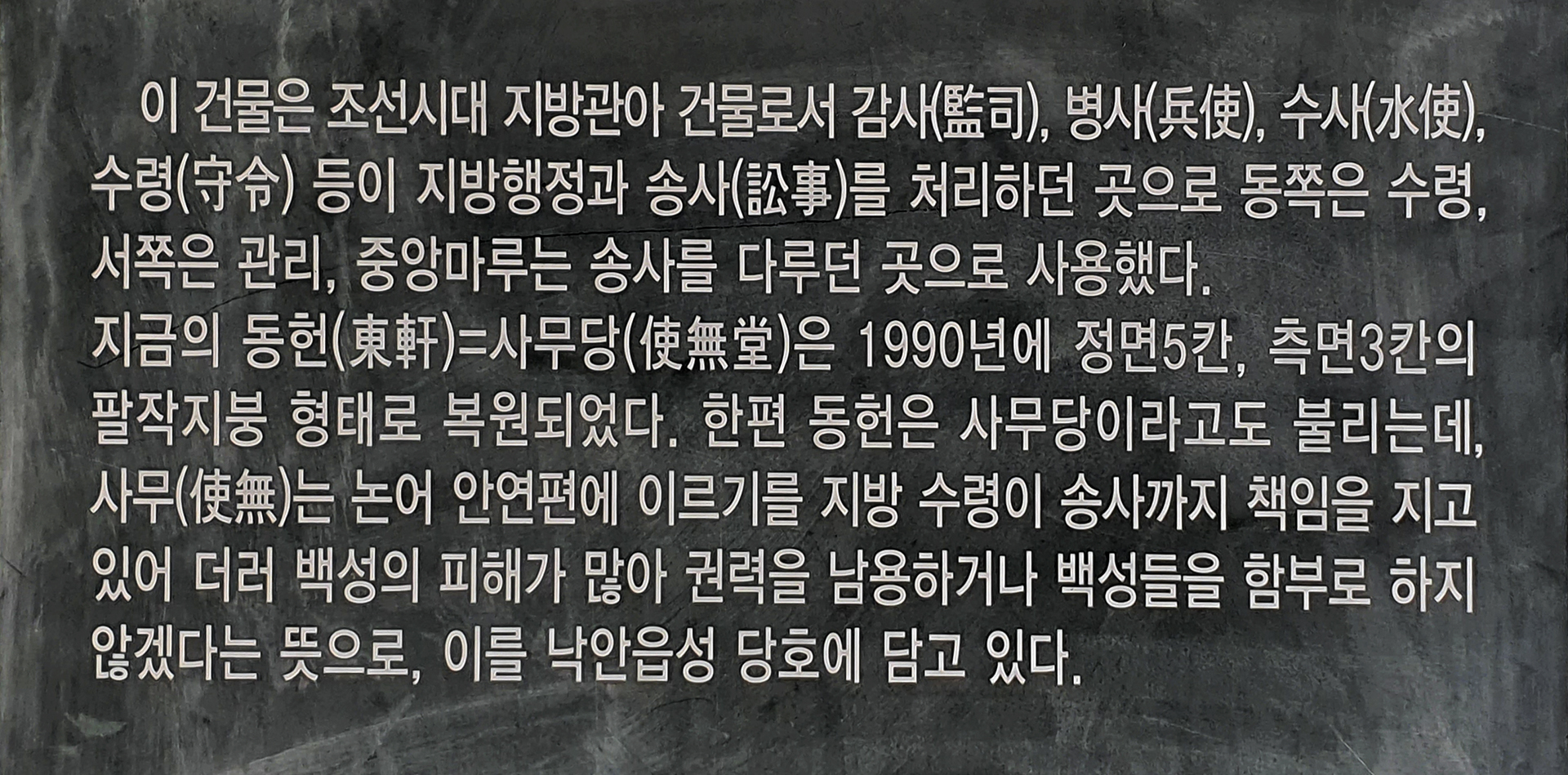 동헌에 들어오니 곤장을 치는 체험을 하는 열십자 모양의 형틀이 있다. 또한 인형으로 취조하는 광경을 묘사하였다. 상기 설명문을 보면 중앙 마루가 송사를 다루는 곳이라 쓰여 있기는 하다. 수령의 업무 중에서 하필이면 죄인을 취조하는 광경이니 권위적이고 부정적인 모습이라 눈에 거슬린다. 진취적이고 긍정적이며 현대감각에 어울리는 다른 모습을 연출하면 어떨까? 하는 생각이 든다.