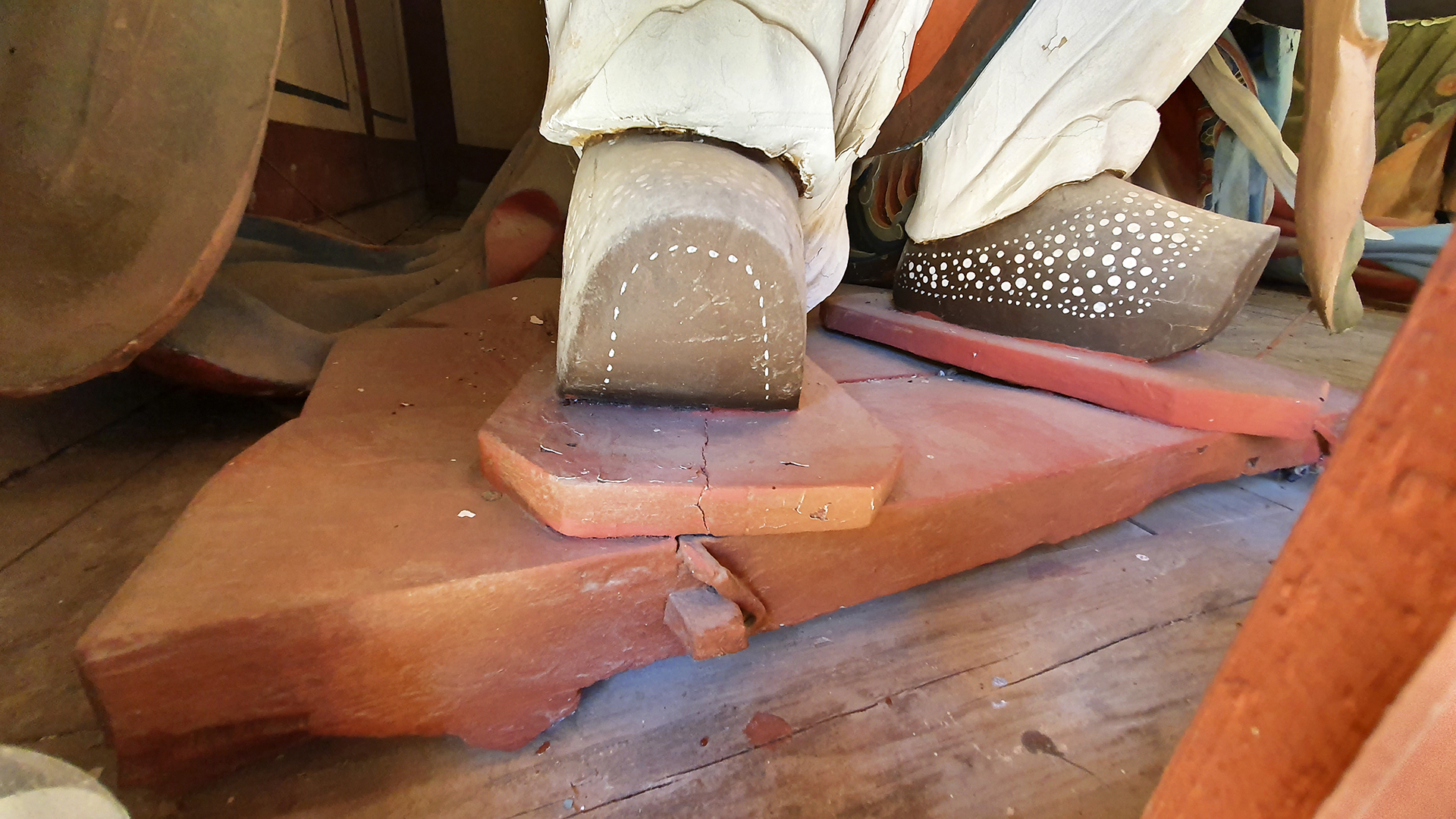 해설하시는 분의 설명을 들어보니 예전에 보림사 인근에 사셨던 나이 많으신 분들은 사천왕문을 열면 동방지국천왕과 남방증장천왕 앞에 있는 조각품이 양쪽에서 앞으로 튀어나오는 것을 보았다고 한다. 아래 사진의 기둥 상하부에 직사각형으로 기둥을 보수한 흔적이 문이 달렸던 흔적이라고 한다.