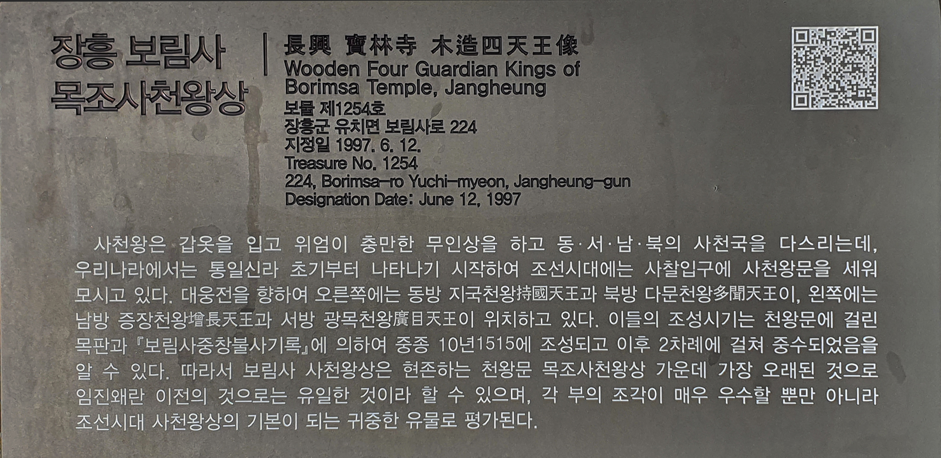 우리나라에 현존하는 천왕문 목조사천왕상 가운데 가장 오래된 것으로 임진왜란 이전의 것으로는 유일하다고 한다. 조선시대 사천왕상의 기본이 되는 유물로 평가된다고 한다. 해설하는 분의 설명을 들어보니 다른 사철의 사천왕상보다 표정이 온화하다고 한다.