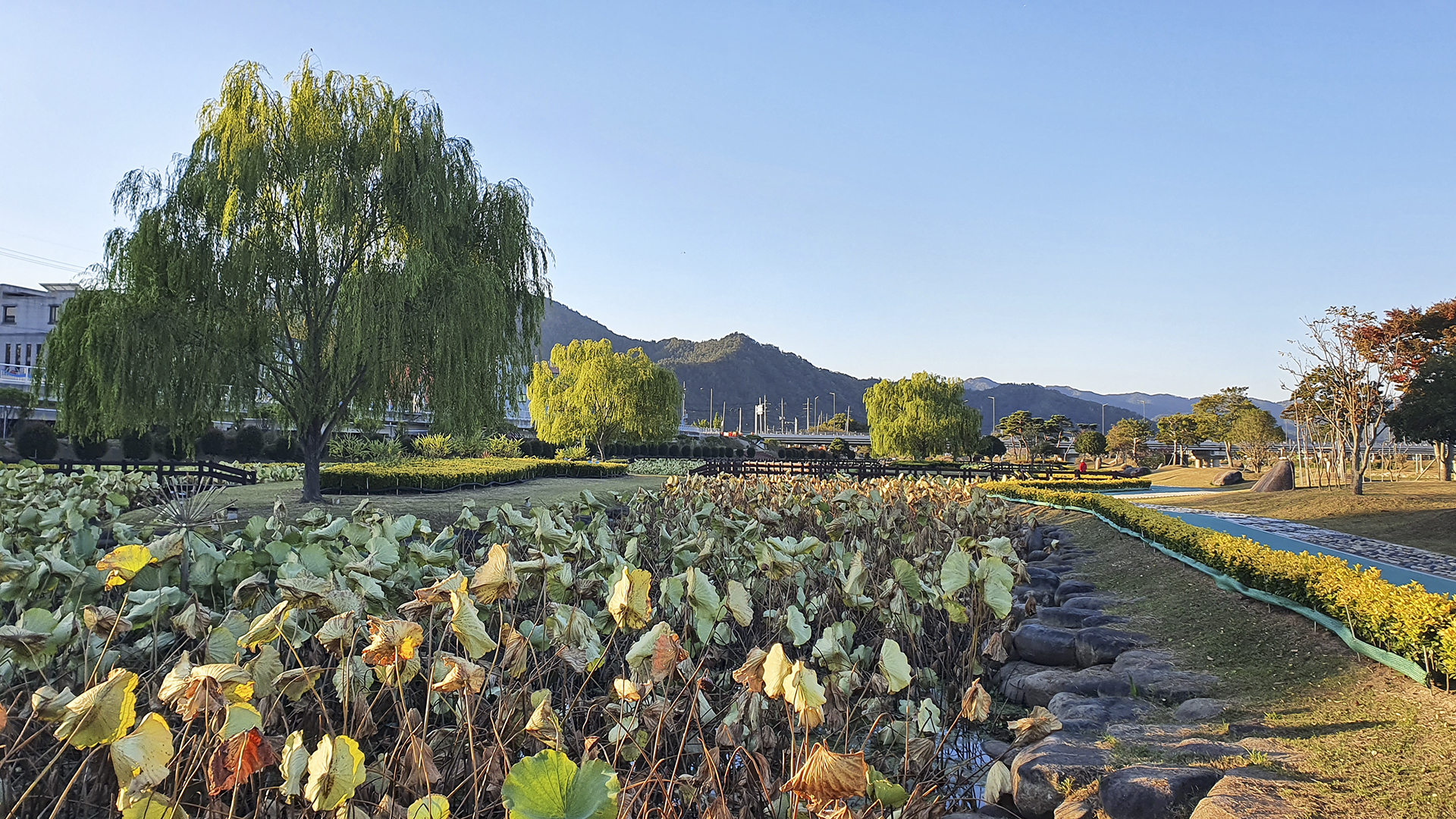 탐진강둔치공원으로 아침 산책을 다녀왔다. 아침햇살에 강변 풍광은 가을 색이 짙어지고 있다. 넓은 둔치공원에 아주머니 한 분이 걷고 계실 뿐이다. 조용하다.