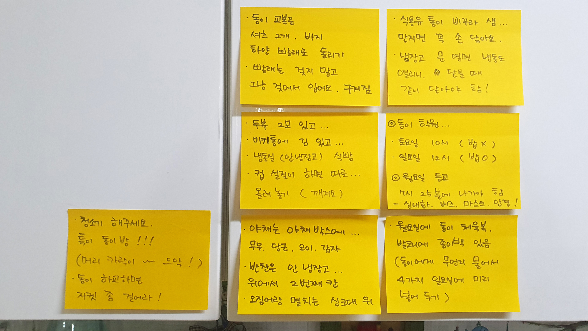 오랜만에 초록집(서울집에는 (청?)개구리공예품이 많기에 작은집 손자 Jun이 지은 이름)에서 주말까지 지내게 되었다. 내가 집에 있는 틈을 타서 딸이 대전 성북동집을 다녀오겠다고 한다. 시들어가는 국화뿐인 꽃밭은 볼품이 없고, 텃밭도 가을걷이가 마무리 단계이니 구경하러 가는 것은 아니다. 어머니를 거들어서 겨울준비를 하고, 김장용 배추와 알타리 무도 수확하고, 다년생 화초도 옮겨 심으러 가는 것이다. 딸이 성북동집에 관심을 갖고 여건이 될 때마다 다녀오려고 하니 나도 흐뭇하다. 딸이 초록집을 비운 동안 해야 할 일을 알아보기 쉽게 포스트잇에 메모해서 싱크대 상부장에 붙여놓았다.