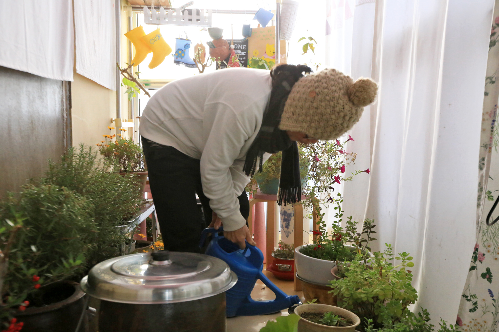 성북동집을 철수하기 전에 아내는 본채 데크에 들여 놓은 화초에 물을 준다.
