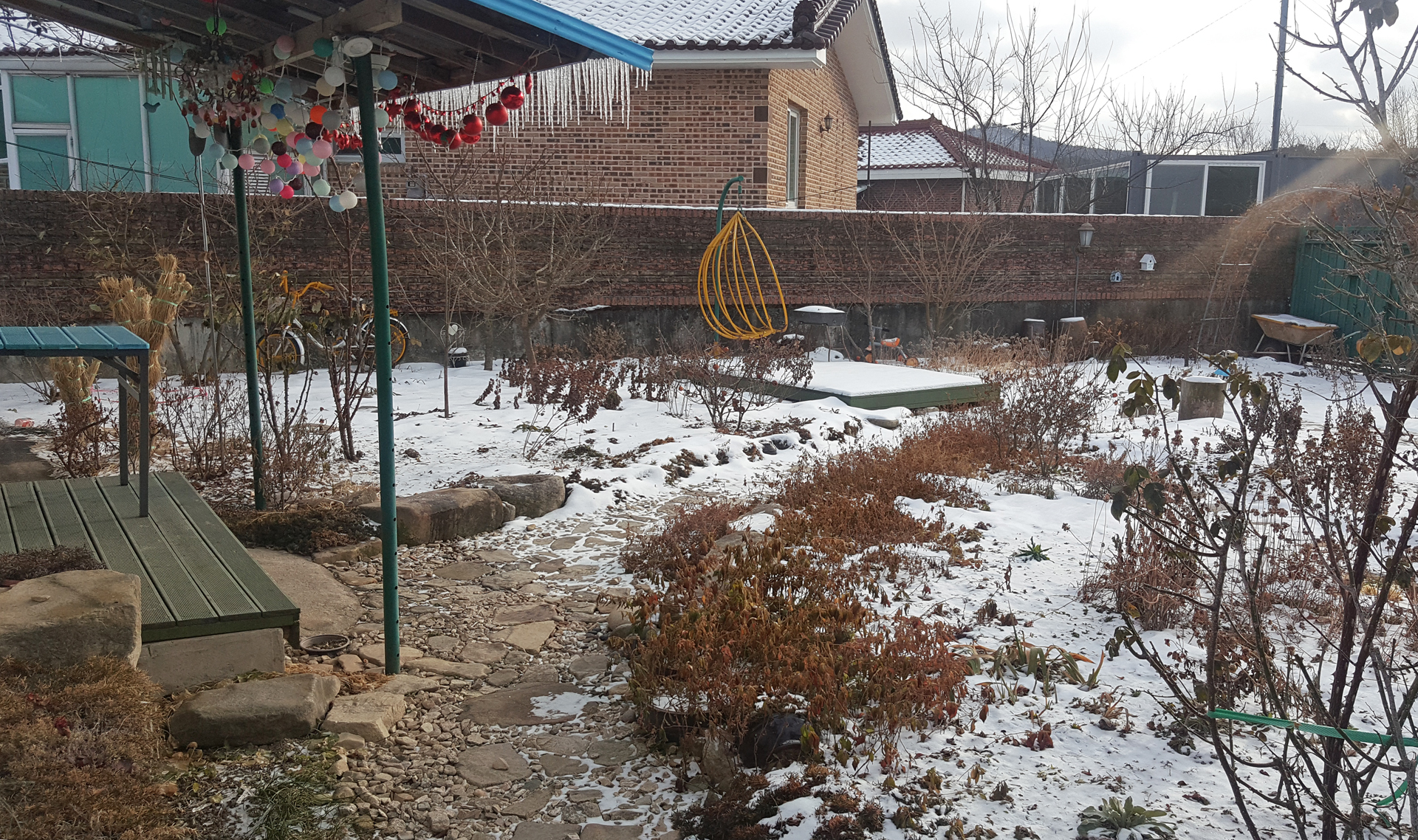3주일 전(20221203)에 서울집에서 겨울을 나기 위하여 성북동집에서 철수하였다. 매일 밥을 먹으러 오던 까망이(고양이)는 어찌 지내는지 궁금하다. 성북동집에서 지낼 때에도 철수할 때를 대비하여 먹이는 간식 정도의 양만 주었었다. 그래도 버릇처럼 나타나던 녀석인데 궁금하여 가끔 CCTV를 확인해보곤 하였는데 보름 전쯤 갑자기 동작을 멈추어버렸다. CCTV자체의 문제인지 무선공유기의 문제인지 모르겠지만 겨울철이라 기온이 낮아서 생긴 문제가 아닐까? 성북동집에 다녀와야 할 텐데 직장문제로 시간을 내기가 여의치 않았는데 대신 WS가 시간을 내 주었다. 무선공유기의 기능을 회복시키고, 본채 데크에 들여놓은 화분에 물을 주고 . 단지 속에 설치한 발열전구가 단선된 것을 교체하고, 성북동집 사진을 찍어서 보내주었다.