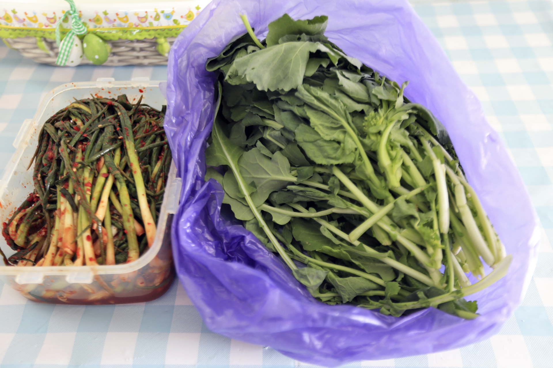 이웃 누님이 운동하고 돌아가는 길에 들리셔서 파김치 먹느냐고 묻고 가셨다가 파김치와 유채를 가지고 다시 오셨다. 잘 먹겠습니다.