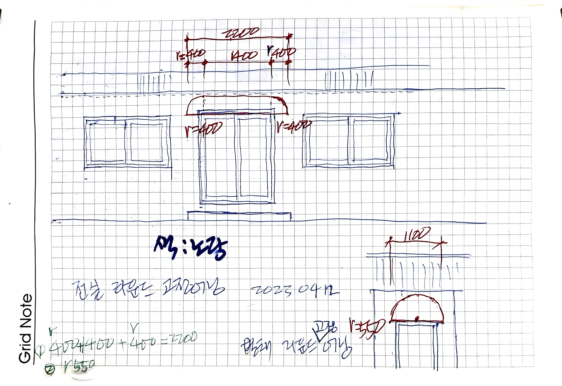 천막사로 떠나기 전에 아내와 상의하여 전실은 라운드형을 포기하는 대신 앞쪽으로 더 빼고 색상도 빨간색으로 바꾸는 것을 제2안으로 생각하자고 하였다. 천막사에 도착하여 제2안으로 확정하는 대신 가격도 낮추고 차양의 역할도 좀 기대할 수 있게 되었다.