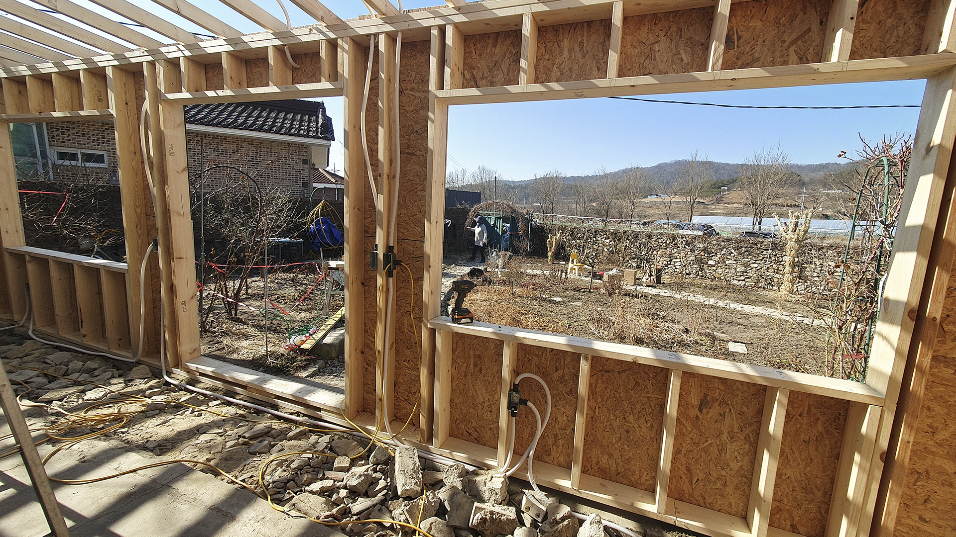 어닝을 설치할 부분의 목구조체(벽틀은 2"×6" 지붕틀은 2"×4")는 시공 당시의 사진으로 확인하였다.