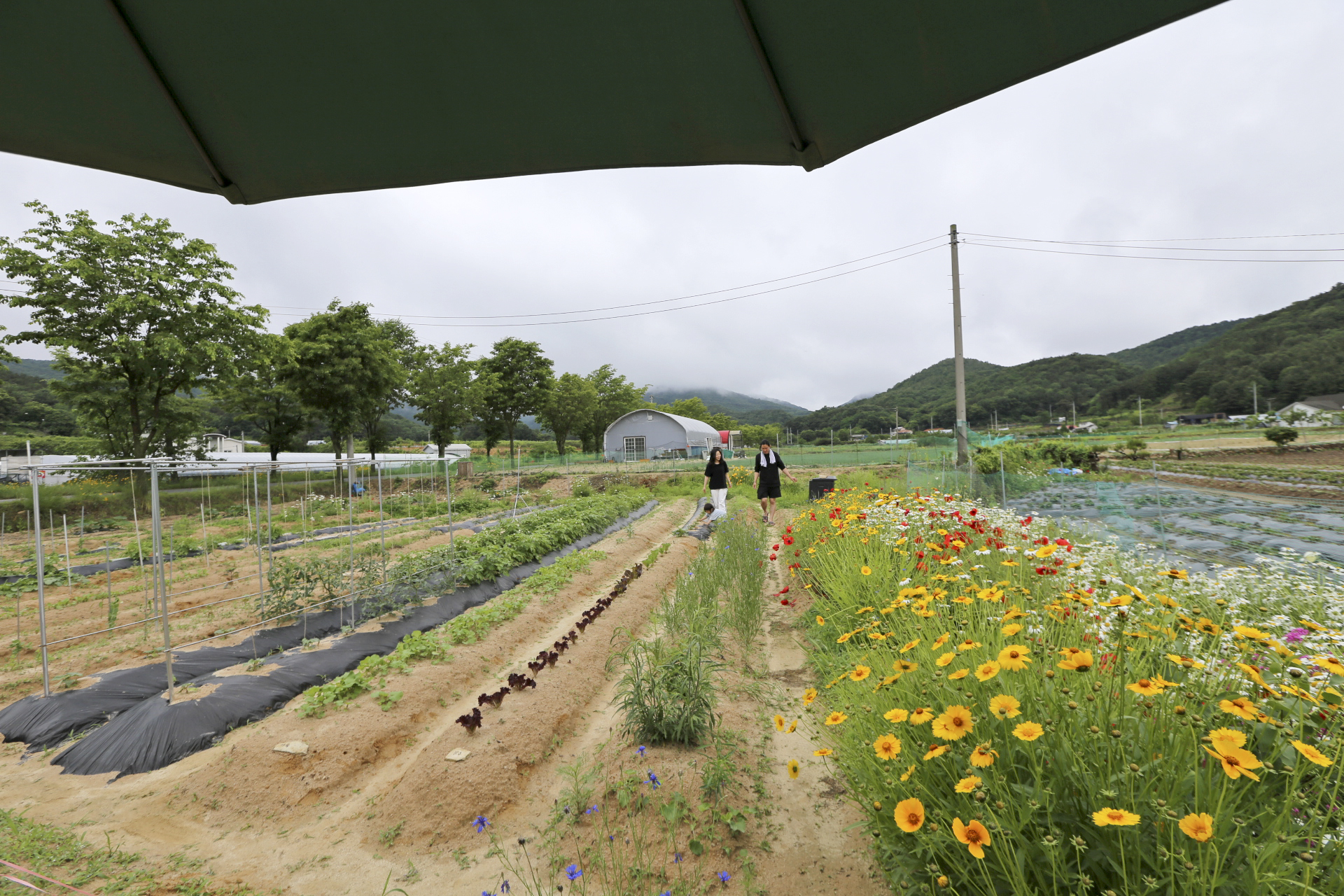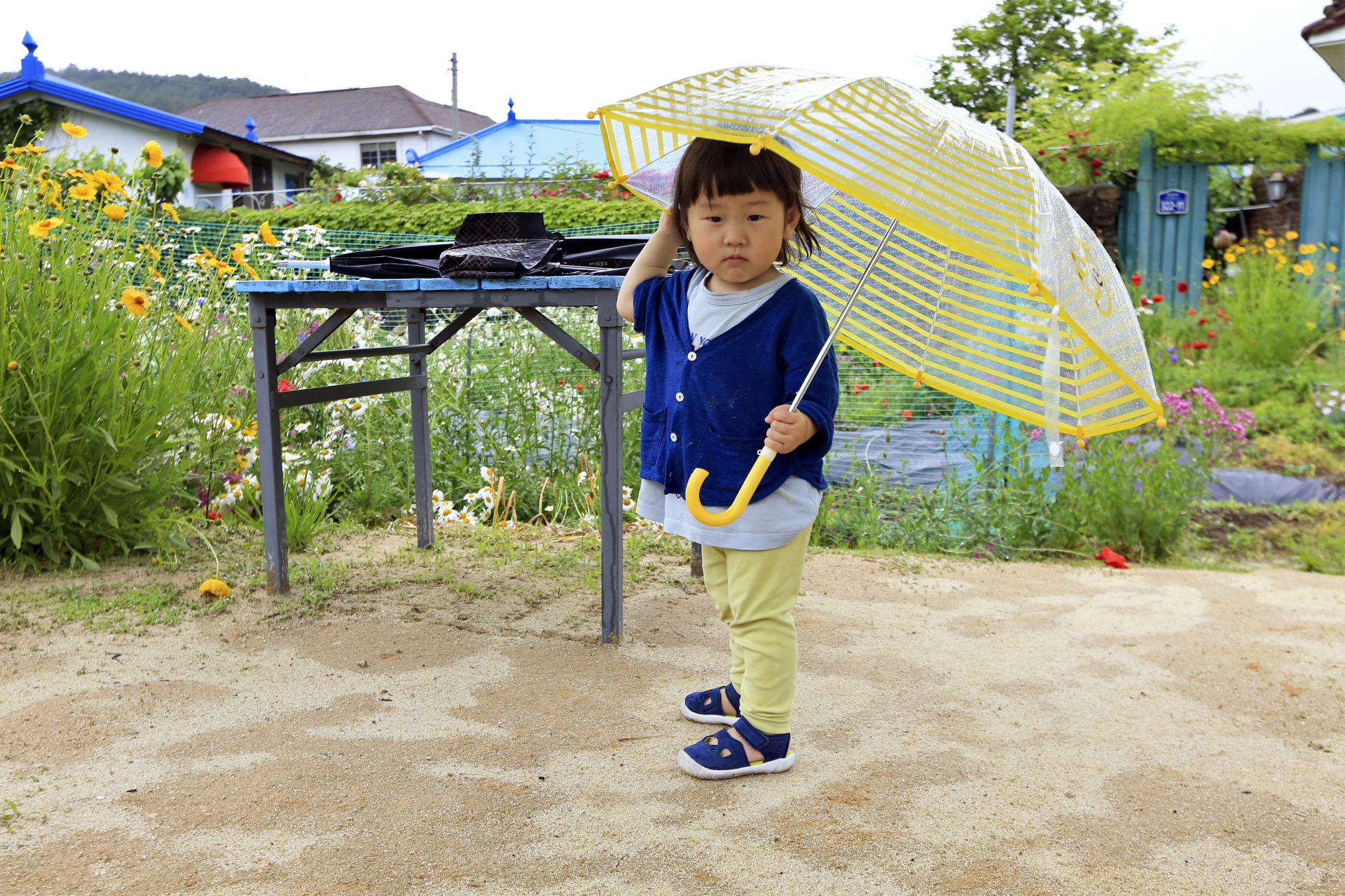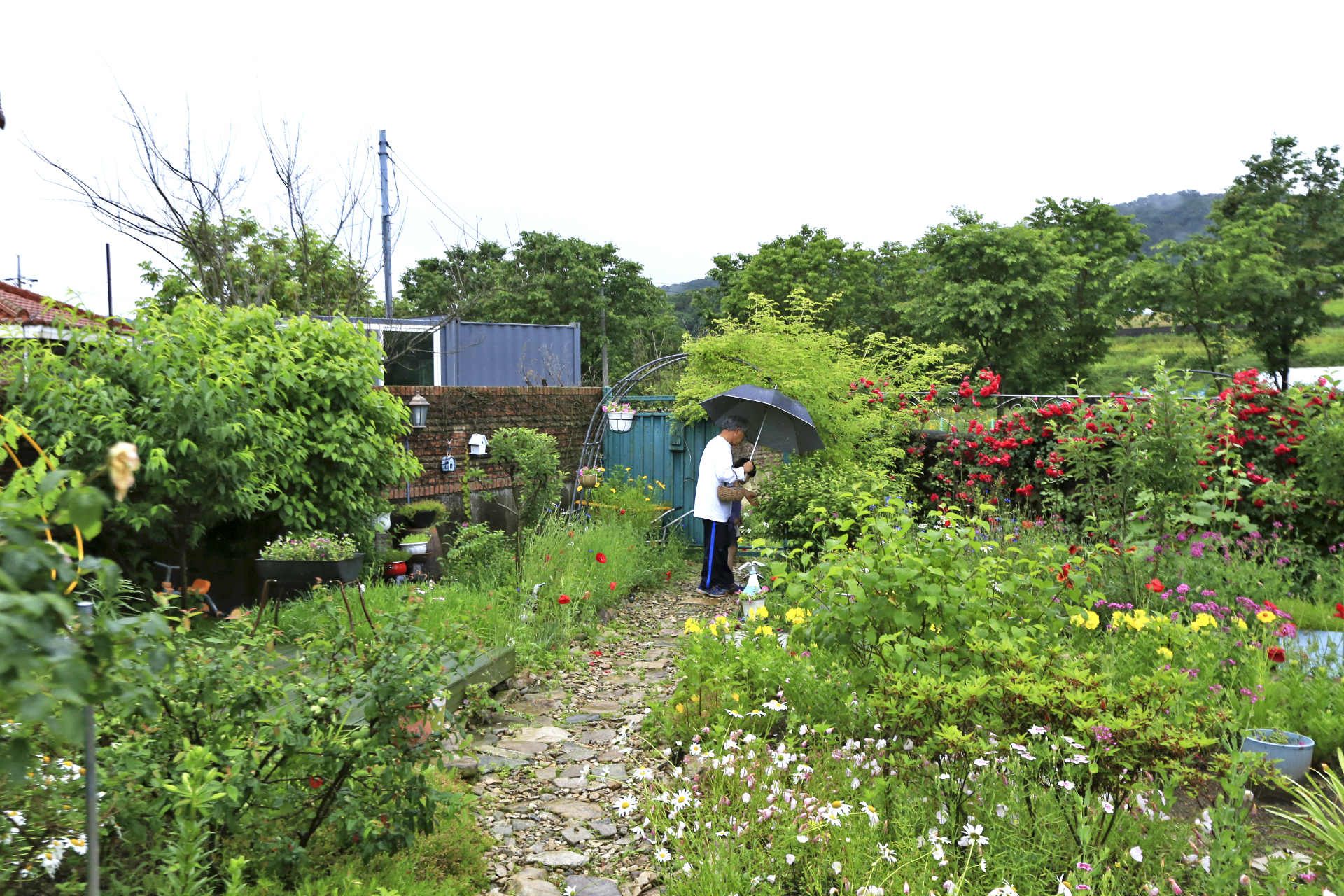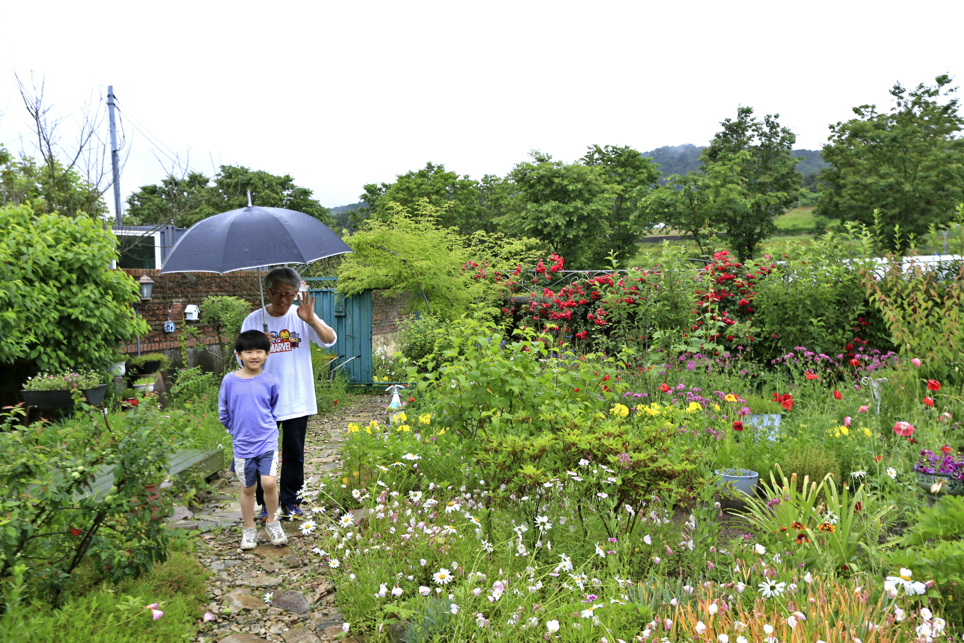비가 오지지만 우산을 쓰고 함마니가 가꾼 꽃밭을 돌아보았다.