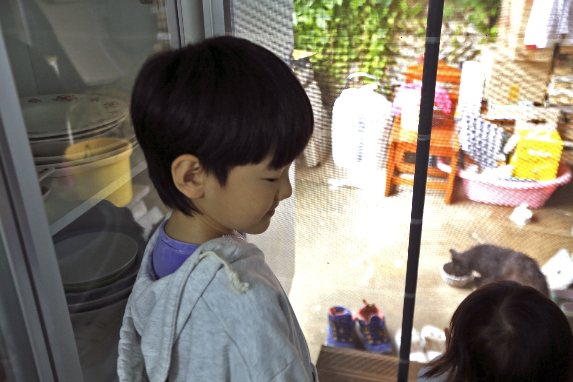 길양이 까망이가 밥을 먹으러 왔다. Jun과 Seung이 보는 앞에서 밥을 먹었다.