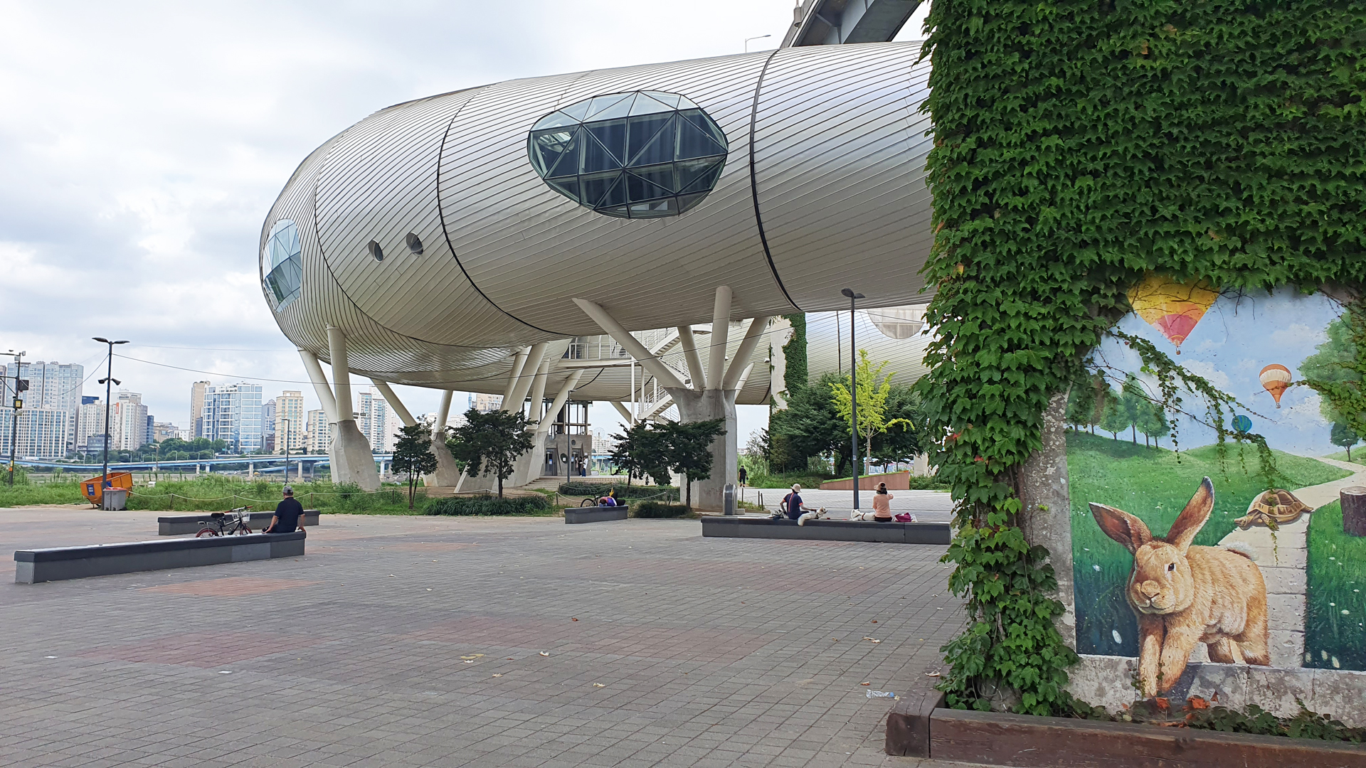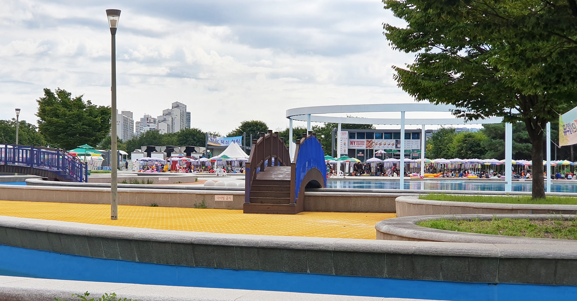 멀리 보이는 뚝섬수영장이 북적여 보인다.