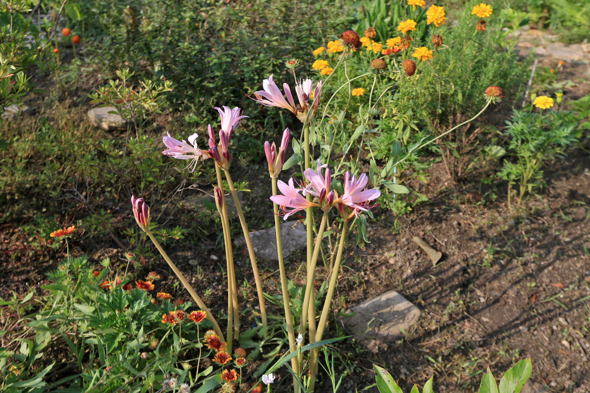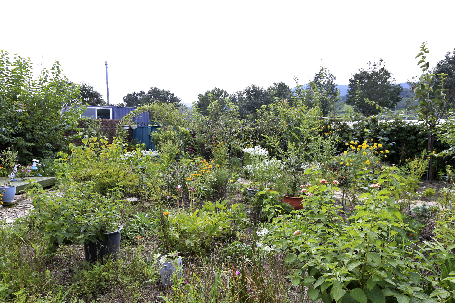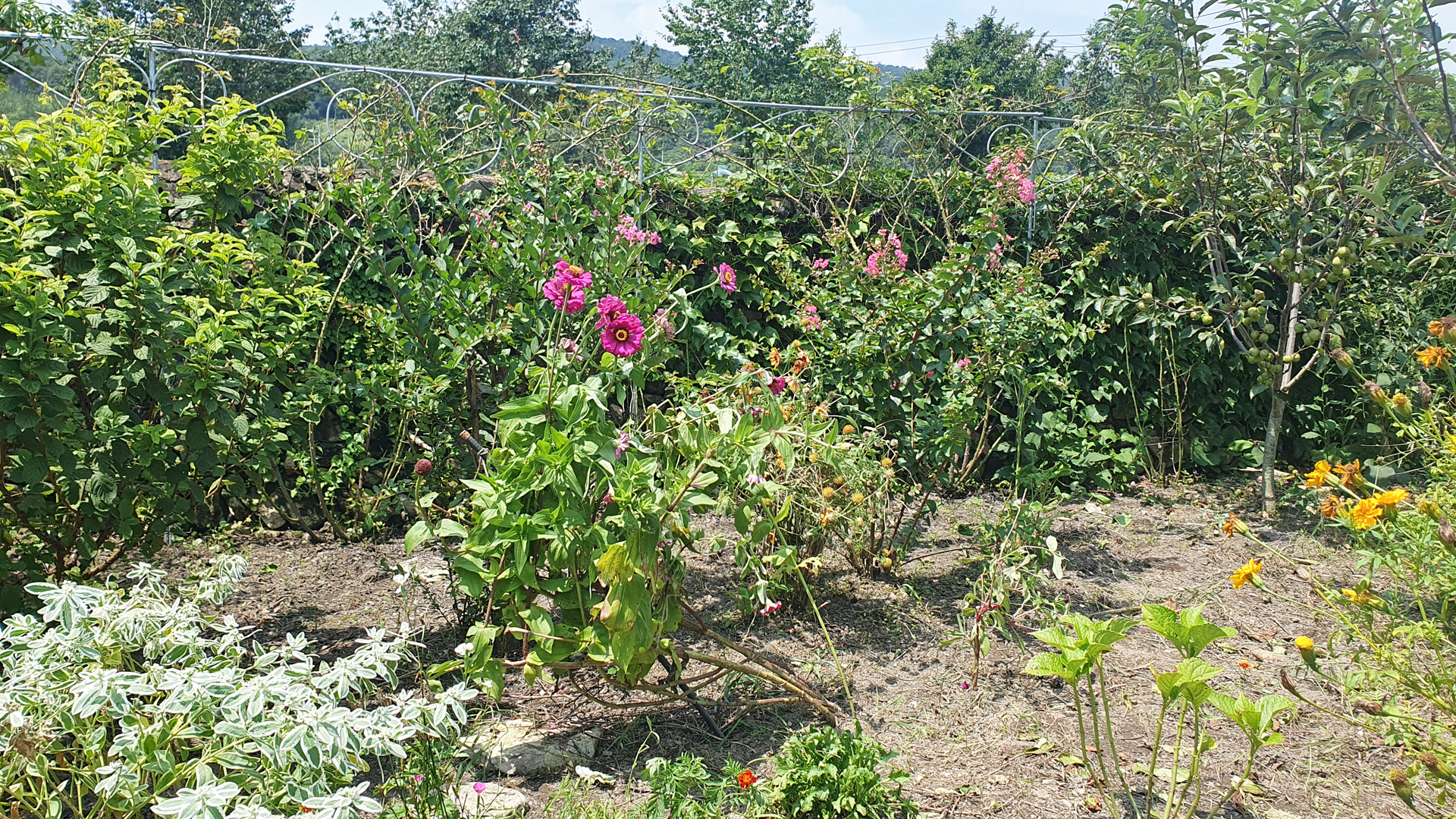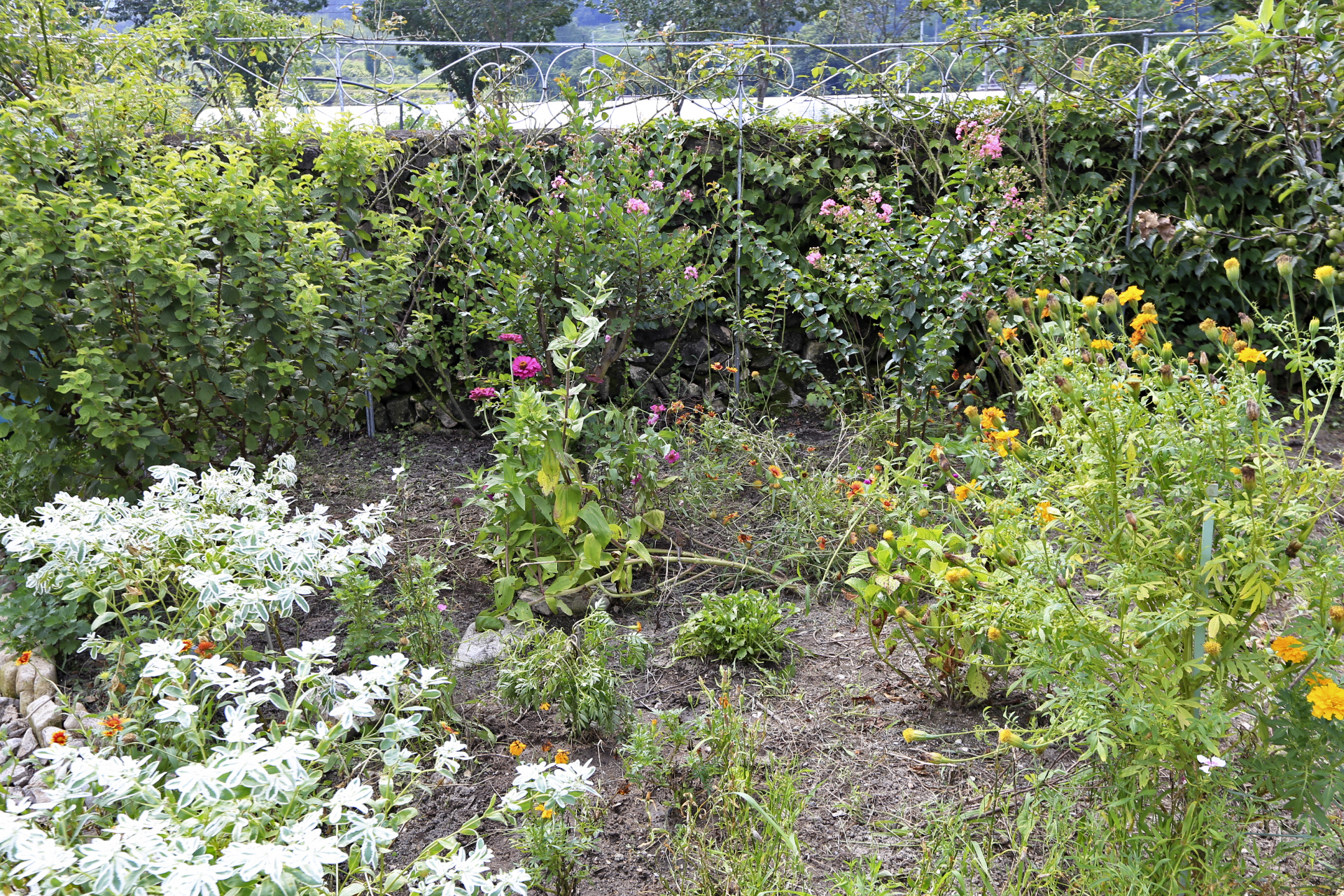 울안 꽃밭의 풀을 모두 뽑지는 못하였지만 50여일 만에 드디어 꽃밭 기분이 든다. 예년에 비하면 초라하지만 메리골드, 설악초, 인디언국화, 배롱나무, 란타나, 나팔꽃, 사피니아 이외에 백일홍, 천일홍, 채송화, 봉숭아, 도라지꽃도 피었다.