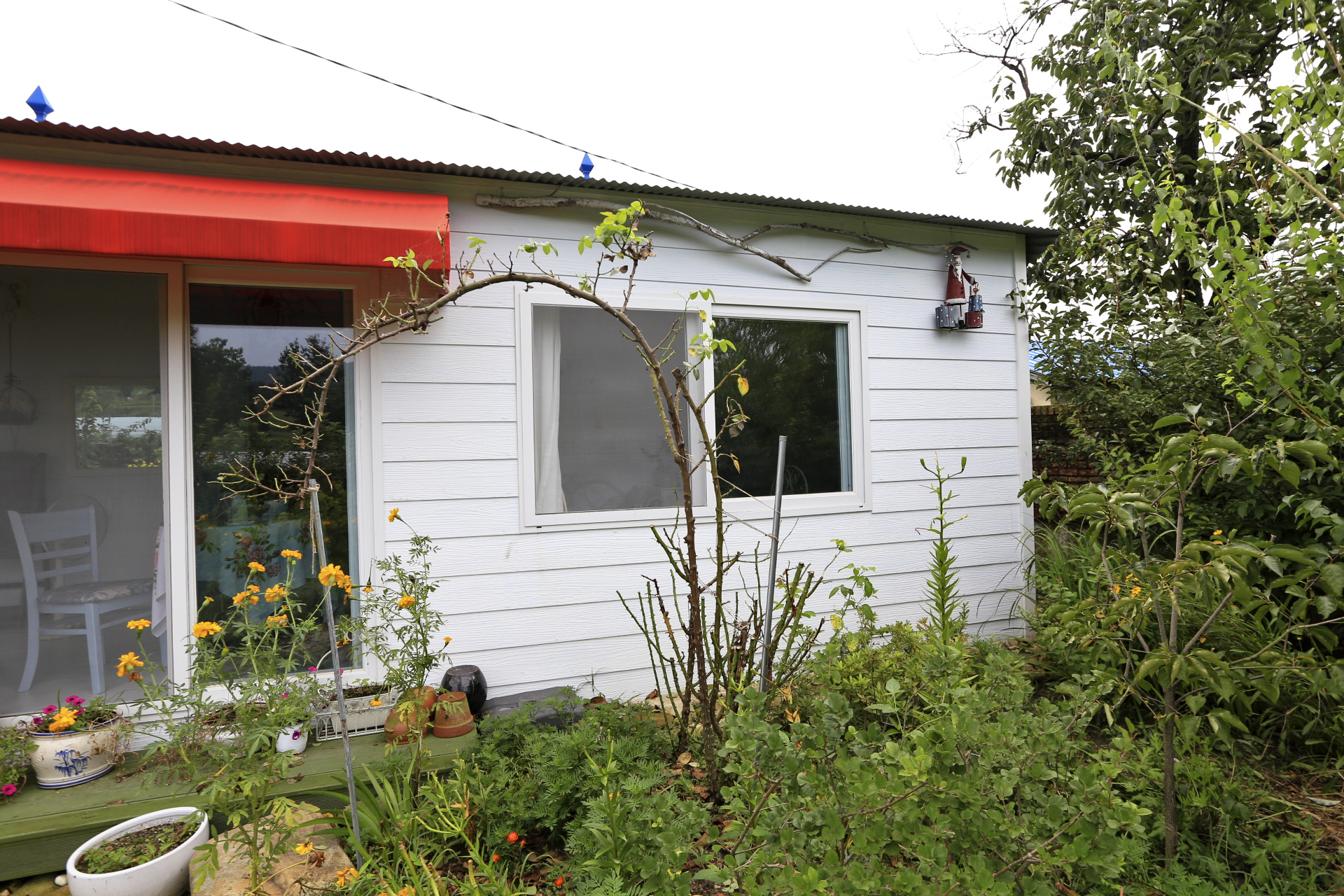 본채 앞 장미넝쿨은 전실을 고치기 전인 작년까지는 차양 옆에 붙여서 지붕 방향으로 넝쿨을 유도하였다. 올 봄에 전실공사를 할 때 잘라내기가 아까워서 지지대를 설치하고 임시로 휘어서 묶어 주었었다. 평년보다 꽃이 탐스럽게 많이 피어서 이제까지도 가지를 휜 상태로 웃자란 가지만 전지작업을 해 주었었다. 그런데 이번태풍 카눈의 영향으로 장미 넝쿨이 바깥쪽으로 기울어졌다. 이대로 방치 할 상태가 아니기에 전실 창문에서 꽃밭이 잘 보이도록 한 줄기만 남기고 짧게 잘라 주었다.
