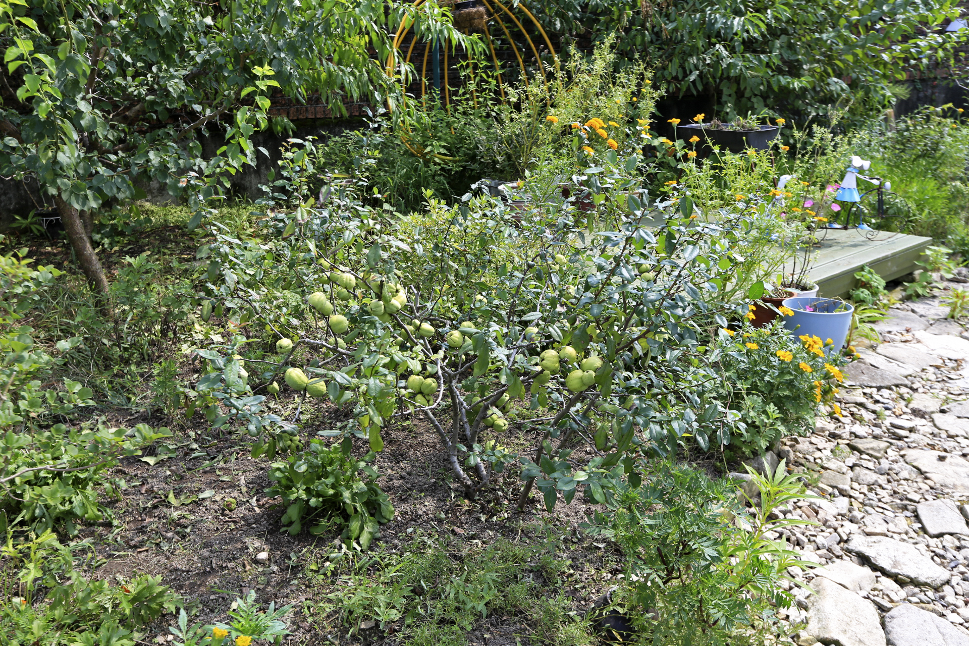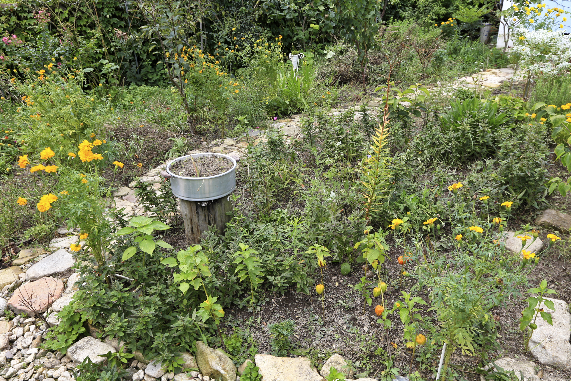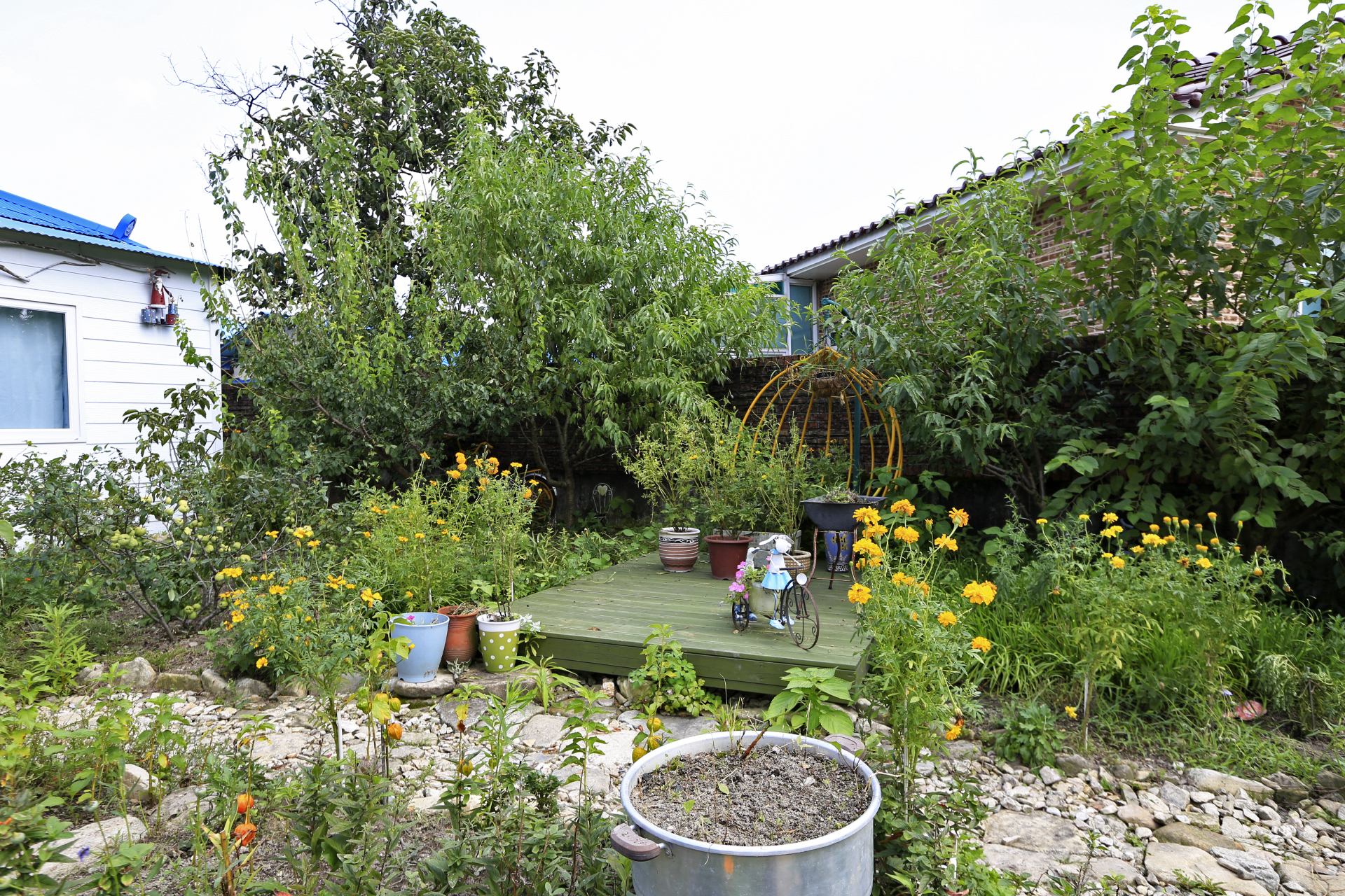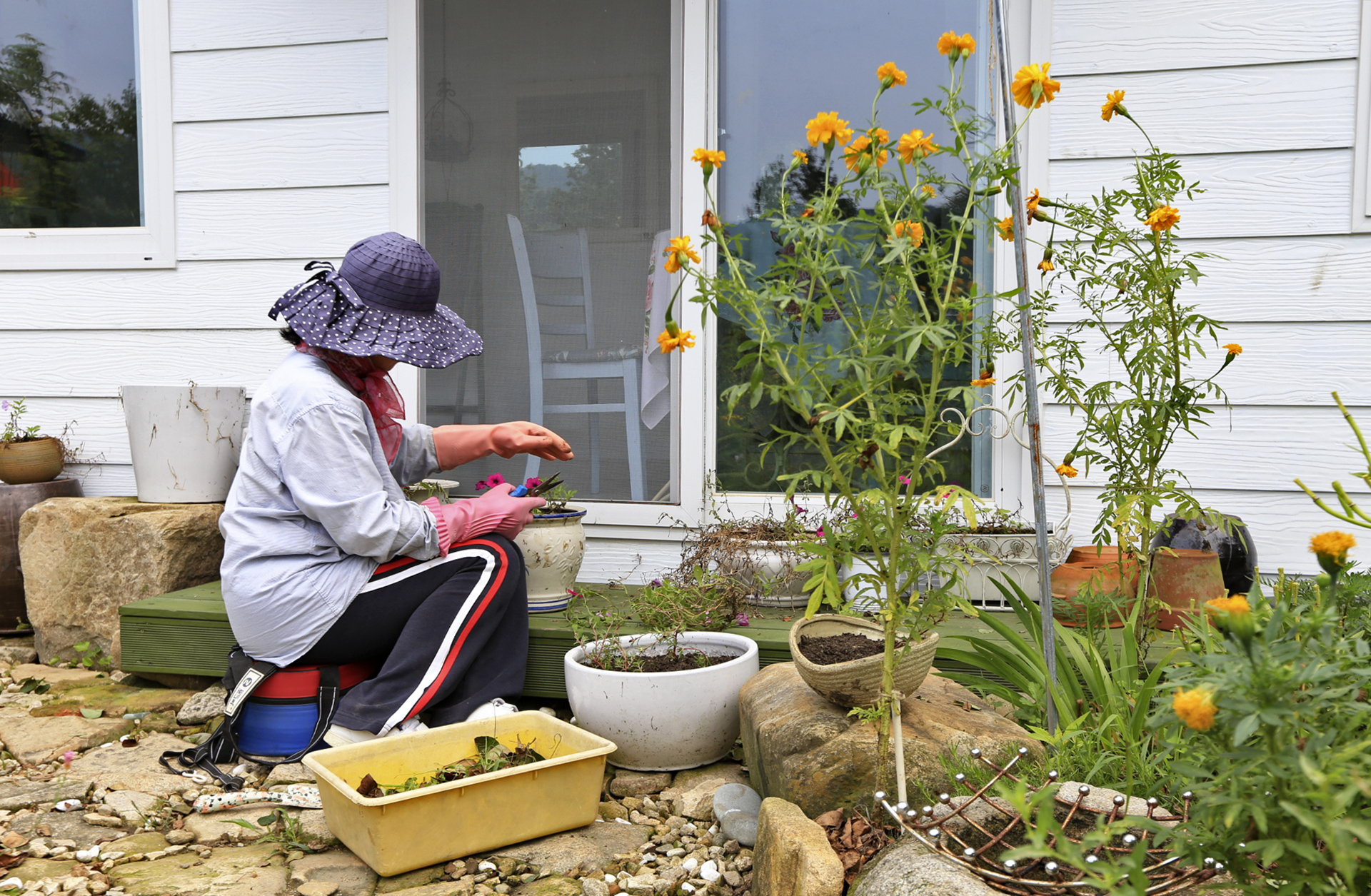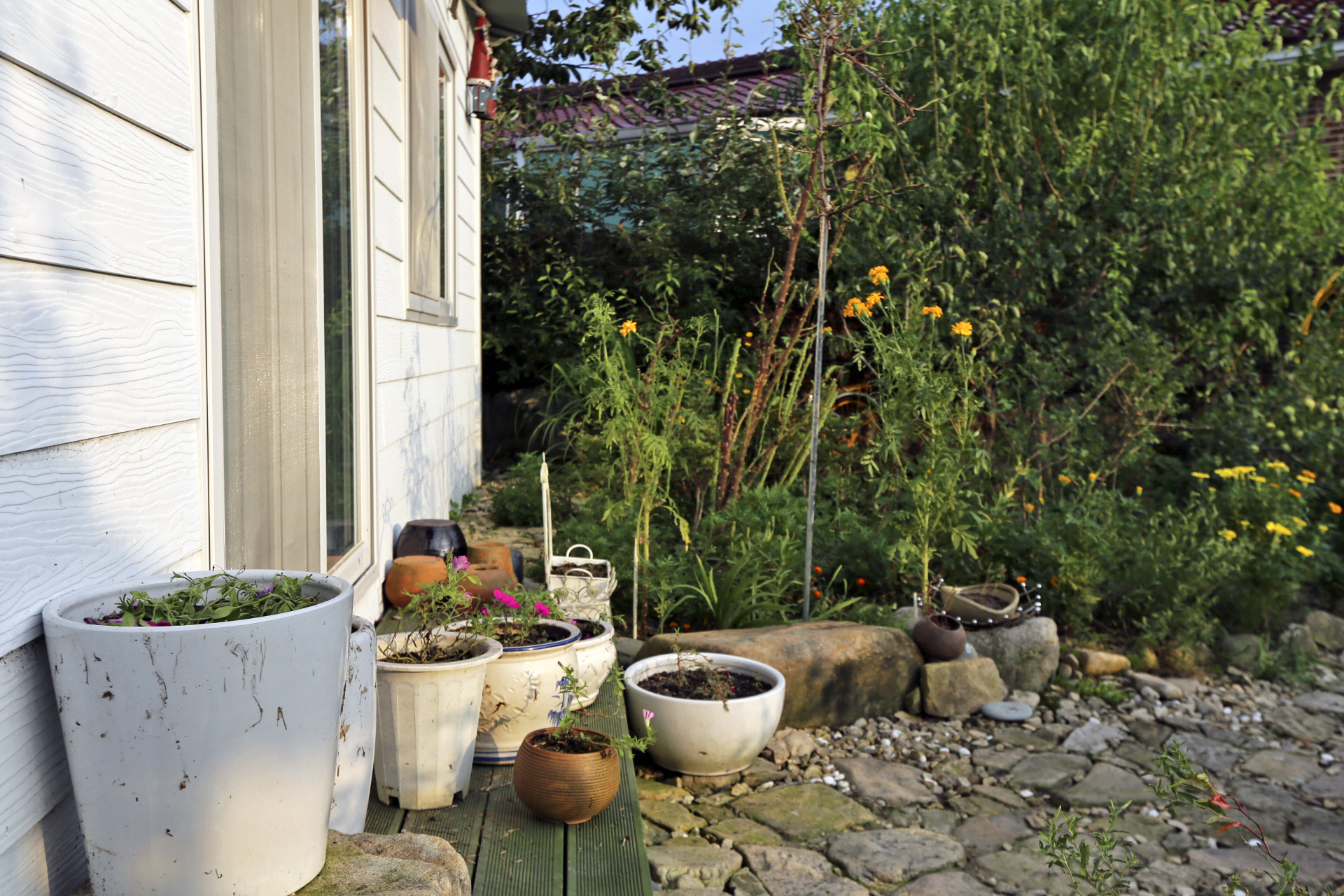 꽃밭 풀뽑기를 하고 나무 밑에 있는 메리골드와 화분에 있는 메리골드를 꽃밭에 옮겨 심었다. 일부는 화분 채로 땅을 좀 파고 묻었다.