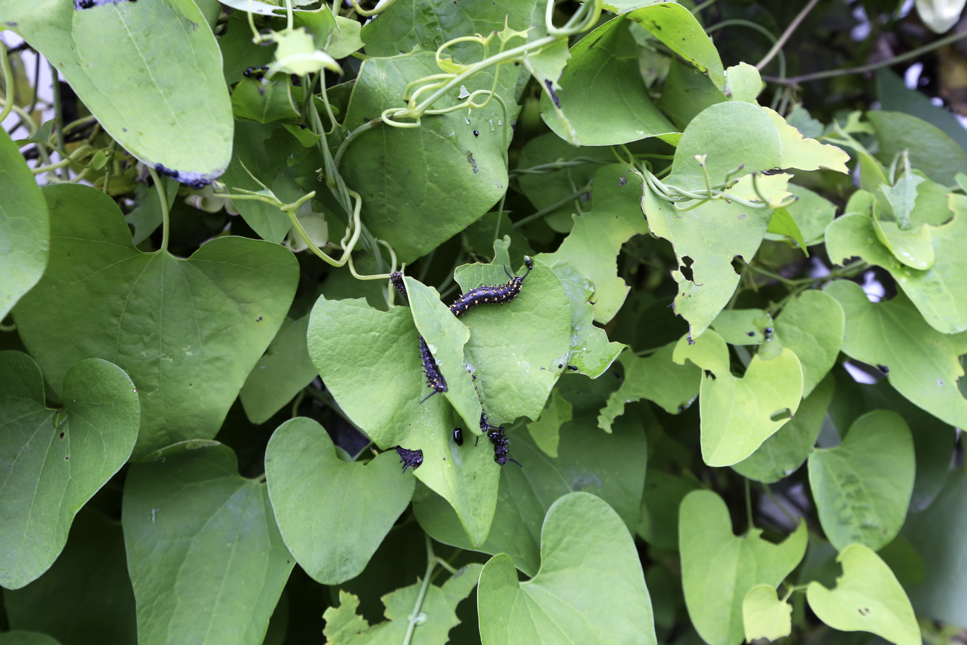더덕 넝쿨이 감고 올라가도록 줄을 매 주었는데 마 넝쿨도 타고 올라간다. 마 넝쿨이 올라간 곳의 더덕 넝쿨은 재대로 자라지도 못한다. 당연히 마 넝쿨은 제거대상인데 올해는 집을 비우게 되어 제거작업을 해 주지 못하였다. 그런데 마 잎사귀를 먹어치우는 시커먼 벌레가 우글거린다. 하루를 푹 쉬려고 하였는데 어쩔 수 없이 오후에 더덕과 마 넝쿨에 농약을 살포하였다.