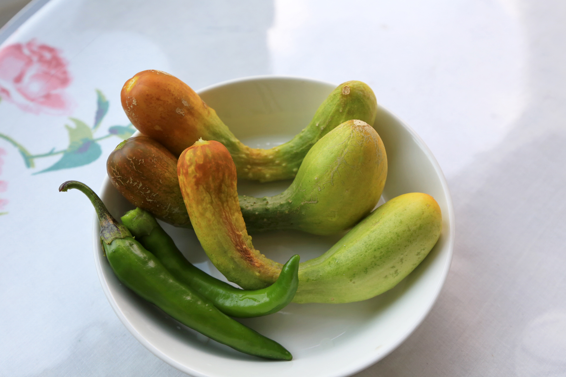 이번에는 앞밭에서 풋 고추 몇 개와 끝물 오이 3개 따 먹은 것과 자잘한 가지 5개? 따 온 것이 전부이다. 두 달 넘게 앞밭을 가꾸지 않았으니 당연한 결과가 아닐까 하면서도 아쉽다. 올 해는 아내가 제대로 일 할 형편이 아니라서 김장배추는 포기하고 무나 알타리무 정도만 파종할까 한다.