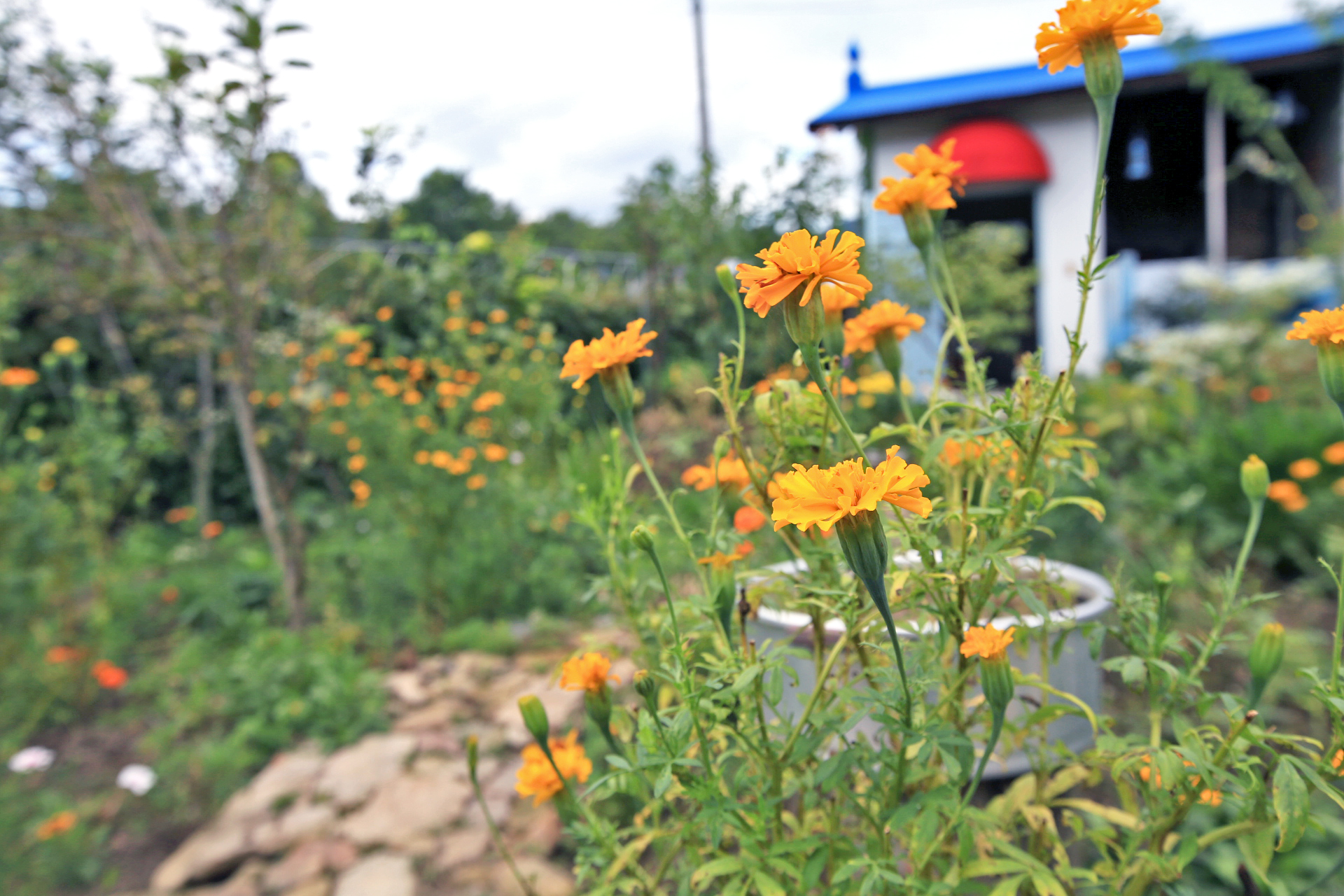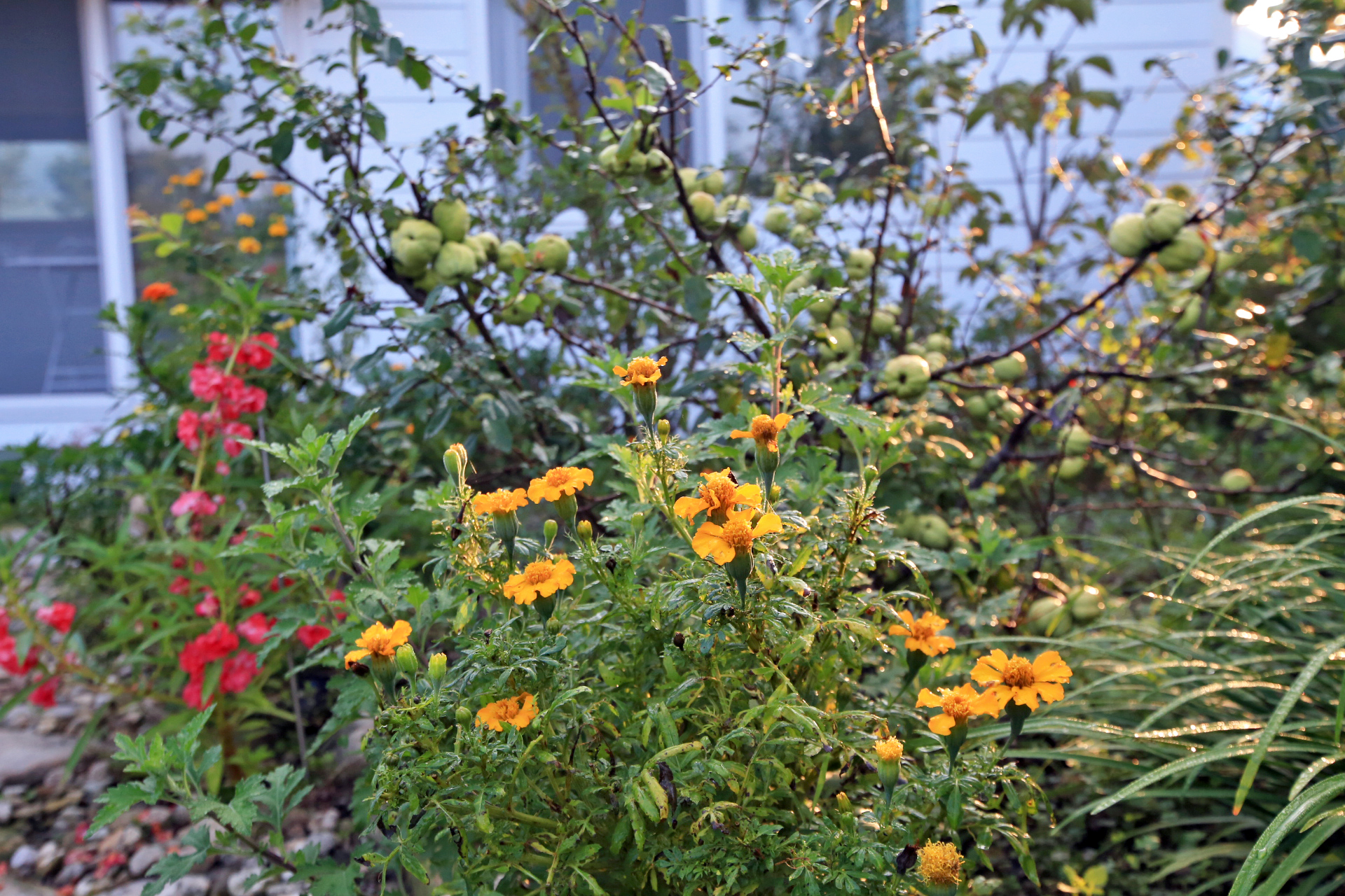 두 달 넘게 제대로 돌보지 않았으니 무엇을 더 바라랴 하면서도 미련을 버리지 못하겠다. 그래도 주말이면 성북동집에 가서 모기에 물리면서 더위를 무릅쓰고 풀을 뽑지 않았던가? 작년 이맘때에는 메리골드 설악초 백일홍 천일홍이 한창이었을 텐데 하는 생각이 들곤 한다. 그래도 풀 뽑기가 이루어지고 아내가 메리골드를 옮겨 심은 덕분에 이 정도라도 꽃밭의 면모를 갖추게 되었다. 이맘 때 어디 가서 이 정도라도 꽃을 보기는 쉬운 일이 아니리라.