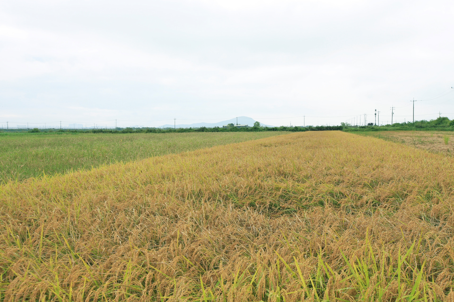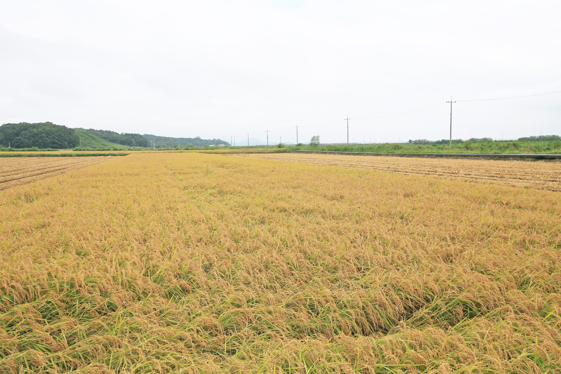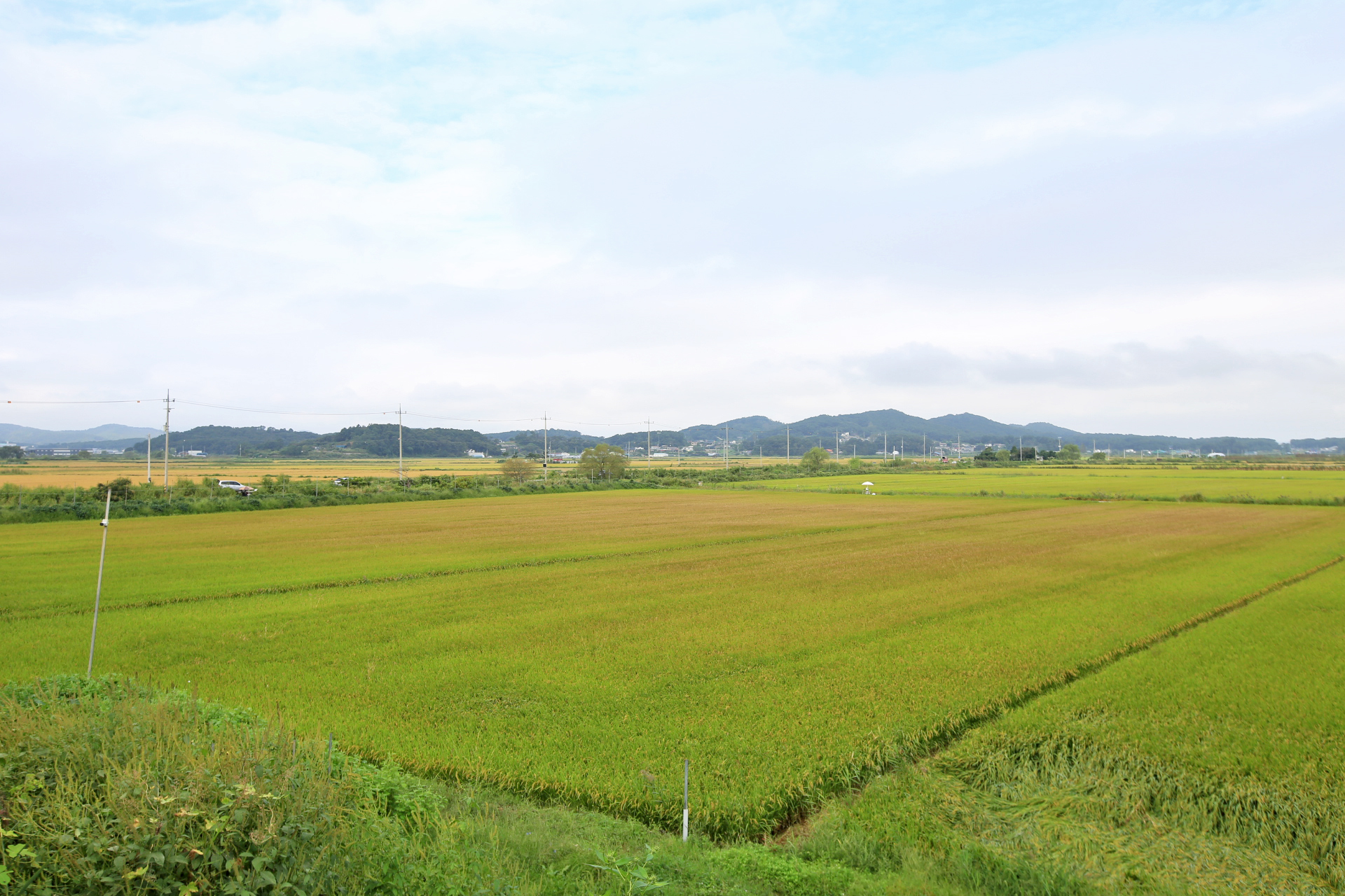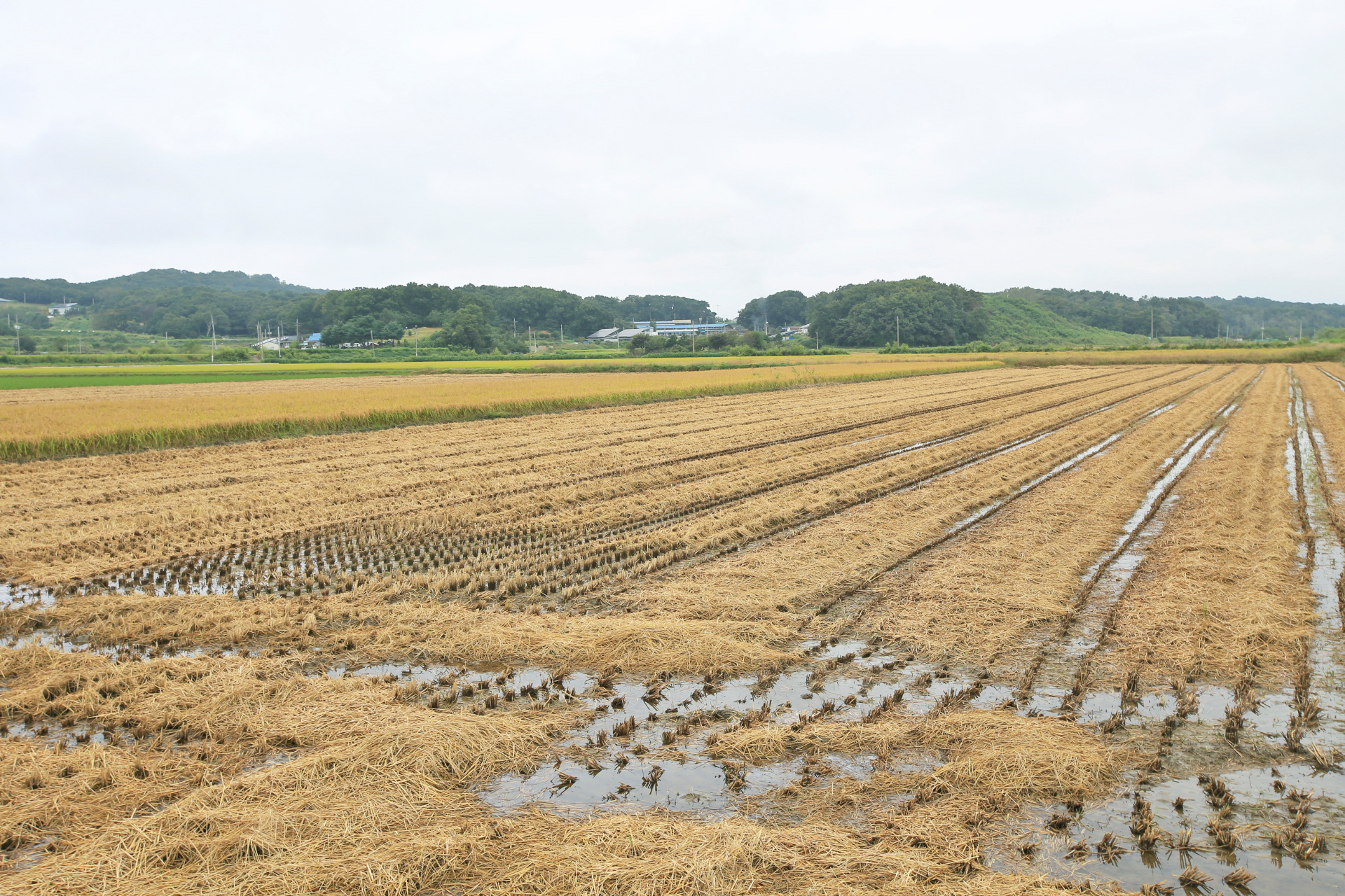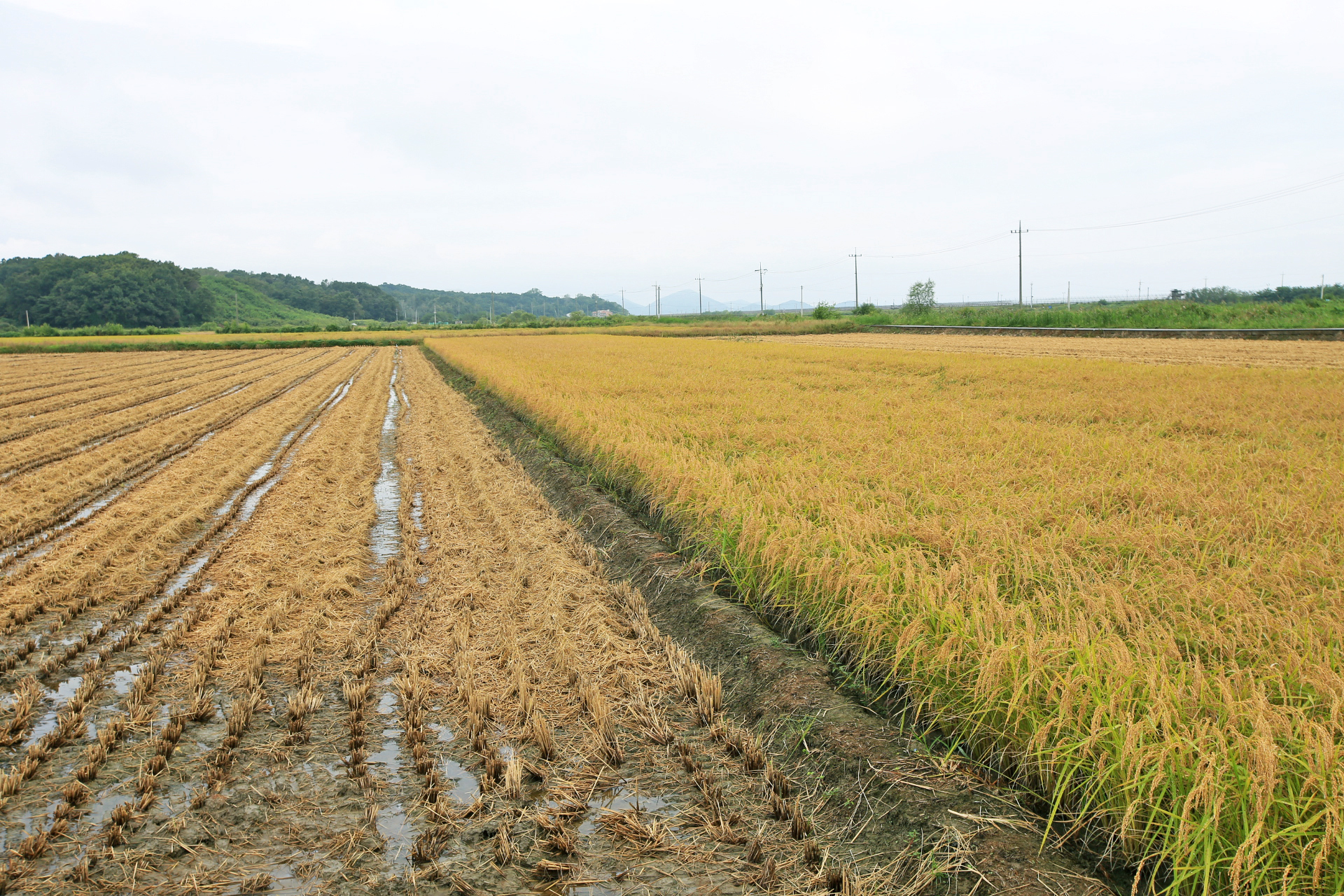 벼가 누렇게 익었고 이미 추수가 끝난 논도 있다.