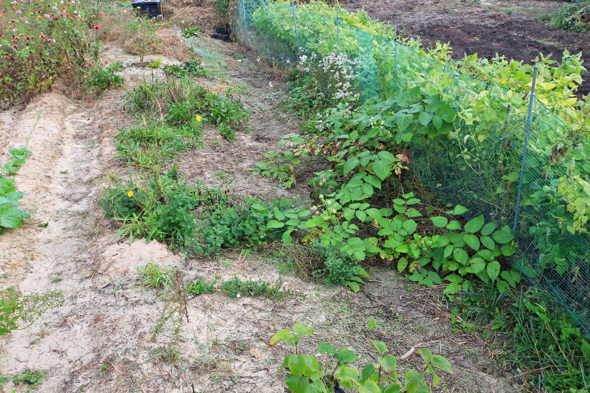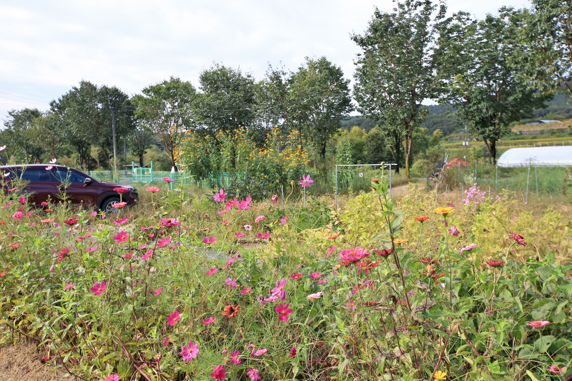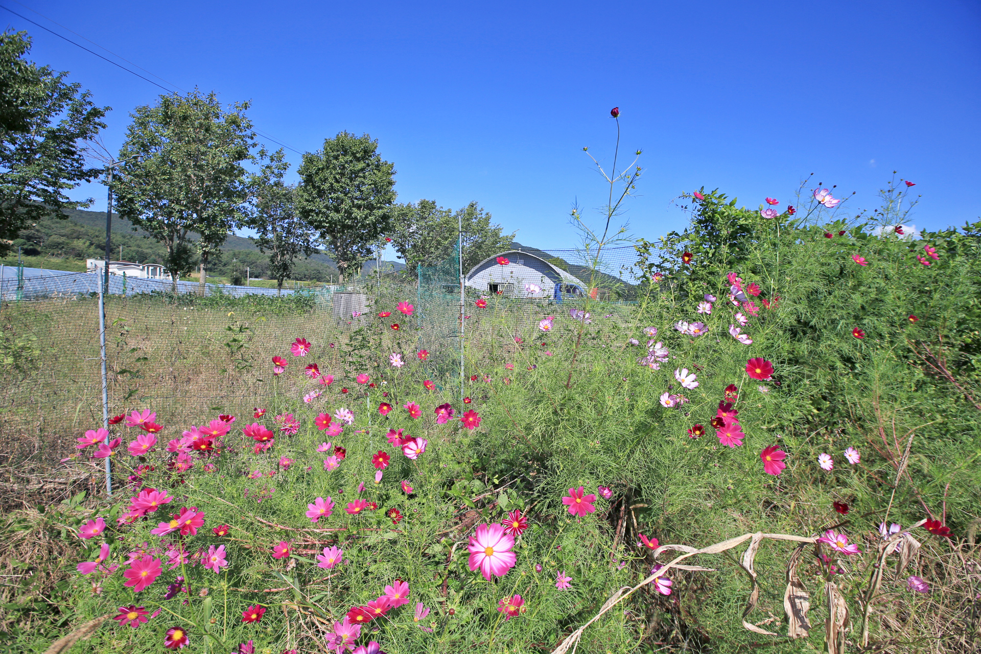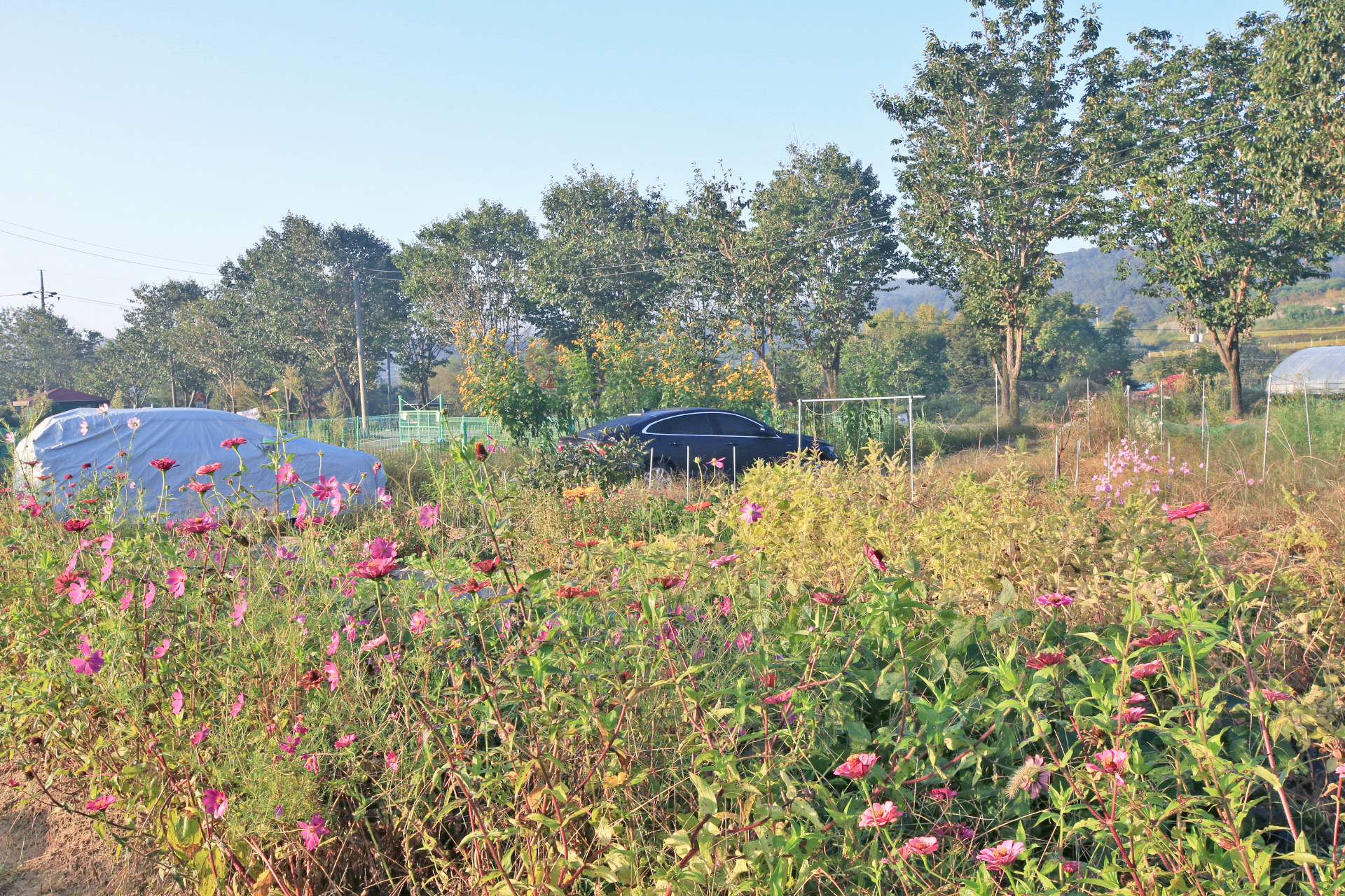 작년 늦가을까지 농사를 짓던 텃밭을 인계하고 대신 그 앞에 있는 밭을 사용하게 되었다. 텃밭과 구분하기 위하여 '앞밭'이라고 부른다. 작년 초겨울에 마늘을 심는 것을 시작으로 올해 이른 봄에 로타리를 친 후 농작물을 재배하기 시작하였다. 앞밭 주변에는 텃밭에 있던 다년생 식물도 옮겨 심고, 빈자리에는 꽃밭에 심고 남은 화초를 옮겨 심거나 꽃씨를 파종하였다. 아내는 앞밭 주변 이외에도 농작물을 재배하려고 만들어 놓은 이랑 한 줄에 백일홍과 코스모스 씨앗을 파종하였다. 울안 꽃밭에 비하여 손길이 덜 가기는 하였지만 샤스타데이지와 꽃양귀비와 금계국과 수례국화가 6월 중순까지 순차적으로 펴서 꽃 대궐을 이루었다. 그러나 6월 말에 아내가 다치는 바람에 제대로 가꾸지 못하여 무성하게 자란 풀밭으로 변하였다. 내가 주말을 이용하여 성북동집에 가더라도 울안 꽃밭 위주로 풀을 뽑았다. 앞밭은 주변 분들도 올해는 농사를 포기하라고 하기에 방치상태로 두었다가 늦여름에서야 손 볼 여유가 생기기 시작하였다. 앞밭의 농작물 주변부터 풀을 제거하기 시작하여 점차 범위를 넓혀 나아갔다. 그렇다고 농작물의 수확량이 정상을 회복한 것은 아니지만 눈으로 보기에는 방치상태는 아니고 돌보는 밭이라고 여겨지는 수준이 되었다. 올해는 울안 꽃밭에 백일홍이 한 포기 뿐이라 아쉬웠는데 앞밭에 심은 백일홍이 한 몫을 단단히 하였다. 군데군데 봉숭아도 어느 해 보다 왕성하게 자라서 꽃이 만발하였다. 요즈음은 코스모스까지 활짝 피어서 울안 꽃밭 못지않다. 아내의 표현대로 앞밭에 백일홍과 코스모스를 심은 것은 신의 한 수였다.