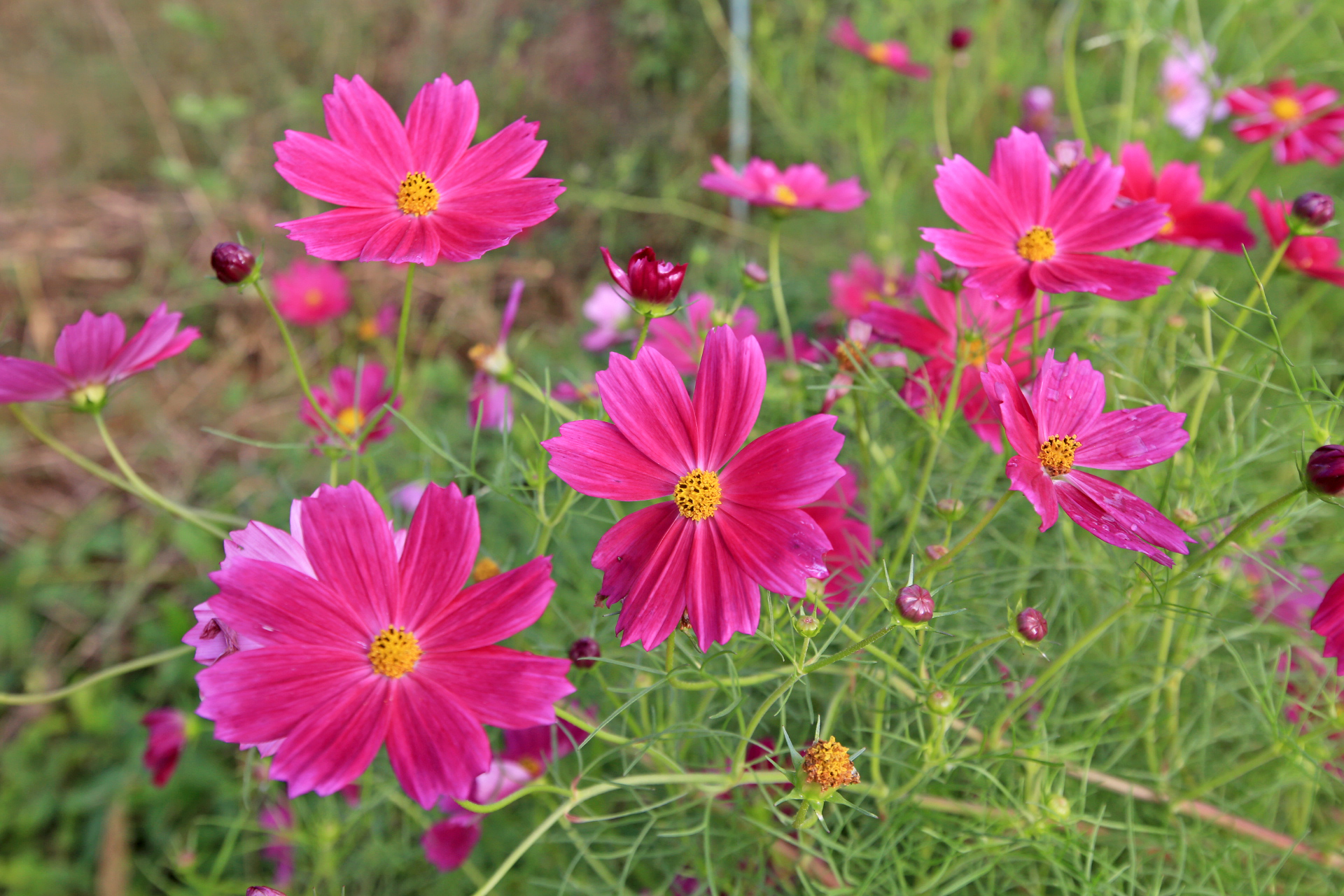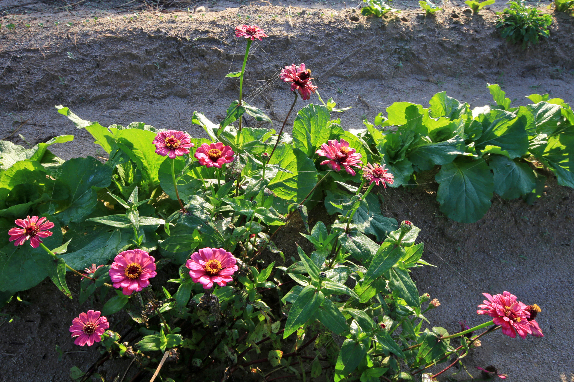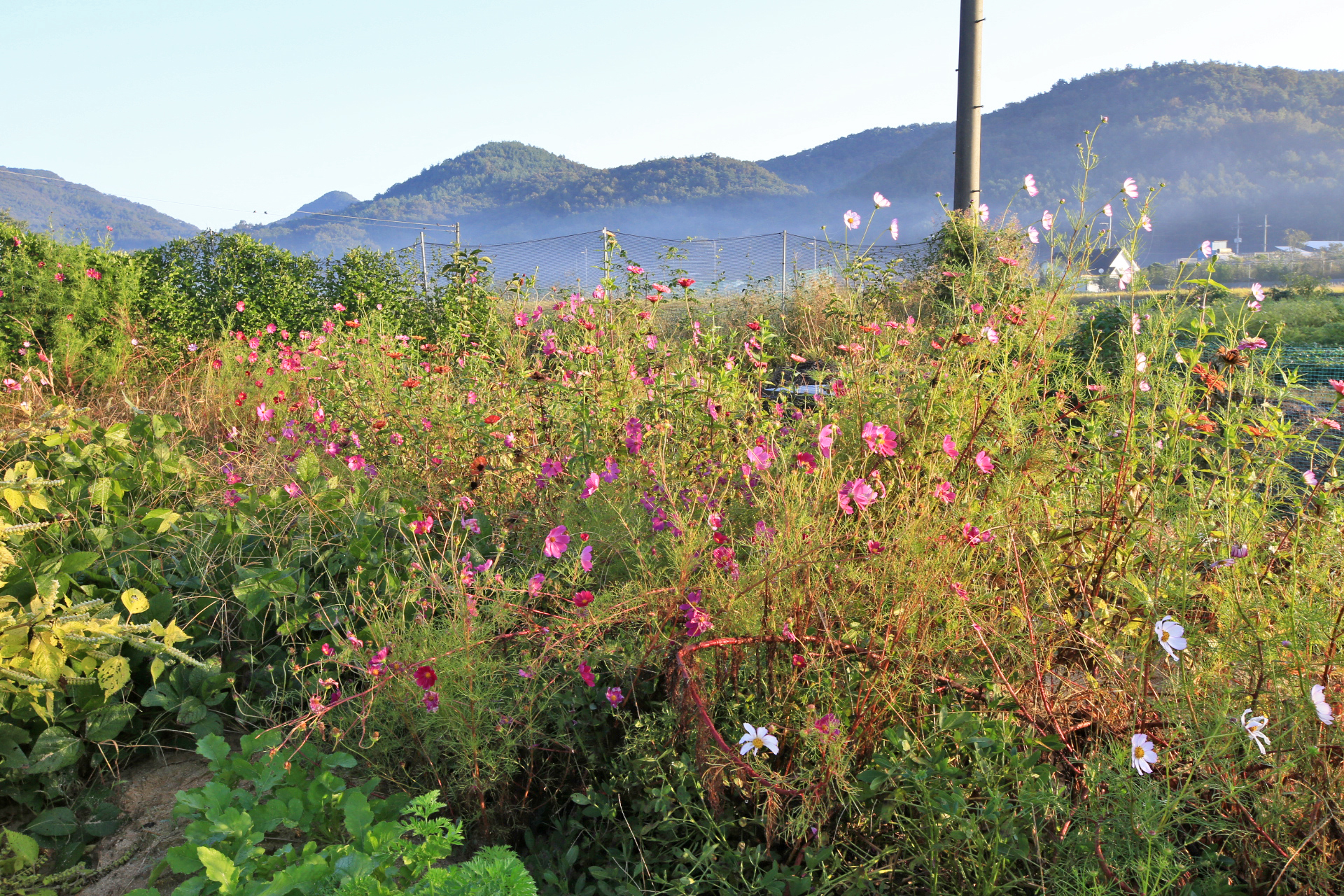 작년 늦가을까지 농사를 짓던 텃밭을 인계하고 대신 그 앞에 있는 밭을 사용하게 되었다. 텃밭과 구분하기 위하여 '앞밭'이라고 부른다. 작년 초겨울에 마늘을 심는 것을 시작으로 올해 이른 봄에 로타리를 친 후 농작물을 재배하기 시작하였다. 앞밭 주변에는 텃밭에 있던 다년생 식물도 옮겨 심고, 빈자리에는 꽃밭에 심고 남은 화초를 옮겨 심거나 꽃씨를 파종하였다. 아내는 앞밭 주변 이외에도 농작물을 재배하려고 만들어 놓은 이랑 한 줄에 백일홍과 코스모스 씨앗을 파종하였다. 울안 꽃밭에 비하여 손길이 덜 가기는 하였지만 샤스타데이지와 꽃양귀비와 금계국과 수례국화가 6월 중순까지 순차적으로 펴서 꽃 대궐을 이루었다. 그러나 6월 말에 아내가 다치는 바람에 제대로 가꾸지 못하여 무성하게 자란 풀밭으로 변하였다. 내가 주말을 이용하여 성북동집에 가더라도 울안 꽃밭 위주로 풀을 뽑았다. 앞밭은 주변 분들도 올해는 농사를 포기하라고 하기에 방치상태로 두었다가 늦여름에서야 손 볼 여유가 생기기 시작하였다. 앞밭의 농작물 주변부터 풀을 제거하기 시작하여 점차 범위를 넓혀 나아갔다. 그렇다고 농작물의 수확량이 정상을 회복한 것은 아니지만 눈으로 보기에는 방치상태는 아니고 돌보는 밭이라고 여겨지는 수준이 되었다. 올해는 울안 꽃밭에 백일홍이 한 포기 뿐이라 아쉬웠는데 앞밭에 심은 백일홍이 한 몫을 단단히 하였다. 군데군데 봉숭아도 어느 해 보다 왕성하게 자라서 꽃이 만발하였다. 요즈음은 코스모스까지 활짝 피어서 울안 꽃밭 못지않다. 아내의 표현대로 앞밭에 백일홍과 코스모스를 심은 것은 신의 한 수였다.