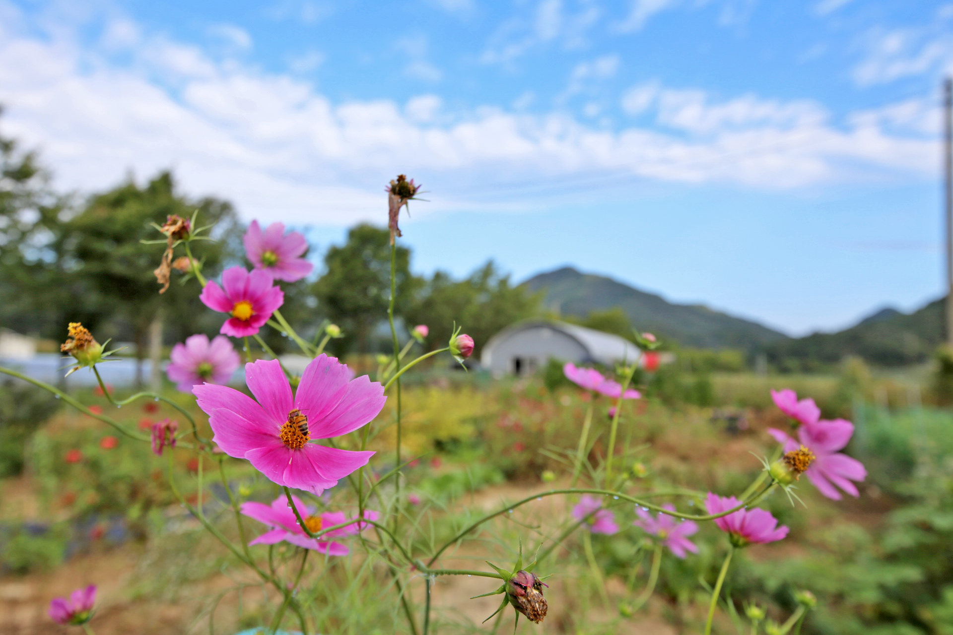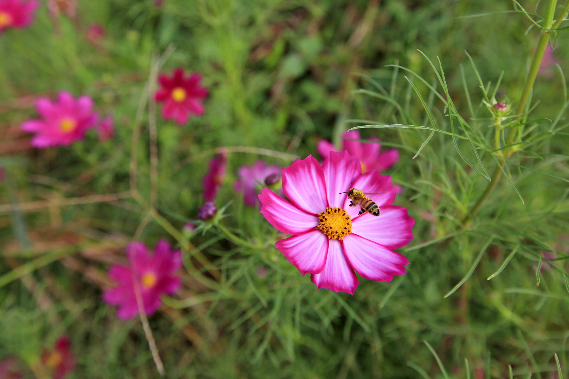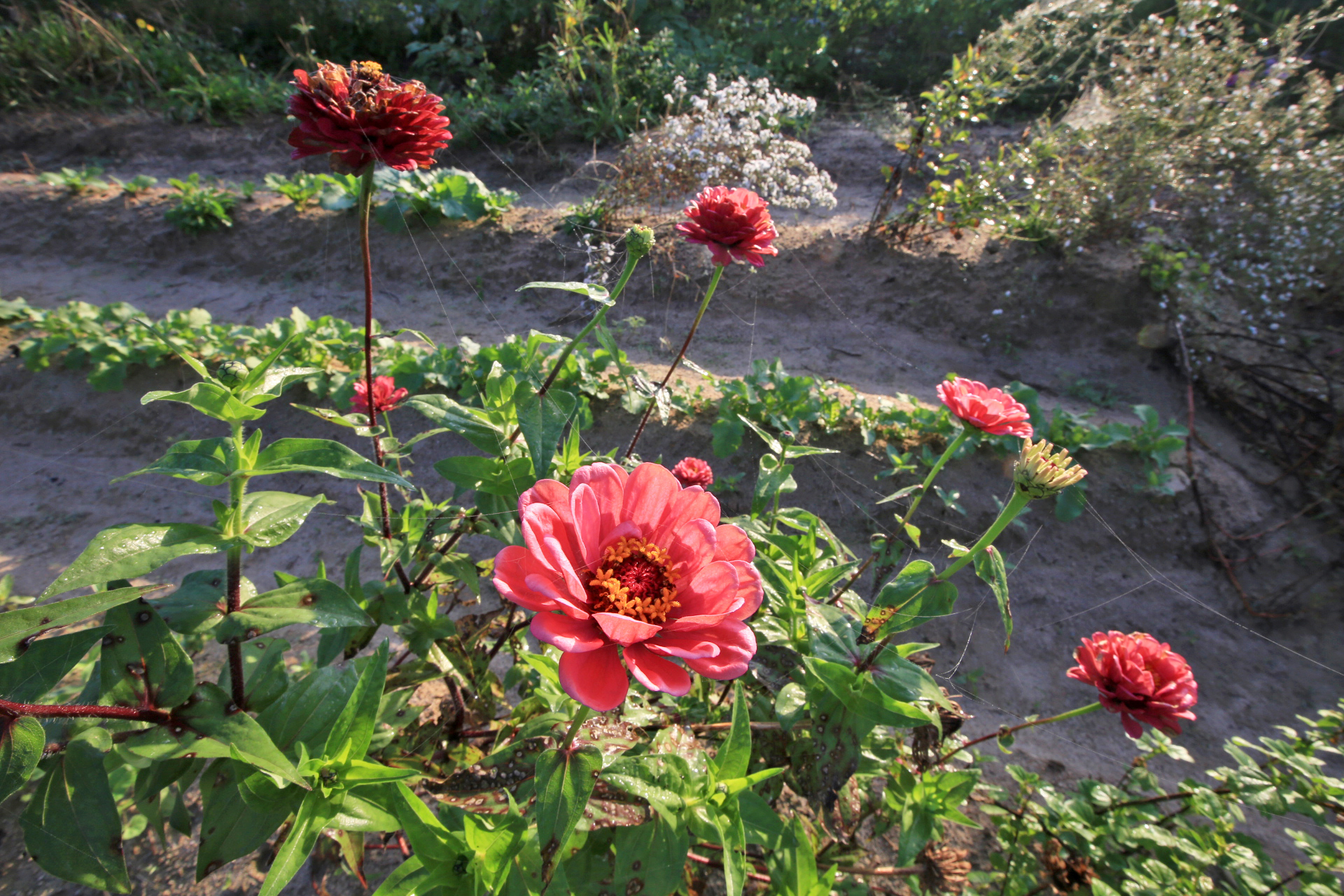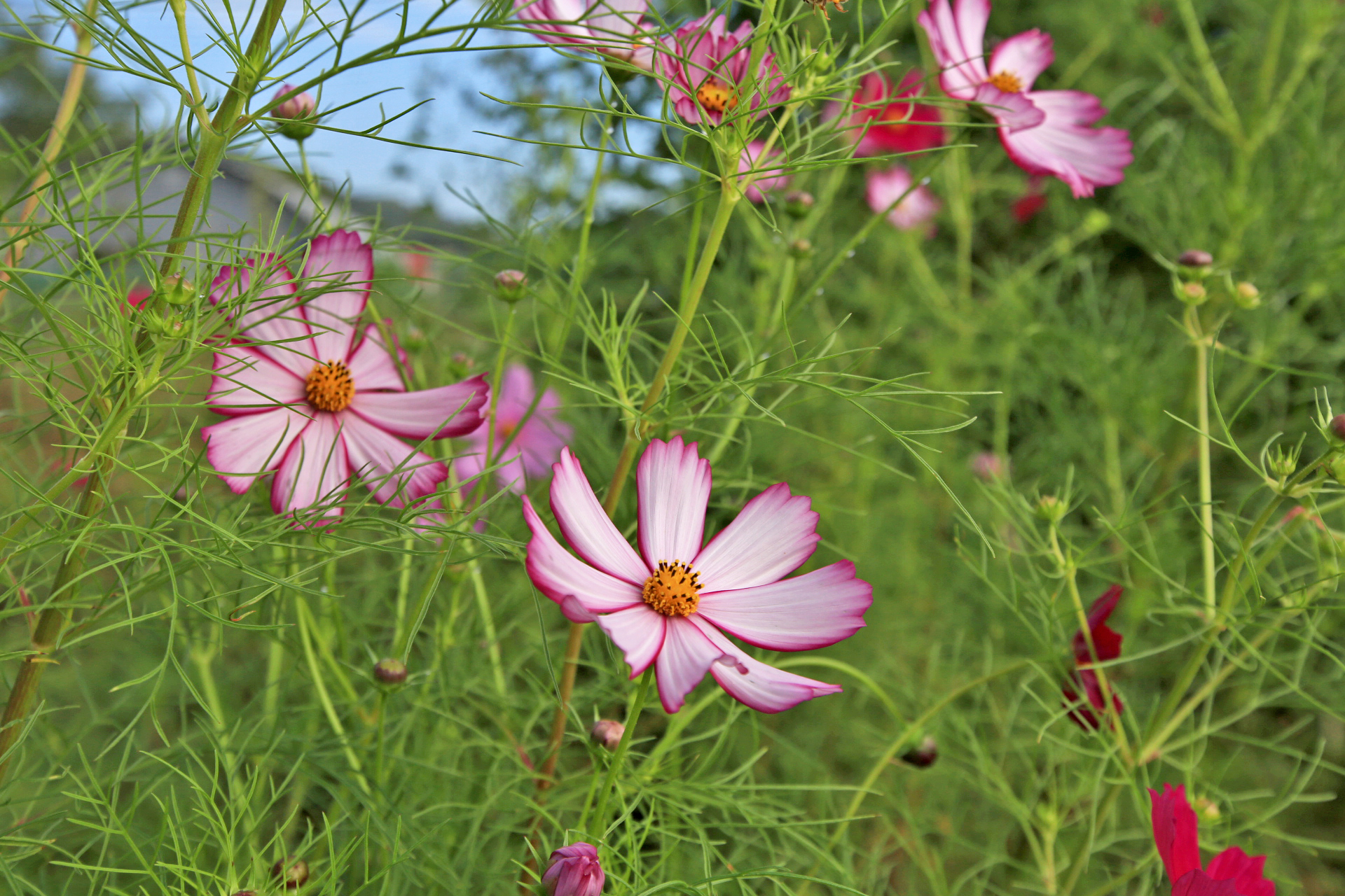 작년 늦가을까지 농사를 짓던 텃밭을 인계하고 대신 그 앞에 있는 밭을 사용하게 되었다. 텃밭과 구분하기 위하여 '앞밭'이라고 부른다. 작년 초겨울에 마늘을 심는 것을 시작으로 올해 이른 봄에 로타리를 친 후 농작물을 재배하기 시작하였다. 앞밭 주변에는 텃밭에 있던 다년생 식물도 옮겨 심고, 빈자리에는 꽃밭에 심고 남은 화초를 옮겨 심거나 꽃씨를 파종하였다. 아내는 앞밭 주변 이외에도 농작물을 재배하려고 만들어 놓은 이랑 한 줄에 백일홍과 코스모스 씨앗을 파종하였다. 울안 꽃밭에 비하여 손길이 덜 가기는 하였지만 샤스타데이지와 꽃양귀비와 금계국과 수례국화가 6월 중순까지 순차적으로 펴서 꽃 대궐을 이루었다. 그러나 6월 말에 아내가 다치는 바람에 제대로 가꾸지 못하여 무성하게 자란 풀밭으로 변하였다. 내가 주말을 이용하여 성북동집에 가더라도 울안 꽃밭 위주로 풀을 뽑았다. 앞밭은 주변 분들도 올해는 농사를 포기하라고 하기에 방치상태로 두었다가 늦여름에서야 손 볼 여유가 생기기 시작하였다. 앞밭의 농작물 주변부터 풀을 제거하기 시작하여 점차 범위를 넓혀 나아갔다. 그렇다고 농작물의 수확량이 정상을 회복한 것은 아니지만 눈으로 보기에는 방치상태는 아니고 돌보는 밭이라고 여겨지는 수준이 되었다. 올해는 울안 꽃밭에 백일홍이 한 포기 뿐이라 아쉬웠는데 앞밭에 심은 백일홍이 한 몫을 단단히 하였다. 군데군데 봉숭아도 어느 해 보다 왕성하게 자라서 꽃이 만발하였다. 요즈음은 코스모스까지 활짝 피어서 울안 꽃밭 못지않다. 아내의 표현대로 앞밭에 백일홍과 코스모스를 심은 것은 신의 한 수였다.