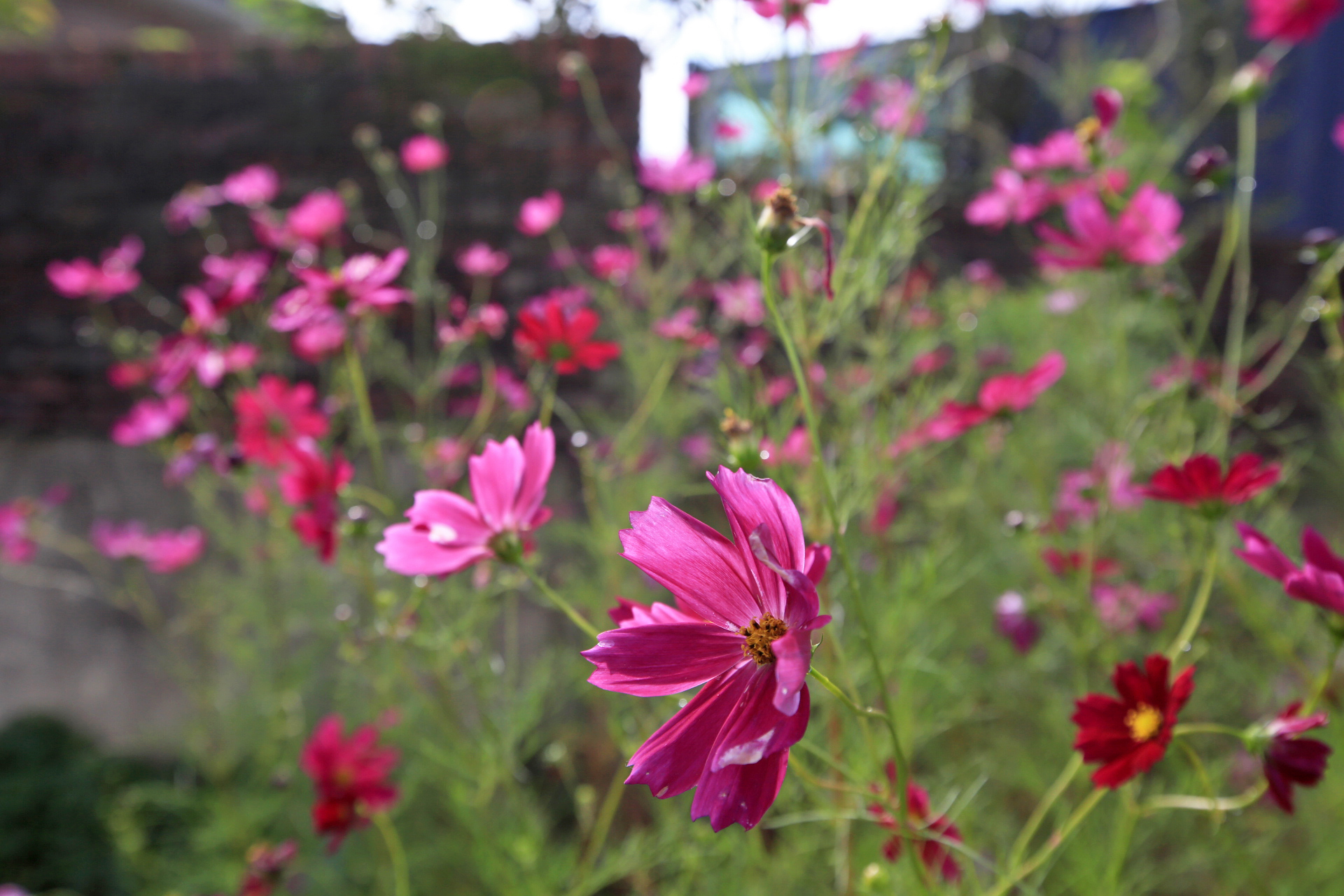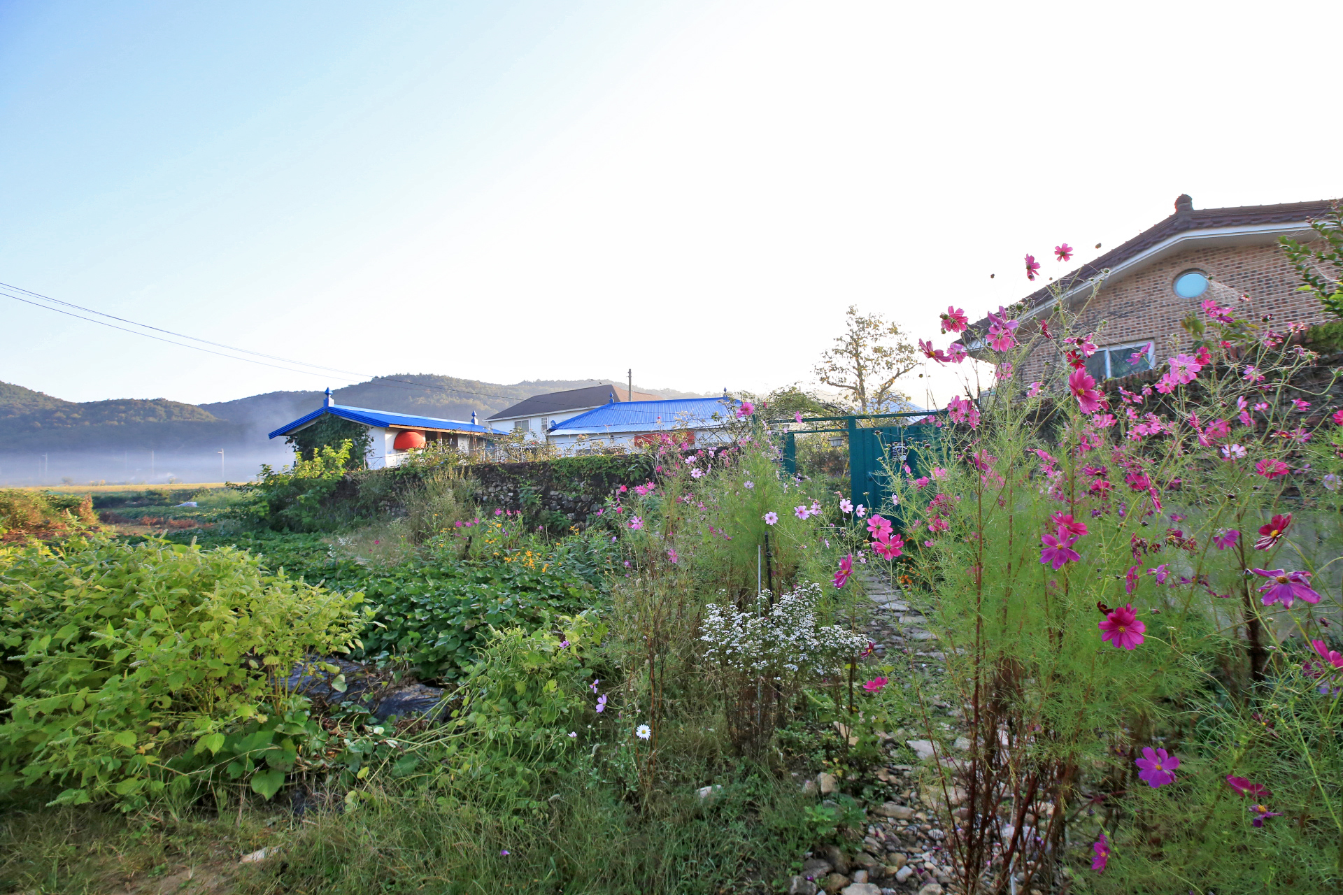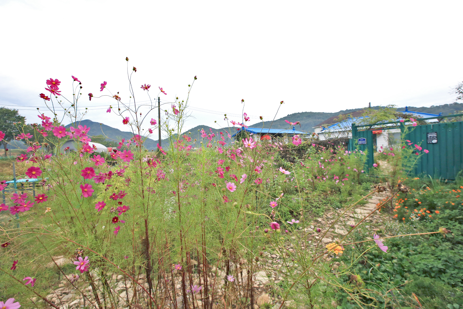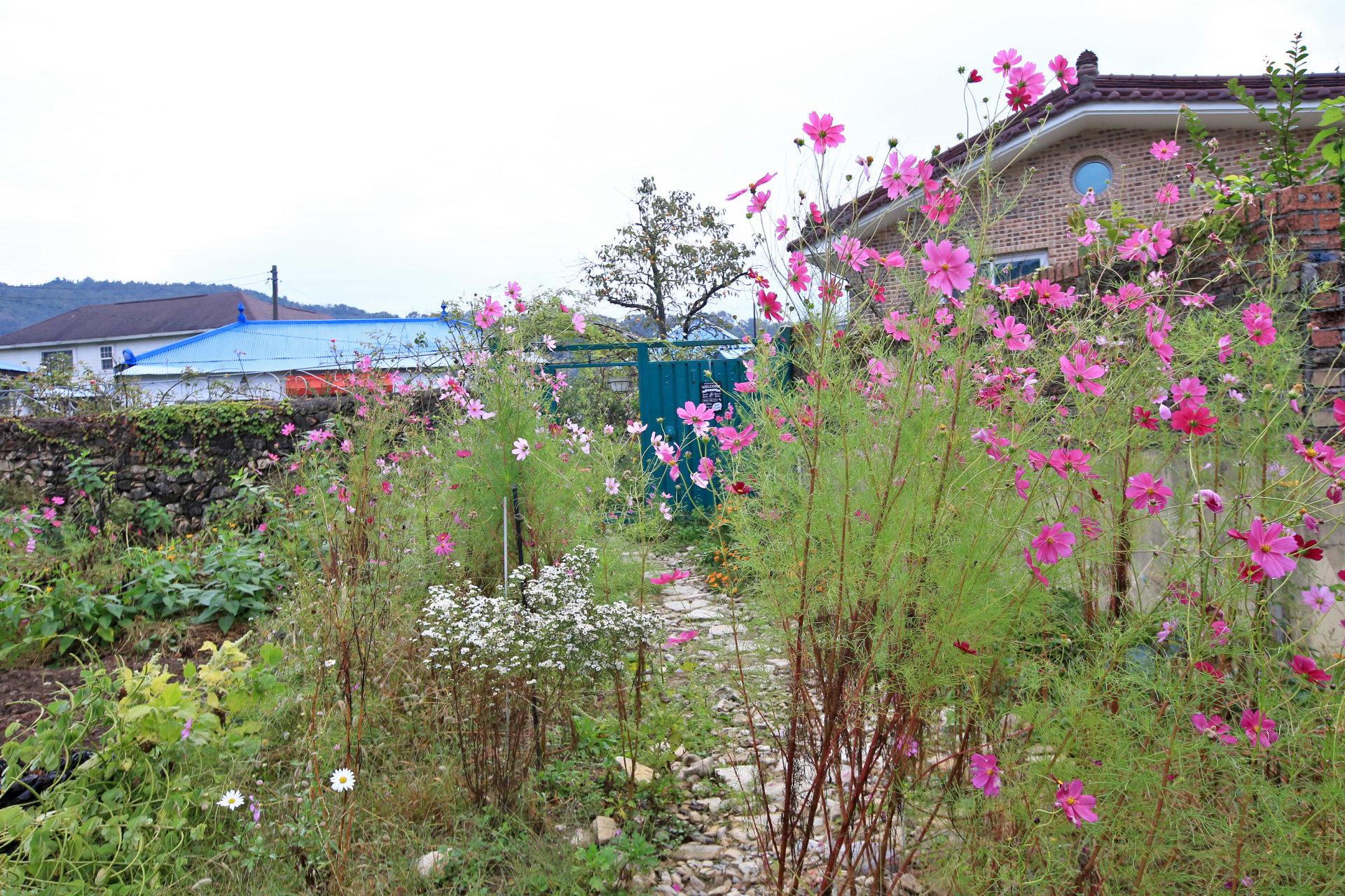 대문 밖 통로에 코스모스가 통행하는데 지장을 주지만 꽃이 피어있는 동안만 불편함을 참으면 되지 않을까? 해서 지지대를 설치하고 약간 기울여서 묶어주었다.