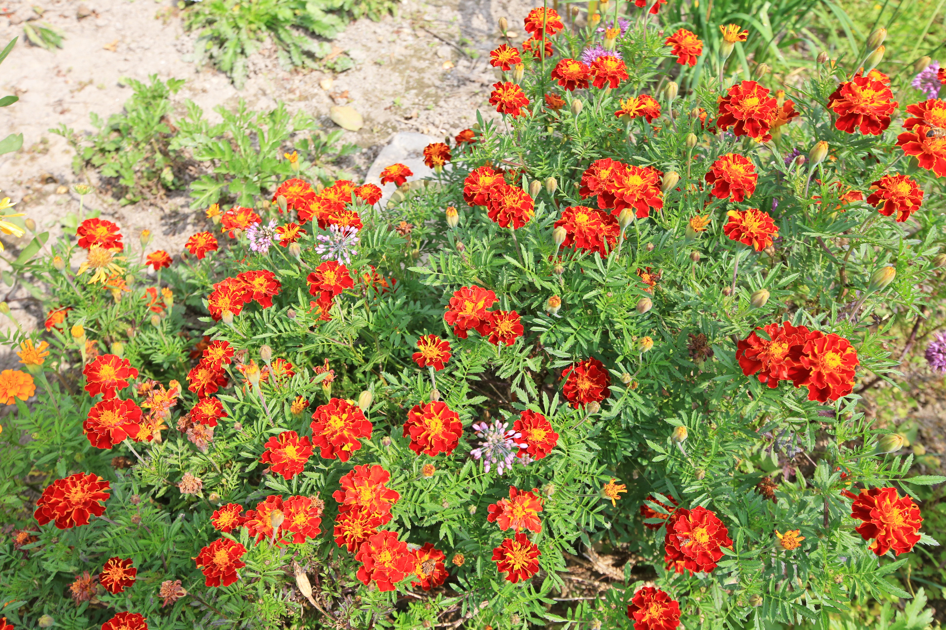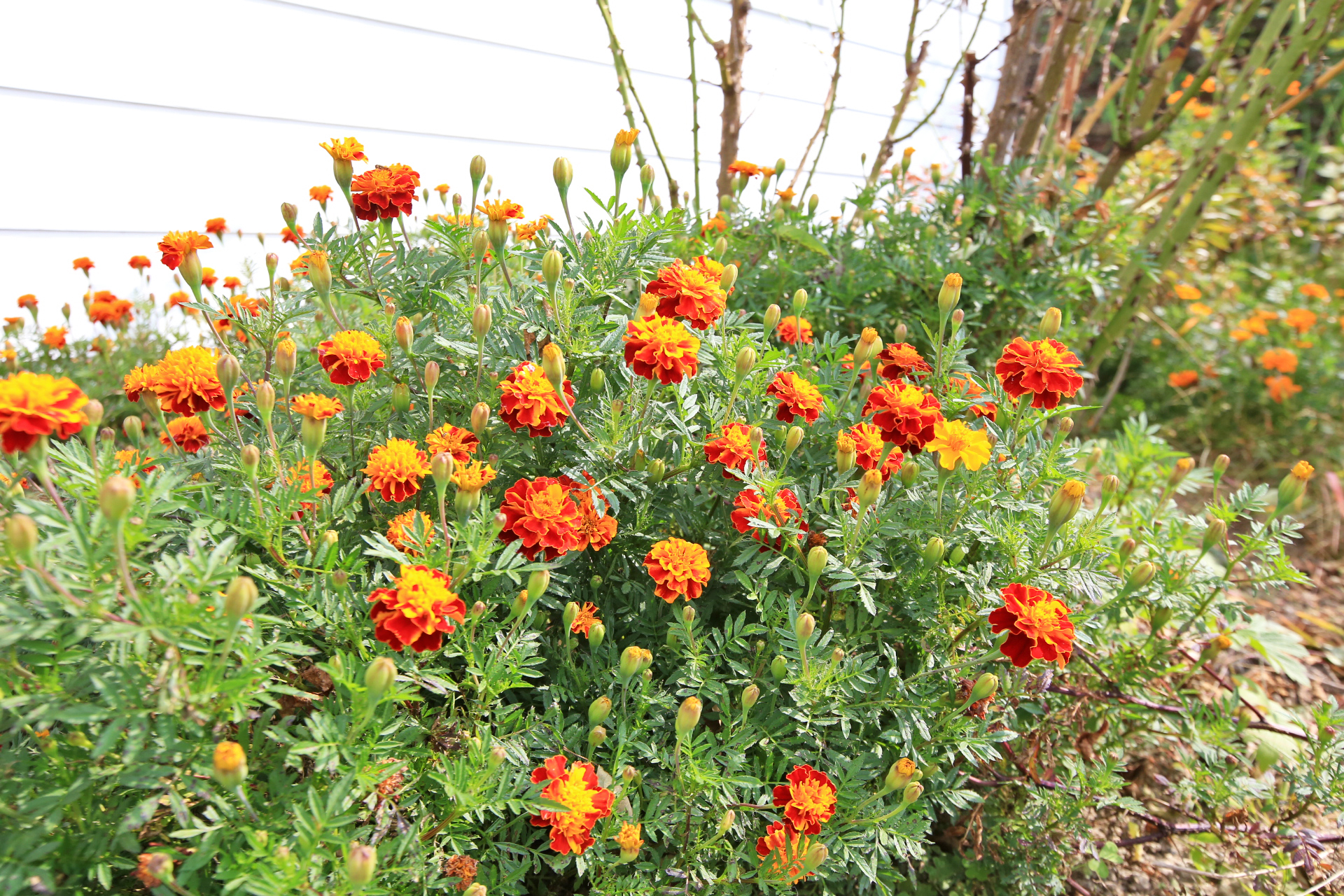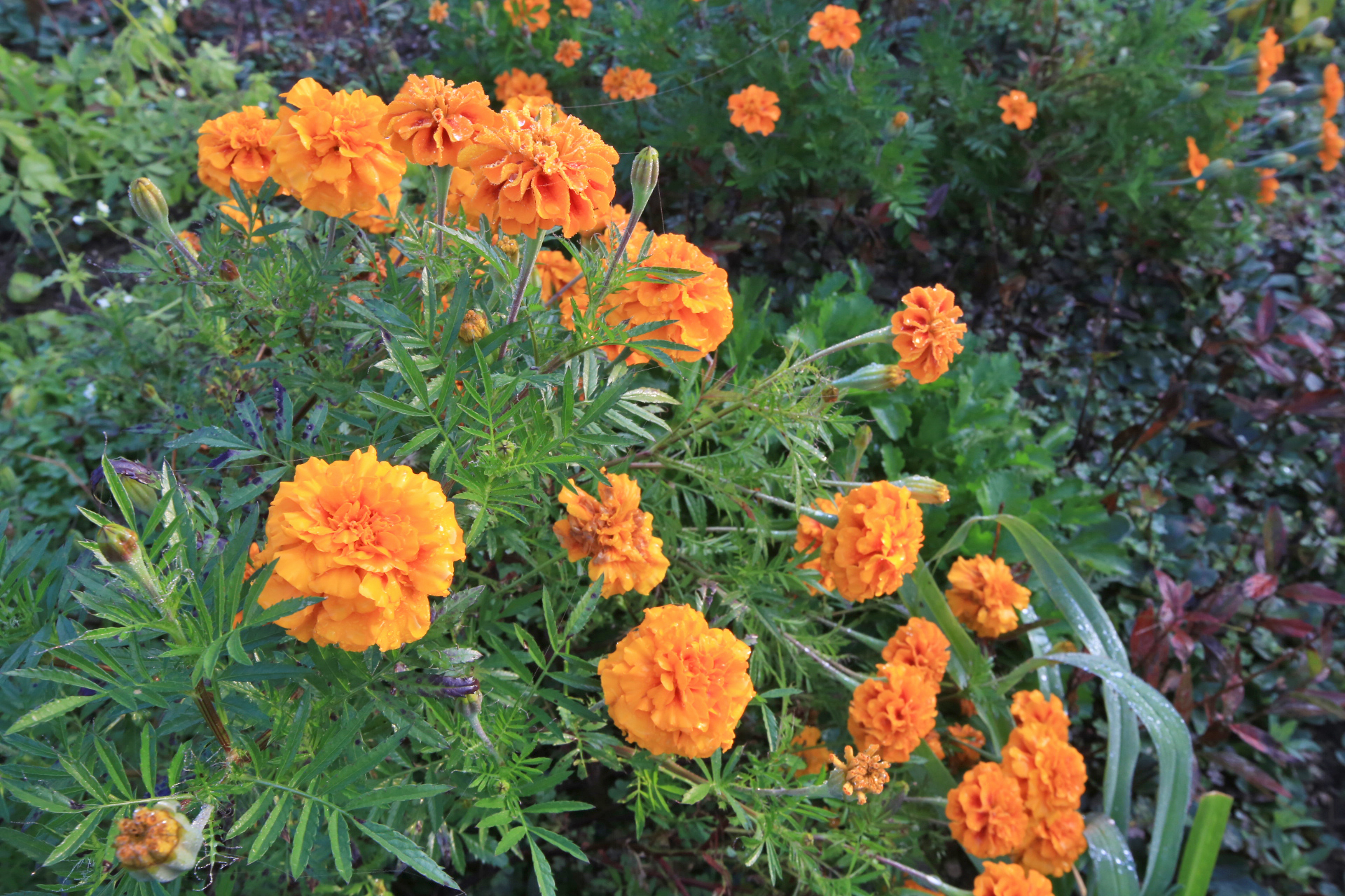 메리골드는 일찍 핀 것은 이미 꽃대가 시들어서 뽑아냈지만 늦게 새싹이 돋아난 것은 이제야 꽃봉오리가 생기는 것도 있다. 시간차를 두고 계속 새로운 꽃이 피어나는 것이 메리골드의 장점이랄까? 요즈음 메리골드가 꽃밭을 돋보이게 하는데 큰 역할을 하고 있다.