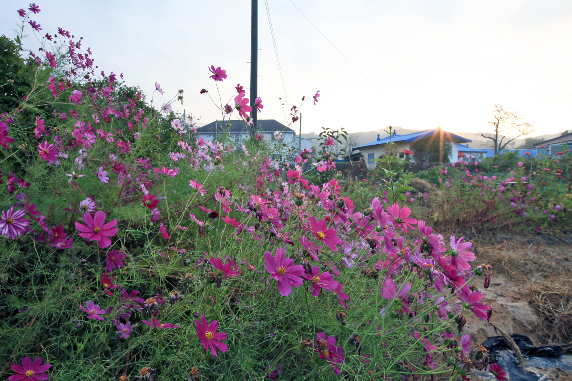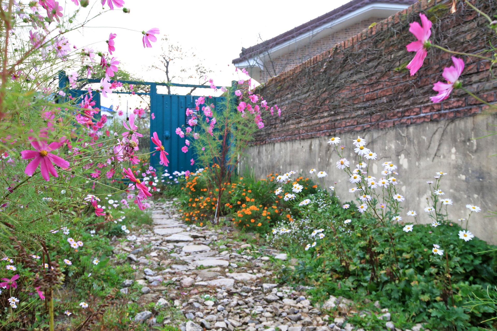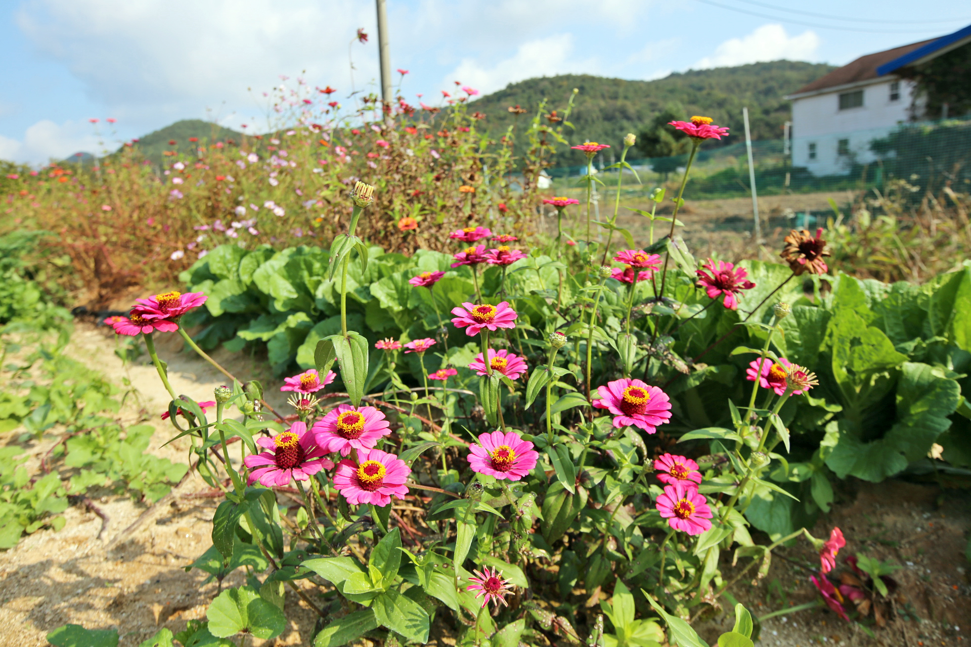앞밭 주변에 꽃씨를 뿌려서 이른 봄에는 샤스타데이지와 꽃양귀비와 수례국화와 금계국이 만발하였고, 여름 이후로는 백일홍과 코스모스가 만발하였다. 아내가 병원치료를 받느라 여름부터는 제대로 가꾸지도 못하였는데 울안 꽃밭보다 앞밭 주변이 더 풍성하게 꽃이 피었다. 특히 앞밭에 자급할 농작물을 모두 심는 대신에 한 이랑에 백일홍 씨앗을 파종한 것은 아내의 말대로 신의 한 수였다.