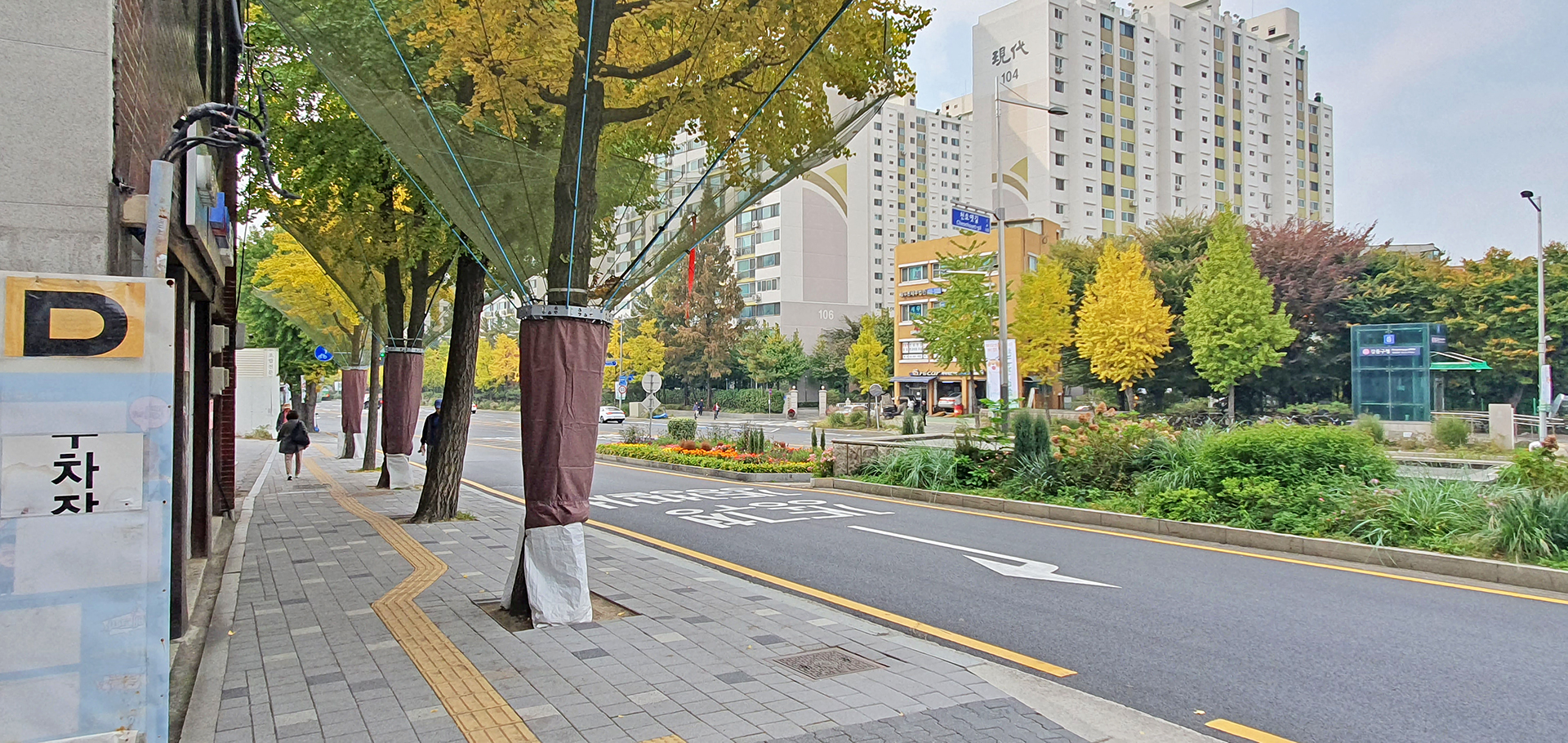 노랗게 단풍이 물든 은행나무 중에서 암나무는 기저귀를 찼다고 해야 할까? 네거리나 전철 역사 주변 등 통행이 많은 곳은 은행이 떨어져 악취를 풍기는 것을 막기 위해서 그물망을 두르고 자루를 2개씩 연결해 놓았다.