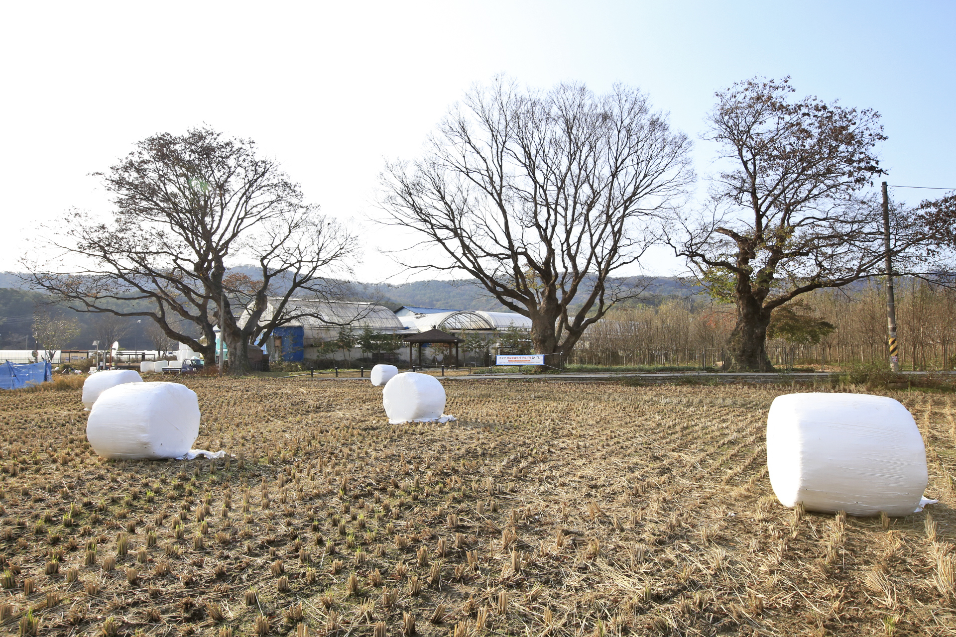 손자 Jun이 성북동집에 왔을 때(20230529) 모내기를 마친 논은 추수가 끝나고 볏짚을 말아놓았다.