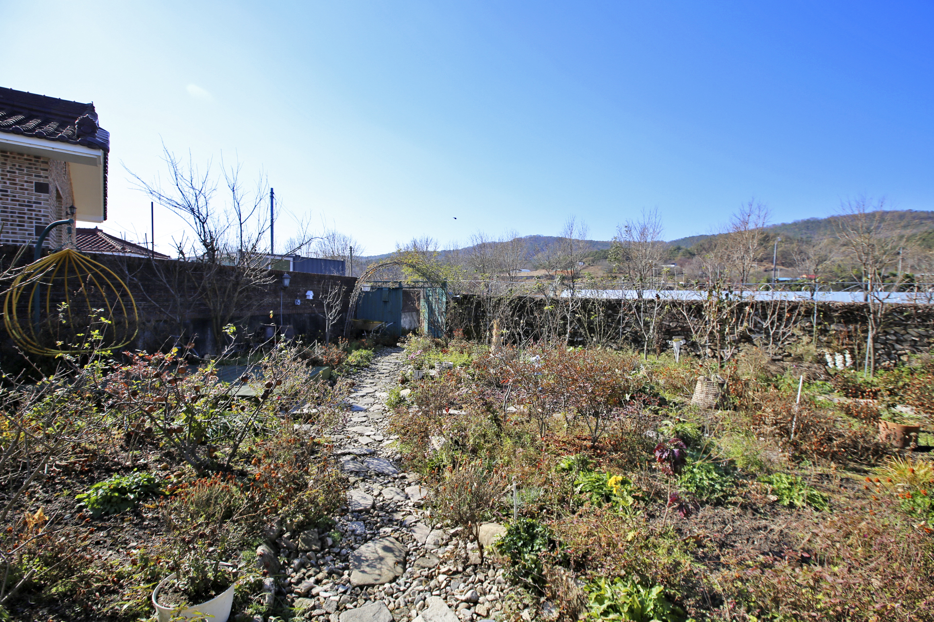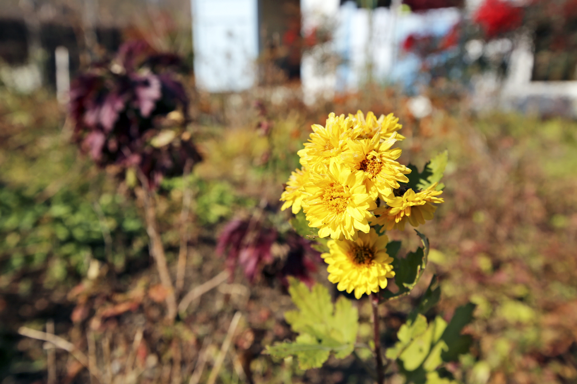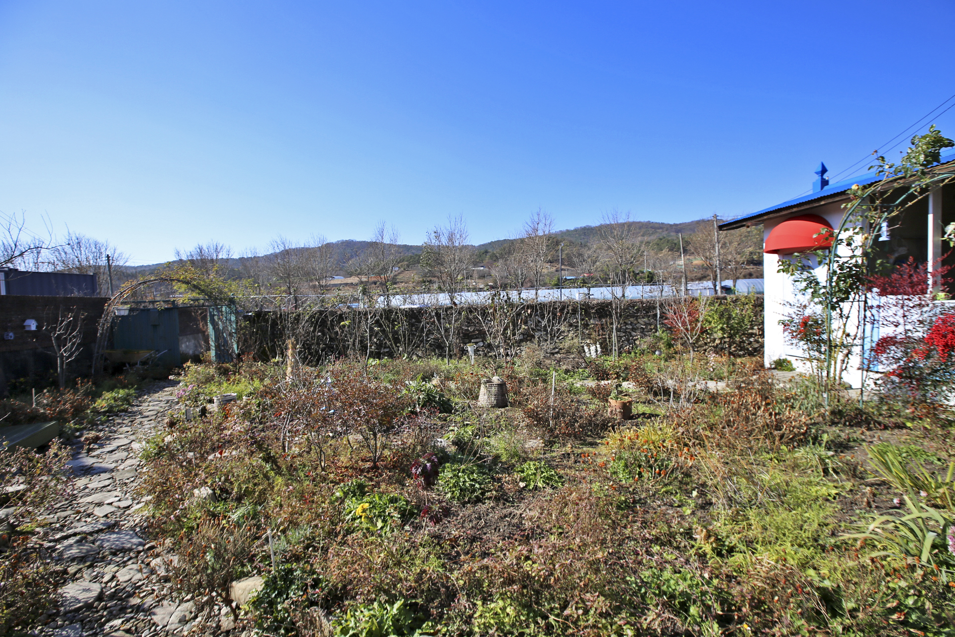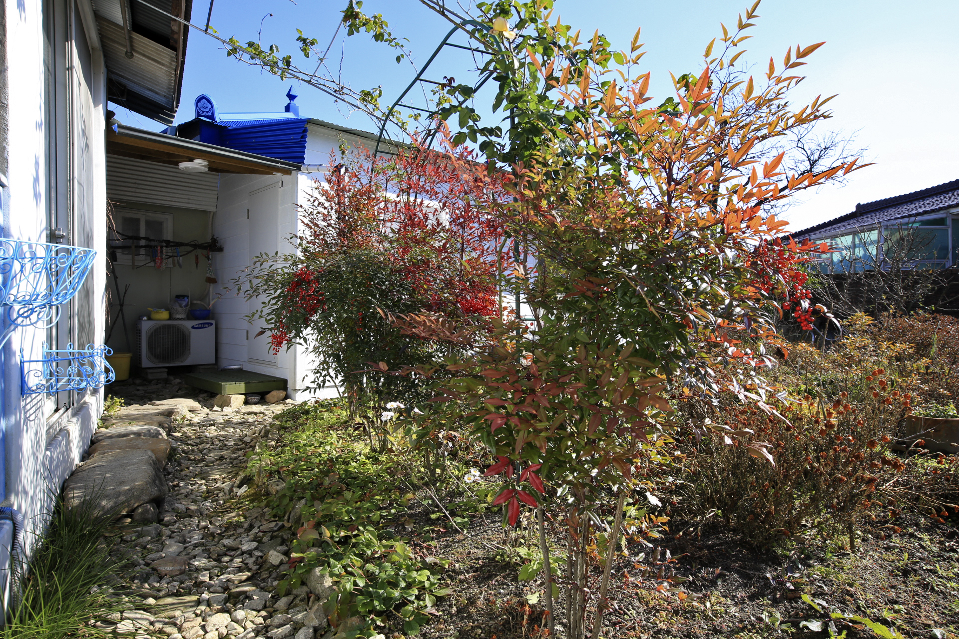 울안 꽃밭에는 시들어가는 국화와 마른 꽃 상태의 메리골드가 남아있다. 패랭이꽃이 몇 송이 남아있기는 하지만 눈에 띄지도 않는다. 얼었다가 녹기를 반복해서 물렁해진 꽃사과와 대부분은 떨어졌지만 명자나무 열매가 조금 남아 있다. 일년생 화초는 서리가 내린 후 사라져가고 있지만 다년생 화초와 겨울을 나야 꽃이 피는 화초가 초록색을 띄고 있다. 가장 눈에 띄는 것은 뭐니 뭐니 해도 남천의 빨간 열매와 단풍이 든 잎사귀이리라.