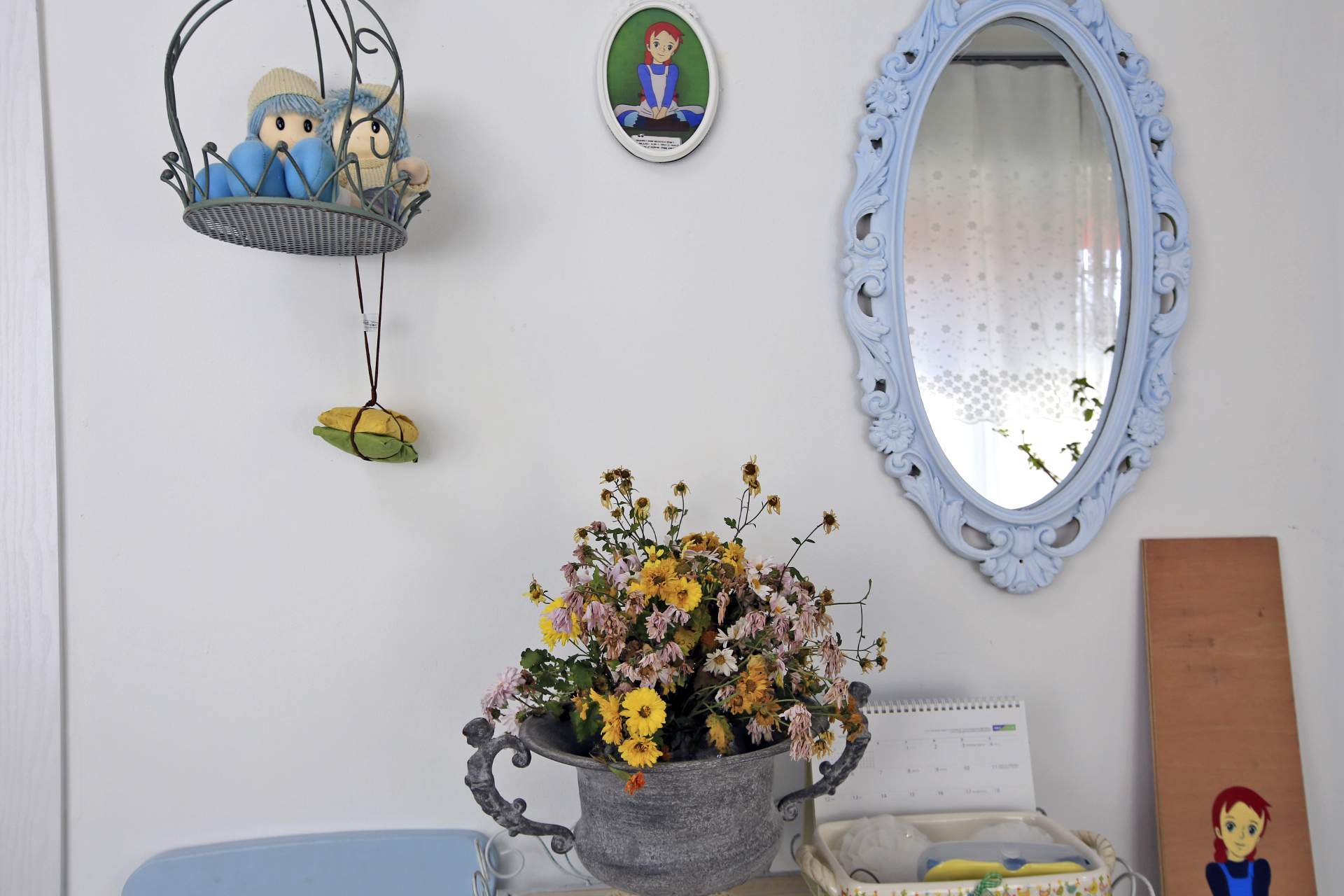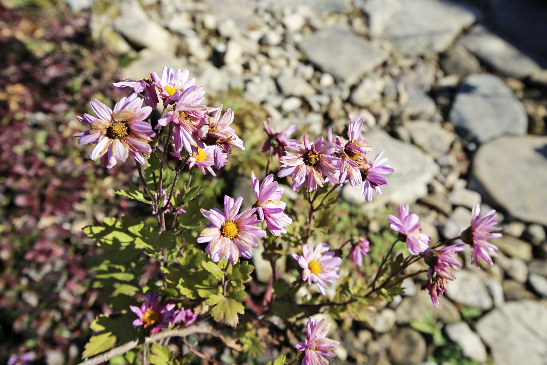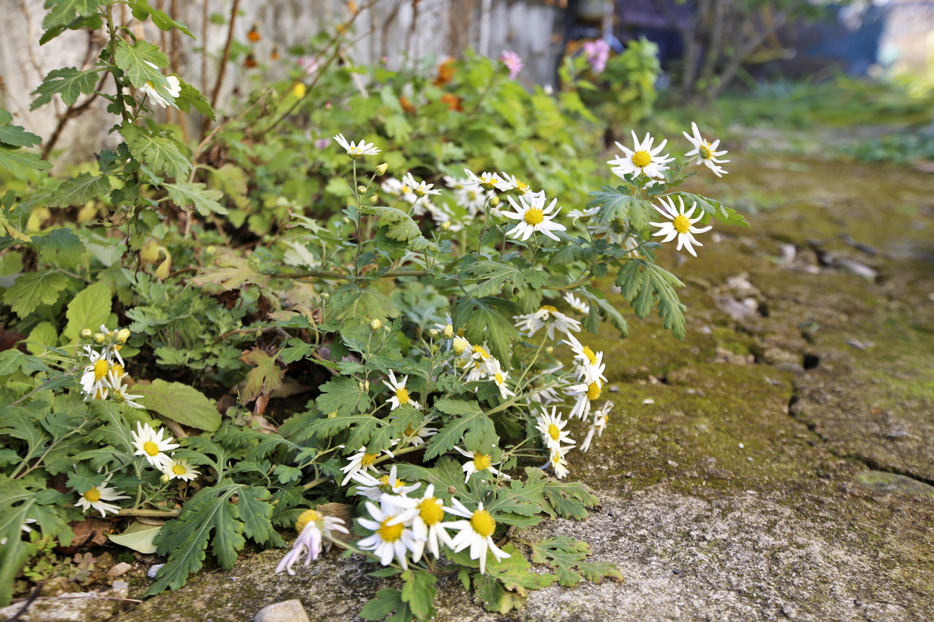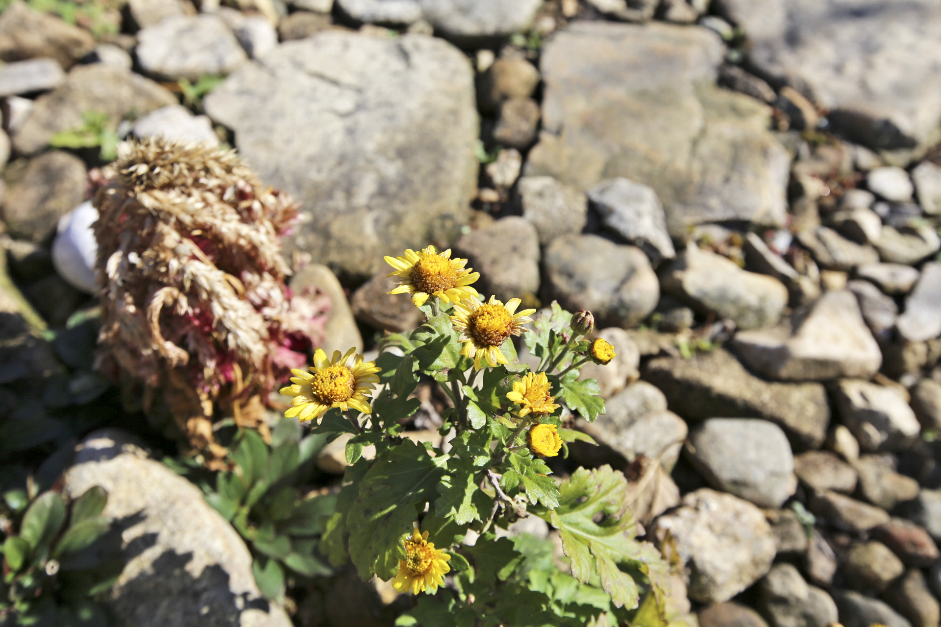 울안 꽃밭에는 시들어가는 국화와 마른 꽃 상태의 메리골드가 남아있다. 패랭이꽃이 몇 송이 남아있기는 하지만 눈에 띄지도 않는다. 얼었다가 녹기를 반복해서 물렁해진 꽃사과와 대부분은 떨어졌지만 명자나무 열매가 조금 남아 있다. 일년생 화초는 서리가 내린 후 사라져가고 있지만 다년생 화초와 겨울을 나야 꽃이 피는 화초가 초록색을 띄고 있다. 가장 눈에 띄는 것은 뭐니 뭐니 해도 남천의 빨간 열매와 단풍이 든 잎사귀이리라.
